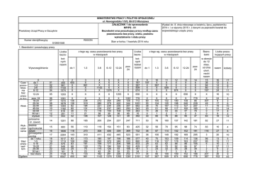 MINISTERSTWO PRACY I POLITYKI SPOŁECZNEJ ul. Nowogrodzka 1/3/5, 00-513 Warszawa ZAŁĄCZNIK 1 do sprawozdania MPiPS - 01 Bezrobotni oraz poszukujący pracy według czasu pozostawania bez pracy, wieku, poziomu wykształcenia i stażu pracy Powiatowy Urząd Pracy w Szczytnie Numer identyfikacyjny REGON Wysłać do 8. dnia roboczego w kwietniu, lipcu, październiku 2014 r. i w styczniu 2015 r. z danymi za poprzedni kwartał do wojewódzkiego urzędu pracy Stan w końcu 1 kwartału 2014 roku 510931548 1. Bezrobotni i poszukujący pracy z tego wg. czasu pozostawania bez pracy w miesiącach Liczba bezrobotnych razem Wyszczególnienie Czas pozostawania bez pracy w m-c z tego wg. czasu pozostawania bez pracy w miesiącach botnych kobiet razem do 1 1-3 3-6 6-12 12-24 do 1 1-3 3-6 6-12 12-24 pow. 24 7 X X X X 8 187 387 509 674 9 187 X X X 10 X 387 X X 11 X X 509 X 12 X X X 674 13 X X X X 0 do 1 1-3 3-6 6-12 01 02 03 04 1 455 961 1143 1374 2 455 X X X 3 X 961 X X 4 X X 1143 X 5 X X X 1374 6 X X X X 12-24 05 pow. 24 18-24 25-34 35-44 Wiek 45-54 55-59 60 lat i wyższe policealne i śr. zawod. Wyk- średnie ształ- ogólnokształ. cenie zasad. gimnazjalne i poniżej do 1 roku 1-5 Staż 5-10 pracy 10-20 ogó20-30 łem 30 lat i bez stażu Ogółem Liczba bezro- Bezrobotni Liczba poszukujących pracy pow. 24 w okresie do 12 mies. od dnia ukoń. nauki razem razem kobiety 14 X X X X 15 36 84 80 167 16 12 14 12 24 17 4 6 7 11 1293 X X X X 1293 X 656 X X X X 656 X X 16 10 06 07 08 09 10 11 12 13 1281 1372 1878 1264 1182 610 201 553 X 136 136 82 60 30 11 42 X 234 319 184 131 72 21 106 X 272 280 221 216 116 38 107 X 354 379 234 237 140 30 128 X 248 420 236 245 108 36 121 1281 128 344 307 293 144 65 49 778 712 1001 662 543 263 10 392 X 60 55 38 20 14 0 30 X 105 134 70 51 26 1 66 X 132 135 107 90 43 2 76 X 190 198 113 117 55 1 88 X 139 240 127 100 47 3 95 778 86 239 207 165 78 3 37 X 307 49 11 0 0 0 83 24 8 17 19 31 17 9 18 5 3 6 10 14 8 2 12 14 1201 98 165 200 254 237 247 711 53 78 100 157 142 181 82 27 11 15 683 56 110 119 154 151 93 425 32 56 70 95 98 74 83 10 4 16 1806 116 270 306 406 339 369 732 36 87 114 152 152 191 116 27 6 17 2264 143 310 411 432 445 523 931 36 100 149 182 169 295 3 20 10 18 19 20 21 22 23 24 25 1017 1713 975 948 544 161 1149 6507 83 108 83 68 29 9 75 455 173 266 161 130 75 23 133 961 180 290 159 175 115 42 182 1143 197 370 177 194 126 29 281 1374 198 346 206 189 93 35 226 1293 186 333 189 192 106 23 252 1281 577 860 433 409 161 34 717 3191 40 49 29 27 3 5 34 187 75 116 63 38 24 5 66 387 103 127 62 70 32 7 108 509 109 178 88 92 35 3 169 674 114 183 86 85 28 8 152 656 136 207 105 97 39 6 188 778 56 95 6 1 2 0 207 367 13 15 10 27 9 2 26 102 5 11 5 11 2 0 9 43 2. Bezrobotni będący w szczególnej sytuacji na rynku pracy 2.1 Ogółem z rubryki 1 26 27 28 29 30 31 32 33 34 35 36 37 Liczba bezrobotnych będących w szczególnej sytuacji na rynku pracy 1 392 839 1033 1256 1293 1281 1372 1605 1148 1158 610 201 38 395 62 270 25 X 147 X 47 0 25 0 39 1025 244 699 263 82 278 X 140 7 85 0 40 604 280 383 49 148 240 X 79 1 31 0 41 1806 385 1032 434 96 246 1806 214 41 125 0 42 2264 401 1411 661 1157 648 2264 351 102 146 0 43 44 45 46 47 48 49 963 1569 852 869 532 160 1149 334 375 14 X X X 649 627 1025 544 547 289 81 682 73 136 156 406 445 156 60 291 325 145 146 65 20 491 410 X X X X X 1149 550 1081 617 658 383 105 676 150 262 129 77 21 0 192 28 40 18 31 6 0 28 42 83 56 83 71 26 51 0 0 0 0 0 0 0 50 6094 1372 3795 1432 1483 1559 4070 831 151 412 0 Wyszczególnienie Czas pozostawania bez pracy w m-c Wiek 0 do 1 1-3 3-6 6-12 12-24 pow. 24 18-24 25-34 35-44 45-54 55-59 60 lat i więcej wyższe Wykształcenie Staż pracy ogółem Ogółem policealne i średnie zawod. średnie ogólnokształcące zasadnicze zawod. gimnazjalne i poniżej do 1 roku 1-5 5-10 10-20 20-30 30 lat i więcej bez stażu długotrwale pow. 50 roku życia bez kwalifikacji zawodowych bez doświadczenia zawodowego 2 136 234 272 354 248 128 1372 X X X X X 3 110 223 397 491 1293 1281 642 1111 764 765 377 136 4 69 168 271 304 280 340 X X X X X X 5 97 197 231 289 324 345 457 330 231 281 134 50 6 104 206 259 363 304 323 803 492 129 90 38 7 7 259 580 717 838 784 892 786 912 842 921 450 159 samotnie wychowujący conajmniej jedno dziecko do 18 r. 8 54 108 111 174 173 211 160 331 221 99 19 1 do 25 roku życia bez wykształcenia średniego którzy po odbyciu kary pozbawienia wolności nie podjęli zatrud9 15 24 30 33 30 19 10 31 31 52 23 4 niepełnosprawni po zakończeniu realizacji kontraktu socjalnego 10 30 68 66 80 88 80 31 70 77 124 88 22 11 0 0 0 0 0 0 0 0 0 0 0 0 2.2 Kobiety z rubryki 1 pow. 50 roku życia bez kwalifikacji zawodowych bez doświadczenia zawodowego bez wykształcenia średniego samotnie wychowujące conajmniej jedno dziecko do 18 r. życia 3 61 117 216 288 656 778 385 684 467 390 182 8 206 4 23 58 95 116 102 156 X X X X X X 13 5 35 83 105 161 169 219 242 172 122 151 79 6 X 6 45 102 158 213 198 237 451 322 99 58 22 1 108 7 72 187 263 334 321 486 350 386 385 369 166 7 X 8 36 76 74 128 123 188 147 248 153 66 11 0 42 które po odbyciu kary pozbawienia wolności nie podjęły zatrudnienia 9 0 1 1 1 0 3 0 1 2 2 1 0 0 137 467 139 53 187 X 112 394 175 263 32 108 156 X 66 732 188 493 126 55 146 67 931 162 687 240 556 do 1 roku 68 550 165 413 34 Liczba bezrobotnych kobiet będących w szczególnej sytuacji na rynku pracy razem do 25 roku życia długotrwale 51 52 53 54 55 56 57 58 59 60 61 62 63 1 155 338 448 609 656 778 712 867 606 526 263 10 293 2 60 105 132 190 139 86 712 X X X X X 50 64 634 średnie ogólnokształcące 65 zasadnicze zawod. gimnazjalne i poniżej Wyszczególnienie Czas pozostawania bez pracy w m-c Wiek Wykształcenie 0 do 1 1-3 3-6 6-12 12-24 pow. 24 18-24 25-34 35-44 45-54 55-59 60 lat i więcej wyższe policealne i średnie zawod. które nie podjęły zatrudnienia po ur. dziecka po zakończeniu realizacji kontraktu socjalnego 10 16 27 30 33 39 38 18 27 39 63 35 1 15 11 37 74 107 146 179 330 172 393 196 100 11 1 68 1