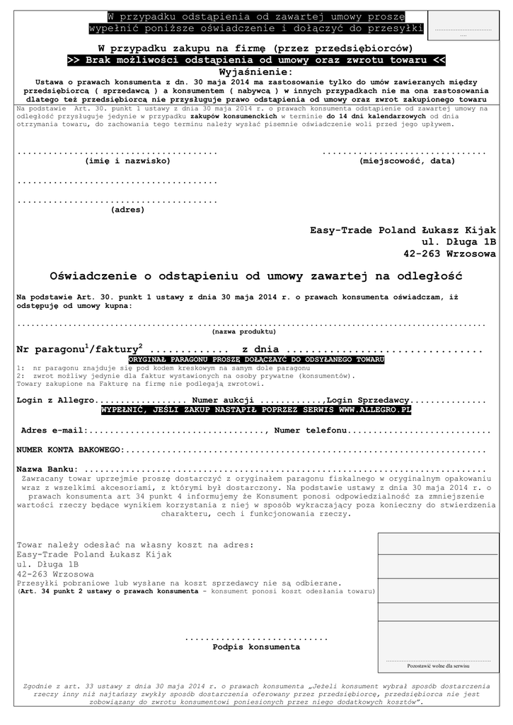 W przypadku odstąpienia od zawartej umowy proszę wypełnić poniższe oświadczenie i dołączyć do przesyłki …………………………… …. Pozostawić wolne dla serwisu W przypadku zakupu na firmę (przez przedsiębiorców) >> Brak możliwości odstąpienia od umowy oraz zwrotu towaru << Wyjaśnienie: Ustawa o prawach konsumenta z dn. 30 maja 2014 ma zastosowanie tylko do umów zawieranych między przedsiębiorcą ( sprzedawcą ) a konsumentem ( nabywcą ) w innych przypadkach nie ma ona zastosowania dlatego też przedsiębiorcą nie przysługuje prawo odstąpienia od umowy oraz zwrot zakupionego towaru Na podstawie Art. 30. punkt 1 ustawy z dnia 30 maja 2014 r. o prawach konsumenta odstąpienie od zawartej umowy na odległość przysługuje jedynie w przypadku zakupów konsumenckich w terminie do 14 dni kalendarzowych od dnia otrzymania towaru, do zachowania tego terminu należy wysłać pisemnie oświadczenie woli przed jego upływem. ....................................... (imię i nazwisko) ................................ (miejscowość, data) ....................................... ....................................... (adres) Easy-Trade Poland Łukasz Kijak ul. Długa 1B 42-263 Wrzosowa Oświadczenie o odstąpieniu od umowy zawartej na odległość Na podstawie Art. 30. punkt 1 ustawy z dnia 30 maja 2014 r. o prawach konsumenta oświadczam, iż odstępuję od umowy kupna: ..................................................................................................... (nazwa produktu) Nr paragonu1/faktury2 ............. z dnia ................................ ORYGINAŁ PARAGONU PROSZĘ DOŁĄCZAYĆ DO ODSYŁANEGO TOWARU 1: nr paragonu znajduje się pod kodem kreskowym na samym dole paragonu 2: zwrot możliwy jedynie dla faktur wystawionych na osoby prywatne (konsumentów). Towary zakupione na Fakturę na firmę nie podlegają zwrotowi. Login z Allegro.................. Numer aukcji ............,Login Sprzedawcy............... WYPEŁNIĆ, JEŚLI ZAKUP NASTĄPIŁ POPRZEZ SERWIS WWW.ALLEGRO.PL Adres e-mail:.................................., Numer telefonu............................ NUMER KONTA BAKOWEGO:...................................................................... Nazwa Banku: .............................................................................. Zawracany towar uprzejmie proszę dostarczyć z oryginałem paragonu fiskalnego w oryginalnym opakowaniu wraz z wszelkimi akcesoriami, z którymi był dostarczony. Na podstawie ustawy z dnia 30 maja 2014 r. o prawach konsumenta art 34 punkt 4 informujemy że Konsument ponosi odpowiedzialność za zmniejszenie wartości rzeczy będące wynikiem korzystania z niej w sposób wykraczający poza konieczny do stwierdzenia charakteru, cech i funkcjonowania rzeczy. Towar należy odesłać na własny koszt na adres: Easy-Trade Poland Łukasz Kijak ul. Długa 1B 42-263 Wrzosowa Przesyłki pobraniowe lub wysłane na koszt sprzedawcy nie są odbierane. (Art. 34 punkt 2 ustawy o prawach konsumenta - konsument ponosi koszt odesłania towaru) ............................ Podpis konsumenta ……………………………………………………. Pozostawić wolne dla serwisu Zgodnie z art. 33 ustawy z dnia 30 maja 2014 r. o prawach konsumenta „Jeżeli konsument wybrał sposób dostarczenia rzeczy inny niż najtańszy zwykły sposób dostarczenia oferowany przez przedsiębiorcę, przedsiębiorca nie jest zobowiązany do zwrotu konsumentowi poniesionych przez niego dodatkowych kosztów”.
