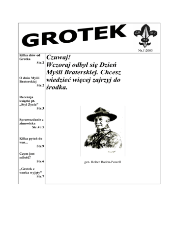 Nr.1\2003 Kilka słów od Grotka Str.2 Czuwaj! Wczoraj odbył się Dzień Myśli Braterskiej. Chcesz O dniu Myśli wiedzieć więcej zajrzyj do Braterskiej Str.2 środka. Recenzja książki pt. „Styl Życia” Str.3 Sprawozdanie z zimowiska Str.4 i 5 Kilka pytań do was... Str.9 Czym jest miłość? Str.6 „Grotek z worka wyjęty” Str.7 gen. Rober Baden-Powell Czuwaj harcerze! Czuj zuchy! Jak tam wasze samopoczucie po feriach, pewnie zrzedły wam miny, gdy skończyły się ferie i czas był wyruszać do szkoły, ale nie martwcie się już za 119 wakacje. Tym czasem mamy 22 lutego to bardzo ważny dzień dla harcerzy jak i zuchów (chcecie wiedzieć więcej czytajcie tekst poniżej). W tym numerze pierwszy w historii Grotka konkurs zapraszam do udziału. Wasz Grotek. O dniu Myśli Braterskiej (22.II.) To data bardzo ważnego wydarzenia. Jest to dzień Myśli Braterskiej. No tak teraz możemy zadać sobie pytanie, po co? I na co? Nam taki dzień. Otóż jest to dzień, w którym wszyscy harcerze z całego świata łączą się w myśli, spotykają się i przypominają sobie o bardzo ważnym człowieku, o którym każdy harcerz bez wyjątku nawet zuch powinni wiedzieć. Jest to gen. Robert Baden Powell to człowiek, dzięki któremu jesteśmy w takiej organizacji jak ZHP. W prawdzie w Polsce założycielem harcerstwa był Andrzej Małkowski, ale skądś to musiało się wywieść. W naszym szczepie ten szczególny dzień odbędzie się w niedzielę 23 lutego. Na który zostały zaproszone wszystkie drużyny naszego środowiska bez wyjątku. Szczegółowe sprawozdanie z tego dnia znajdziecie w następnym numerze Grotka. dh. Jacek Połonecki 2 „Styl życia”- Dla każdego? Jeżeli ktoś z was czuję się na siłach, aby przeczytać tę książkę to jest to dobry moment. Ja bardzo długo zwlekałam z przeczytanie tej książki. Nie zamierzam jej zachwalać lub negować. Każdy musi sam dojść do tego czy ta książka coś mu daje. Wszystko zależy od człowieka. Do niedawna miałam zawężone pole widzenia na harcerstwo. Dzięki tej książce przejrzałam na oczy. Wiem, że to brzmi bardzo tragicznie, ale tak było. Miałam wrażenie, że ZHP było poza polityką, że komunizm nigdy nie ingerował w naszą pracę. Prawda jest inna. Podoba mi się stwierdzenie, że powinniśmy spłacić dług, jaki zaciągnęliśmy w harcerstwie. Ono daje nam uśmiech, radość, zaradności przyjaźń. Jednym słowem wszystko. My nie potrafimy się odwdzięczyć. Powinniśmy stale się rozwijać, żeby kiedyś móc objąć funkcję instruktorską i spłacić tak hojny dar. Jeżeli chcecie dowiedzieć się więcej o ZHP i chcecie zrozumieć kilka bardzo istotnych spraw to przeczytajcie i skorzystajcie ze „Stylu życia” dh. Marlen 3 Czytając ten artykuł osoby, które nie były razem z szczepem na zimowisku mogą się dowiedzieć, co się tam działo, a harcerze i zuchy będące na wyjeździe będą mogły sobie przypomnieć. Ferie zimowe nasz szczep spędził na zimowisko w miasteczku o nazwie Kamienica, która znajdowała się w pięknych górach o nazwie Gorce. Na wyjeździe oprócz naszego szczepu („Werdpol” oraz „”) były także inne drużyny min. 26/84 „Śnieżaki” oraz kurs drużynowych harcerskich i zuchowych. Przejazd był pociągiem z dworca Warszawa wschodnia do Nowego Sącza, skąd następnie autokarem do Kamienicy. Podróż odbywała się nocą, więc towarzyszyło jej zmęczenie oraz humor (szczególnie w przedziale Werdy). Po dotarciu na miejsce (ok. godz.6:00) poszliśmy spać. Po śniadaniu zaczęliśmy pracować nad wystrojem obrzędowym pokojów oraz korytarza. Następne dni drużyny zaczęły spędzać według własnych planów pracy. Wszyscy uczestnicy zimowiska mogli przejechać się na koniu, ponieważ na terenie ośrodka była stadnina koni. Były także organizowane wycieczki w góry np. na Modyń czy Mogielnice. Wyprawa na Mogielnice była nie przeciętna, przed samym szczytem była polana, żadnych drzew, tylko śnieg, który zapadał się pod nami, co drugi krok. Droga w dół była źle oznakowana i trochę nie uwagi i można byłoby zabłądzić, ale bohaterski dh. Kiszi ustrzegł nas od tego. Jedną z ciekawszych wycieczek był wyjazd na Słowacje. Pierwszą połowa wycieczki, była poświęcona na zwiedzanie Orawskiego zamku. Druga na kąpiel w gorących źródłach na świeżym powietrzu (temp. wody od 30stopni C.do 40). Kilka dni później w ramach relaksu całe zimowisko pojechało do kina na film pt. „Władca Pierścieni. Dwie Wieże”. Nasz szczep miał jeszcze możliwość korzystania z lin zjazdowych i całego oprzyrządowania potrzebnego do zjazdów i przepinek (ósemek zjazdowych, kubeczków, karabińczyków, uprzęży). Drugi tydzień był bardziej biały, tzn. zaczął padać śnieg. I Werda skorzystała z możliwości jazdy na nartach. Wraz z dh. kom. zimowiska, kilkoma osobami z 26/84 pojechaliśmy do Szczawnicy zjeżdżać na nartach. Pierwsze 45 min. zleciało na wypożyczaniu sprzętu narciarskiego. Następnie wjechaliśmy kolejką krzesełkową na górę. Przy wysiadaniu dh. Paweł wpadł w napoje stojące przy miejscu gdzie trzeba wysiąść. Zjeżdżaliśmy z drugiej strony góry z małego stoku. Drogę powrotną do Szczawnicy część osób zjechało kolejką krzesełkową, a najmocniejsi trasą główną w dół., 4 Dni mijały bardzo szybko, jeden za drugim, aż nadszedł czas wyjazdu, zaczęły się gruntowne porządki w pokojach, następnie apel zimowiska i niespodzianka, którą był kulig. Po kuligu zaczęły się ostatnie poprawki w pokojach i nadeszła komęda „skarby na garby” i zaczęliśmy schodzić na dół do autokarów. Panowie z Werdy pakowali plecaki do luków bagażowych. Noc minęła na śnie w pociągu. Dziewczyny z Werdy siedziały z zuchami w przedziale, a panowie (pięciu nas było) mieli cały ośmio osobowy przedział dla siebie i trzech gitar. Zimowisko było bardzo fajne, przebojowe, ciekawe, interesuj