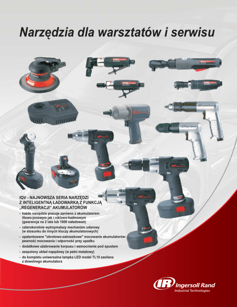 Narzêdzia dla warsztatów i serwisu IQV - NAJNOWSZA SERIA NARZÊDZI Z INTELIGENTN¥ £ADOWARK¥ Z FUNKCJ¥ „REGENERACJI” AKUMULATORÓW - ka¿de narzêdzie pracuje zarówno z akumulatorem litowo-jonowym jak i niklowo-kadmowym (gwarancja na 2 lata lub 1000 na³adowañ) - czterokorotnie wytrzymalszy mechanizm udarowy (w stosunku do innych kluczy akumulatorowych) - opatentowane "obrotowo-zatrzaskowe" mocowanie akumulatorów: pewnoœæ mocowania i odpornoœæ przy upadku - dodatkowe u¿ebrowanie korpusu i wzmocnienie pod spustem - zespolony uk³ad napêdowy (w pe³ni metalowy) - do kompletu uniwersalna lampka LED model TL10 zasilana z dowolnego akumulatora Klucze udarowe i zapadkowe KLUCZE UDAROWE Prêdkoœæ maks. [cali] [obr./min.] Czop Typ Moment maks. [Nm] Moment u¿ytkowy [Nm] Waga 211-EU [kg] LA158 3/8" 9500 132 10-70 1,3 1) 211-EU 3/8" 10000 245 30-120 1,1 212-EU 3/8" 10000 245 30-120 1,3 Klucze serii 21x5QTi 2115QTi / 2125QTi 3/ 8"/ ½" 14500 330(380) 40-150 1,1 z mechanizmem udarowym 236 1/2" 7400 610 70-200 2,4 Twin Hammer Plus 231GXP 1/2" 8000 610 70-300 2,6 z obudow¹ ze stopu 2130XP 1/2" 9500 610(810) 70-300 2,0 tytanu 2135 QTiMAX (-2) 1/2" 9500 840(950) 70-350 1,8 3 / 4 "/ 1" 7500 1200(1600) 300-650 3,3 2141S / 2151S 258 3/4" 6200 1360 300-700 4,9 261-EU (-6) / 271-EU 3/ 4 "/ 1" 5500 1500 300-800 5,6 2161XP(-6) / 2171XP 3/ 4 "/ 1" 6000 1700 400-1000 5,1 1) 2190Ti (-6) 1" 6800 2200 400-1100 6,4 2135QTiMAX 1) 1" 5000 2000 400-1220 10,9 285B (-6) 295A-EU (-6) 1" 5000 2000 400-1220 10,1 2115QTi 1) 280-EU (-6) 1" 6000 2175 400-1360 10,0 (opcja 1/2": 290-EU (-6) 1" 6000 2175 400-1360 9,9 2125QTi) 1) - Klucze w wersji prostej lub ze specjaln¹ rêkojeœci¹. W nawiasach podany maksymalny moment przy odkrêcaniu. Jako opcja oferowane narzêdzia z przed³u¿onym czopem (2) = 2" = 50 mm, (3) = 3" = 75 mm, (6) = 6" = 150 mm Udarowe klucze akumulatorowe (patrz zdjêcie na ok³adce) 1 /4 " 2200 W040 2) 7,2 V 200 2 - 30 1,2 2) 231GXP 2) 3 W150 / W175 14,4V /8 "/ ½" 2200 200 40-100 2,1 klasyka W360 2) 19,2 V 1/2" 2200 490 40-200 2,8 Ingersoll-Rand 2) - Zestaw z “inteligentn¹” ³adowark¹ i dwoma akumulatorami NiCd lub LiIon dopisaæ -2N lub -2L. Waga z akumulatorem LiIon. Oferowane równie¿ W040SQ - z czopem kwadrat. 1/4 ", W150QC - z uchwytem do szybkiej wymiany 1/4 ", W360P - z ko³kiem blokady wypadniêcia nasadki. 2141S 2130XP 2161XP (opcja 1": 2171XP) 280-EU 2190Ti-6 K¥TOWE KLUCZE ZAPADKOWE Czop Typ [cali] 3 /8 " / 1/4 " /2 " / 3/8 " 1033A / 103A 1770 / 170 1 Prêdk. Zakres D³ugoœæ Waga maks. momentu [obr/min] [Nm] [mm] [kg] 200 7 - 27 165 160 14 - 68 260 0,5 1,1 285B-6 pierœcieñ zmiany prêdkoœci kierunkowy wylot powietrza 1225Ti Klucze zapadkowe serii XP 1077XPA / 107XPA 1099XPA / 109XPA 1 /2 " / 3/8 " /2 " / 3/8 " 1 160 14 - 61 267 300 14 - 81 302 1,1 1,4 R385 Wzmocnione klucze w obudowie z kompozytu /8 " / 1/4 " /2 " / 3/8 " 3 1133 / 1103 1210 / 1200 1 270 7 - 34 190 270 14 - 68 273 0,6 1,2 Lekkie tytanowe klucze zapadkowe z p³ask¹ g³owic¹ /8 " / 1/4 " 3 1225Ti / 1215Ti 225 7 - 34 203 0,7 300 14 - 68 267 1,2 Klucze bez momentu reakcji 1111A-EU / 111-EU 1 /2 " / 3/8 " 1103 ulepszana cieplnie g³owica z systemem TwinPawl Plus™ ergonomiczny miêkki chwyt 107XPA Akumulatorowe klucze zapadkowe R1452) / R1402) 7,2V 3/8 " / 1/4 " 272 7 - 34 272 1,3 R3852) / R3802) 14,2V 1/2 " / 3/8 " 315 14 - 81 315 1,9 2) - Zestaw z “inteligentn¹” ³adowark¹ i dwoma akumulatorami NiCd lub LiIon dopisaæ -2N lub -2L. Waga z akumulatorem LiIon. 1210 – z regulowanym bocznym wylotem oraz p³ynn¹ regulacj¹ 1033A Parametry podane dla ciœnienia zasilania 620 kPa. Wlot powietrza kluczy z czopem 1" – 1/2"NPT (z wyj¹tkiem kluczy 271-EU, 2171XP – 3/8"NPT), kluczy z czopem 3/4" – 3/8" NPT, kluczy z czopem 1/2" oraz 3/8" – 1/4"NPT. Zalecana Ø przewodu pneumatycznego 10 mm (Ø 16 mm klucze z czopem 3/4" i 1"). Najpopularniejsze narzêdzia wyró¿niono grubsz¹ czcionk¹. Dostêpne te¿ zestawy narzêdzi z 10 nasadkami: 2135QTiMAX-SK oraz 231GXP-K. Na ¿yczenie zestaw 231GXP-R: klucz 231GXP + klucz 1770 + 5 nasadek. 2 Szlifierki i wiertarki SZLIFIERKI Typ Opis / wyposa¿enie narzêdzia Tarcza (tulejka) [mm] Prêdkoœæ maks. [obr./min.] Moc Waga [kW] [kg] Szlifierki oscylacyjno-obrotowe 4151-HL 1) pod³¹czenie do odci¹gu, 4151JV 2) Æ152 12000 0,15 0,9 4151-HL-2 1) pod³¹czenie do odci¹gu, 4151JV 2) Æ152 12000 0,15 1,0 Æ152 311A bez odsysania 10000 0,19 1,7 4152-HL 1) pod³¹czenie do odci¹gu, 4151JV 2) Æ152 3) 12000 0,15 0,9 2) 3) 4152-HL-SR pod³¹czenie do odci¹gu, 4151JV 12000 0,15 0,85 Æ75 1) - Szlifierki wyposa¿one w tarczê na rzepy, nr kat. 49835. 2) - Opcja: zestaw 4151JV do skutecznego samoczynnego odsysania py³u. Wymienne worki papierowe IR49988 (20 szt.), IR49987 (250 szt.) 3) - Szlifierki 4152-HL & 4152-HL-SR z mimoœrodem 2,5 mm (pozosta³e 5 mm) Szlifierki oscylacyjne stopa prostok¹tna 312A 93 x 170 8000 2,1 stopa prostok¹tna 315-EU 70 x 405 3000 3,0 Szlifierki bez ruchu oscylacyjnego na papier œcierny szlifierka k¹towa 313A Æ178 5000 0,8 1,8 314A polerka k¹towa4) Æ178 2500 0,8 1,8 szlifierka pistoletowa 317A Æ127 18000 1,0 318A Æ178 2800 0,6 2,0 polerka czo³owa 4) 319A Æ178 5000 0,6 2,0 szlifierka czo³owa Szlifierki proste i k¹towe 301-EU Æ6 20000 0,19 0,45 k¹towa z tulejk¹ (mini) 302A-EU Æ 6 & ¼" 18000 0,25 0,45 k¹towa z tulejk¹ k¹towa z tulejk¹ (kompozytowa) Æ 6 & ¼" 20000 0,27 0,6 3102-EU Æ6 307A-EU 27000 0,19 0,3 prosta z tulejk¹ (mini) 308A-EU Æ 6 & ¼" 25000 0,25 0,5 prosta z tulejk¹ 3108-EU prosta z tulejk¹ (kompozytowa) Æ 6 & ¼" 25000 0,27 0,5 Æ6 LA429-EU 22000 0,32 0,6 prosta + 10 œciernic trzpieniowych 327-EU prosta – uchwyt wiertarski max.Æ 10 22000 0,37 0,7 prosta – uchwyt 7/16" 327LS ----3000 0,37 1,0 max.125 12000 0,60 1,8 LA422-EU k¹towa na tarcze 4) - Ko¿uch do polerowania jest wyposa¿eniem dodatkowym, nr kat. P500-850. 4151-HL 4151-HL-2 315-EU 319A 312A 301-EU 314A 327-EU 4) 317A WIERTARKI 31