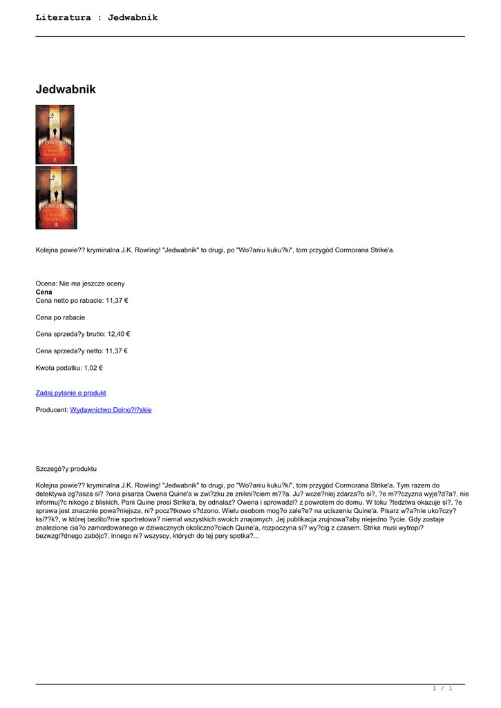 Literatura : Jedwabnik Jedwabnik Kolejna powie?? kryminalna J.K. Rowling! "Jedwabnik" to drugi, po "Wo?aniu kuku?ki", tom przygód Cormorana Strike'a. Ocena: Nie ma jeszcze oceny Cena Cena netto po rabacie: 11,37 € Cena po rabacie Cena sprzeda?y brutto: 12,40 € Cena sprzeda?y netto: 11,37 € Kwota podatku: 1,02 € Zadaj pytanie o produkt Producent: Wydawnictwo Dolno?l?skie Szczegó?y produktu Kolejna powie?? kryminalna J.K. Rowling! "Jedwabnik" to drugi, po "Wo?aniu kuku?ki", tom przygód Cormorana Strike'a. Tym razem do detektywa zg?asza si? ?ona pisarza Owena Quine'a w zwi?zku ze znikni?ciem m??a. Ju? wcze?niej zdarza?o si?, ?e m??czyzna wyje?d?a?, nie informuj?c nikogo z bliskich. Pani Quine prosi Strike'a, by odnalaz? Owena i sprowadzi? z powrotem do domu. W toku ?ledztwa okazuje si?, ?e sprawa jest znacznie powa?niejsza, ni? pocz?tkowo s?dzono. Wielu osobom mog?o zale?e? na uciszeniu Quine'a. Pisarz w?a?nie uko?czy? ksi??k?, w której bezlito?nie sportretowa? niemal wszystkich swoich znajomych. Jej publikacja zrujnowa?aby niejedno ?ycie. Gdy zostaje znalezione cia?o zamordowanego w dziwacznych okoliczno?ciach Quine'a, rozpoczyna si? wy?cig z czasem. Strike musi wytropi? bezwzgl?dnego zabójc?, innego ni? wszyscy, których do tej pory spotka?... 1 / 1 Powered by TCPDF (www.tcpdf.org)