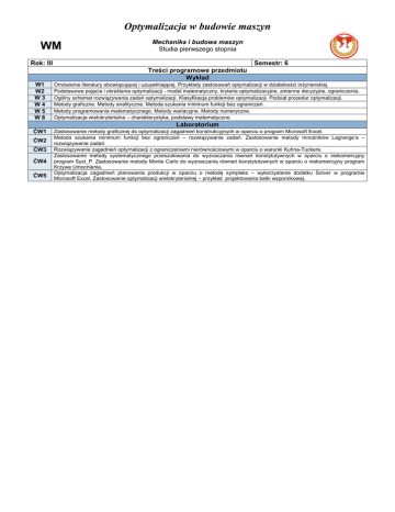 Optymalizacja w budowie maszyn WM Mechanika i budowa maszyn Studia pierwszego stopnia Rok: III Semestr: 6 Treści programowe przedmiotu Wykład W1 W2 W3 W4 W5 W6 Omówienie literatury obowiązującej i uzupełniającej. Przykłady zastosowań optymalizacji w działalności inŜynierskiej. Podstawowe pojęcia i określenia optymalizacji - model matematyczny, kryteria optymalizacyjne, zmienne decyzyjne, ograniczenia. Ogólny schemat rozwiązywania zadań optymalizacji. Klasyfikacja problemów optymalizacji. Podział procedur optymalizacji. Metody graficzne. Metody analityczne. Metoda szukania minimum funkcji bez ograniczeń. Metody programowania matematycznego. Metody wariacyjne. Metody numeryczne. Optymalizacja wielokryterialna – charakterystyka, podstawy matematyczne. ĆW1 Zastosowanie metody graficznej do optymalizacji zagadnień konstrukcyjnych w oparciu o program Microsoft Excel. Metoda szukania minimum funkcji bez ograniczeń – rozwiązywanie zadań. Zastosowanie metody mnoŜników Lagrange’a – rozwiązywanie zadań. Rozwiązywanie zagadnień optymalizacji z ograniczeniami nierównościowymi w oparciu o warunki Kuhna-Tuckera. Zastosowanie metody systematycznego przeszukiwania do wyznaczania równań konstytutywnych w oparciu o niekomercyjny program Syst_P. Zastosowanie metody Monte Carlo do wyznaczania równań konstytutywnych w oparciu o niekomercyjny program Krzywe Umocnienia. Optymalizacja zagadnień planowania produkcji w oparciu o metodę sympleks – wykorzystanie dodatku Solver w programie Microsoft Excel. Zastosowanie optymalizacji wielokryterialnej – przykład projektowania belki wspornikowej. Laboratorium ĆW2 ĆW3 ĆW4 ĆW5