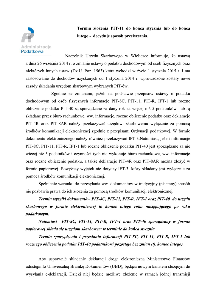Termin złożenia PIT-11 do końca stycznia lub do końca lutego - decyduje sposób przekazania. Naczelnik Urzędu Skarbowego w Wieliczce informuje, że ustawą z dnia 26 września 2014 r. o zmianie ustawy o podatku dochodowym od osób fizycznych oraz niektórych innych ustaw (Dz.U. Poz. 1563) która wchodzi w życie 1 stycznia 2015 r. i ma zastosowanie do dochodów uzyskanych od 1 stycznia 2014 r. wprowadzone zostały nowe zasady składania urzędom skarbowym wybranych PIT-ów. Zgodnie ze zmianami, jeżeli na podstawie przepisów ustawy o podatku dochodowym od osób fizycznych informacje PIT-8C, PIT-11, PIT-R, IFT-1 lub roczne obliczenie podatku PIT-40 są sporządzane za dany rok za więcej niż 5 podatników, lub są składane przez biuro rachunkowe, ww. informacje, roczne obliczenie podatku oraz deklaracje PIT-4R oraz PIT-8AR należy przekazywać urzędowi skarbowemu wyłącznie za pomocą środków komunikacji elektronicznej zgodnie z przepisami Ordynacji podatkowej. W formie dokumentu elektronicznego należy również przekazywać IFT-3.Natomiast, jeżeli informacje PIT-8C, PIT-11, PIT-R, IFT-1 lub roczne obliczenie podatku PIT-40 jest sporządzane za nie więcej niż 5 podatników i czynności tych nie wykonuje biuro rachunkowe, ww. informacje oraz roczne obliczenie podatku, a także deklaracje PIT-4R oraz PIT-8AR można złożyć w formie papierowej. Powyższy wyjątek nie dotyczy IFT-3, który składany jest wyłącznie za pomocą środków komunikacji elektronicznej. Spełnienie warunku do przesyłania ww. dokumentów w tradycyjny (pisemny) sposób nie pozbawia prawa do ich złożenia za pomocą środków komunikacji elektronicznej. Termin wysyłki dokumentów PIT-8C, PIT-11, PIT-R, IFT-1 oraz PIT-40 do urzędu skarbowego w formie elektronicznej to koniec lutego roku następującego po roku podatkowym. Natomiast PIT-8C, PIT-11, PIT-R, IFT-1 oraz PIT-40 sporządzany w formie papierowej składa się urzędom skarbowym w terminie do końca stycznia. Termin sporządzenia i przesłania informacji PIT-8C, PIT-11, PIT-R, IFT-1 lub rocznego obliczenia podatku PIT-40 podatnikowi pozostaje bez zmian (tj. koniec lutego). Aby usprawnić składanie deklaracji drogą elektroniczną Ministerstwo Finansów udostępniło Uniwersalną Bramkę Dokumentów (UBD), będąca nowym kanałem służącym do wysyłania e-deklaracji. Dzięki niej będzie możliwe złożenie w ramach jednej transmisji danych do 20000 dokumentów oraz pobranie jednego UPO (Urzędowe Poświadczenie Odbioru) dla całej wysyłki. Wprowadzono nowe schematy informacji PIT-11, PIT-8C, PIT-R oraz deklaracji PIT-40, które w UBD zostały oznaczone: PIT-11Z, PIT-8CZ. PIT-RZ oraz deklaracja PIT-40Z. Oznacza to wprowadzenie dokumentu wielopozycyjnego, umożliwiającego wysyłanie urzędowi skarbowemu zbiorczej informacji o dochodach osób fizycznych, opatrzonej jednym podpisem. Naczelnik Urzędu Skarbowego w Wieliczce zaprasza do testowania UBD, aby bezproblemowo wysłać drogą elektroniczną deklaracje i informacje podatkowe za 2014 rok. Uruchomiono w prawidłowym także centralny wypełnianiu Portal obowiązków Podatkowy podatkowych. wspierający Pod podatników jednym adresem www.portalpodatkowy.mf.gov.pl znajdą Państwo wszystkie niezbędne informacje dotyczące podatków oraz interaktywne formularze podatkowe wraz z instrukcją ich wypełnienia.