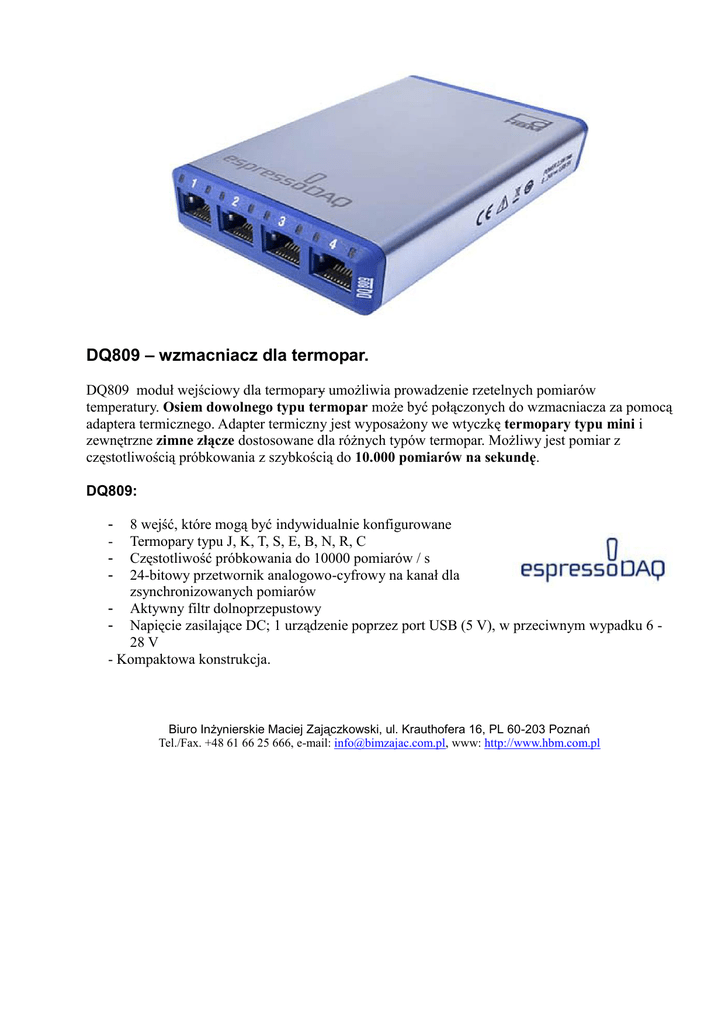 DQ809 – wzmacniacz dla termopar. DQ809 moduł wejściowy dla termopary umożliwia prowadzenie rzetelnych pomiarów temperatury. Osiem dowolnego typu termopar może być połączonych do wzmacniacza za pomocą adaptera termicznego. Adapter termiczny jest wyposażony we wtyczkę termopary typu mini i zewnętrzne zimne złącze dostosowane dla różnych typów termopar. Możliwy jest pomiar z częstotliwością próbkowania z szybkością do 10.000 pomiarów na sekundę. DQ809: 8 wejść, które mogą być indywidualnie konfigurowane Termopary typu J, K, T, S, E, B, N, R, C Częstotliwość próbkowania do 10000 pomiarów / s 24-bitowy przetwornik analogowo-cyfrowy na kanał dla zsynchronizowanych pomiarów - Aktywny filtr dolnoprzepustowy - Napięcie zasilające DC; 1 urządzenie poprzez port USB (5 V), w przeciwnym wypadku 6 28 V - Kompaktowa konstrukcja. - Biuro Inżynierskie Maciej Zajączkowski, ul. Krauthofera 16, PL 60-203 Poznań Tel./Fax. +48 61 66 25 666, e-mail: [email protected], www: http://www.hbm.com.pl