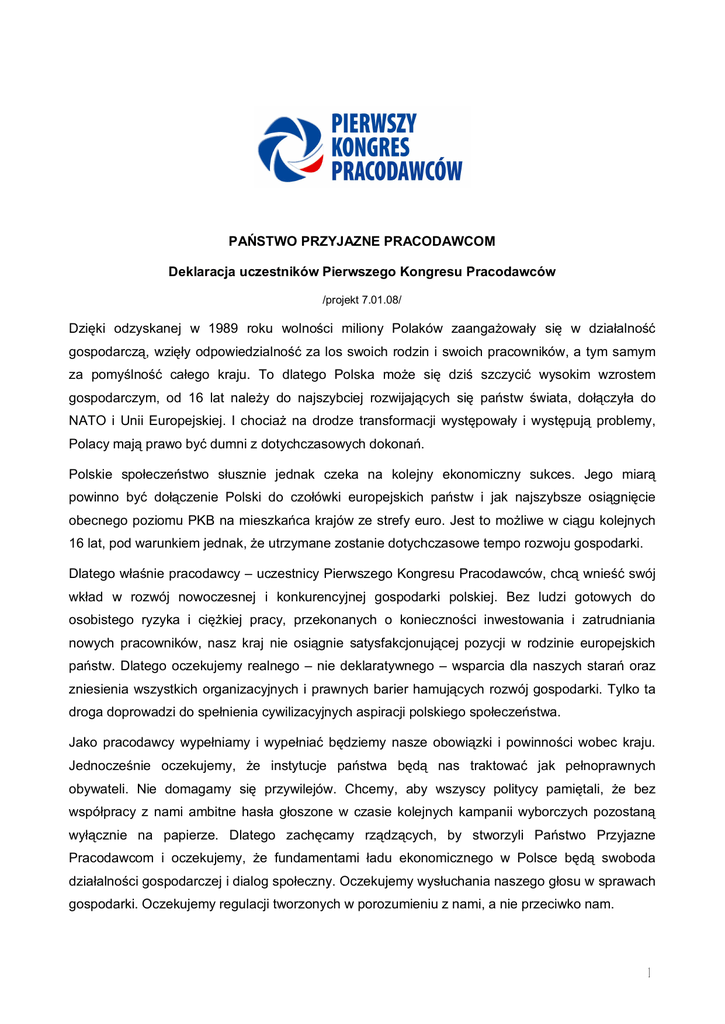 PA STWO PRZYJAZNE PRACODAWCOM Deklaracja uczestników Pierwszego Kongresu Pracodawców /projekt 7.01.08/ Dzi ki odzyskanej w 1989 roku wolno ci miliony Polaków zaanga owa y si gospodarcz , wzi y odpowiedzialno za pomy lno w dzia alno za los swoich rodzin i swoich pracowników, a tym samym ca ego kraju. To dlatego Polska mo e si dzi gospodarczym, od 16 lat nale y do najszybciej rozwijaj cych si szczyci wysokim wzrostem pa stw wiata, do czy a do NATO i Unii Europejskiej. I chocia na drodze transformacji wyst powa y i wyst puj problemy, Polacy maj prawo by dumni z dotychczasowych dokona . Polskie spo ecze stwo s usznie jednak czeka na kolejny ekonomiczny sukces. Jego miar powinno by do czenie Polski do czo ówki europejskich pa stw i jak najszybsze osi gni cie obecnego poziomu PKB na mieszka ca krajów ze strefy euro. Jest to mo liwe w ci gu kolejnych 16 lat, pod warunkiem jednak, e utrzymane zostanie dotychczasowe tempo rozwoju gospodarki. Dlatego w nie pracodawcy – uczestnicy Pierwszego Kongresu Pracodawców, chc wnie swój wk ad w rozwój nowoczesnej i konkurencyjnej gospodarki polskiej. Bez ludzi gotowych do osobistego ryzyka i ci kiej pracy, przekonanych o konieczno ci inwestowania i zatrudniania nowych pracowników, nasz kraj nie osi gnie satysfakcjonuj cej pozycji w rodzinie europejskich pa stw. Dlatego oczekujemy realnego – nie deklaratywnego – wsparcia dla naszych stara oraz zniesienia wszystkich organizacyjnych i prawnych barier hamuj cych rozwój gospodarki. Tylko ta droga doprowadzi do spe nienia cywilizacyjnych aspiracji polskiego spo ecze stwa. Jako pracodawcy wype niamy i wype nia b dziemy nasze obowi zki i powinno ci wobec kraju. Jednocze nie oczekujemy, obywateli. Nie domagamy si e instytucje pa stwa b nas traktowa jak pe noprawnych przywilejów. Chcemy, aby wszyscy politycy pami tali, e bez wspó pracy z nami ambitne has a g oszone w czasie kolejnych kampanii wyborczych pozostan wy cznie na papierze. Dlatego zach camy rz dz cych, by stworzyli Pa stwo Przyjazne Pracodawcom i oczekujemy, e fundamentami adu ekonomicznego w Polsce b swoboda dzia alno ci gospodarczej i dialog spo eczny. Oczekujemy wys uchania naszego g osu w sprawach gospodarki. Oczekujemy regulacji tworzonych w porozumieniu z nami, a nie przeciwko nam. 1 Jednocze nie deklarujemy podj cie prac nad stworzeniem p aszczyzny wspó pracy polskich organizacji biznesowych, dzi ki której dialog z rz dem, parlamentem oraz z opini publiczn stanie si atwiejszy. Dzisiejszy Kongres Pracodawców jest pierwszym etapem na tej drodze. Nasza inicjatywa b dzie otwarta dla wszystkich reprezentacji biznesowych, które chc w powa ny sposób rozmawia o potrzebach gospodarki i przedsi biorców. Jeste my pracodawcami, którzy skupiaj si nie tylko na zyskach oraz barierach rozwoju naszych firm. Rozumiemy, e yciowa satysfakcja ka dego pracownika, jego dobrobyt, przek ada si bezpo rednio na sukcesy naszych przedsi biorstw i sytuacj ca ej gospodarki. Nie traktujemy dzia alno ci gospodarczej jako celu samego w sobie. Og aszamy t Deklaracj w przekonaniu, e wspó czesnym Polakom i przysz ym pokoleniom potrzebne s rozwi zania systemowe sprzyjaj ce zrównowa onemu rozwojowi: po czeniu wzrostu gospodarczego ze zwi kszaniem zatrudnienia oraz obywatelsk aktywno ci , bez dyskryminacji i wykluczania kogokolwiek. Pierwszy Kongres Pracodawców Warszawa, dnia 17 stycznia 2008 roku 2