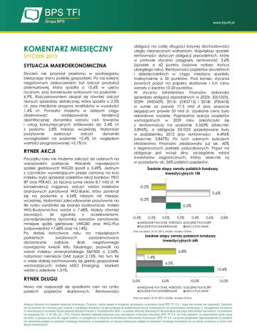 KOMENTARZ MIESIĘCZNY STYCZEŃ 2013 SYTUACJA MAKROEKONOMICZNA Styczeń nie przyniósł przełomu w postrzeganiu bieżącego stanu polskiej gospodarki. Po raz kolejny negatywnym zaskoczeniem był odczyt produkcji przemysłowej, która spadła o 10,6% w ujęciu rocznym, przy konsensusie rynkowym na poziomie 6,9%. Rozczarowaniem okazał się również odczyt danych sprzedaży detalicznej, która spadła o 2,5% r/r, przy medianie prognoz analityków w wysokości 1,4% r/r. Ponadto możemy w dalszym ciągu obserwować występowanie tendencji dezinflacyjnej: dynamika wzrostu cen towarów i usług konsumpcyjnych zniżkowała do 2,4% r/r z poziomu 2,8% miesiąc wcześniej. Natomiast pozytywnie zaskoczył odczyt dynamiki wynagrodzeń na poziomie +2,4% r/r, względem wartości prognozowanej: +2,1% r/r. RYNEK AKCJI Początku roku nie możemy zaliczyć do udanych na warszawskim parkiecie. Wskaźnik największych spółek giełdowych WIG20 spadł o 3,49%. Jednym z czynników wywierającym presje cenową na kurs indeksu była sprzedaż pakietów akcji banków: PKO BP oraz PEKAO, za łączną sumę około 8,7 mld zł. W konsekwencji najgorszy odczyt wśród indeksów branżowych zanotował WIG-Banki, który zamknął się na poziomie o 4,54% niższym niż miesiąc wcześniej. Natomiast zdecydowanie pozytywnie na tle rynku wyróżniła się branża budownicza- indeks WIG-Budownictwo wzrósł o 7,48%. Należy również zauważyć, że zgodnie z oczekiwaniami, ponadprzeciętna dynamiką wzrostów zanotowały mniejsze spółki giełdowe: sWIG80 oraz WIG-Plus (odpowiednio +7,68% oraz +6,14%). Po słabej końcówce roku na największych parkietach światowych zaobserwowano dynamiczne odbicie. Brak negatywnego rozwiązania kwestii klifu fiskalnego, pozwolił na wzrost indeksu amerykańskiego S&P500 o 5,04%, natomiast niemiecki DAX zyskał 2,15%. Na tym tle o wiele słabiej zachowywały się giełdy gospodarek wschodzących: indeks MSCI Emerging Markets wzrósł o zaledwie 1,31%. RYNEK DŁUGU Nowy rok rozpoczął się spadkami cen na rynku polskich papierów skarbowych. Rentowności obligacji na całej długości krzywej dochodowości uległy nieznacznym wahaniom. Największy spadek rentowności dotyczył obligacji pięcioletnich, które w połowie stycznia osiągnęły rentowność 3,6% (spadek o 42 punkty bazowe wobec końca ubiegłego roku). Rentowności papierów dwuletnich i dziesięcioletnich w ciągu miesiąca spadały maksymalnie o 30 punktów. Pod koniec stycznia powrócił popyt na papiery skarbowe i ich ceny wzrosły o średnio 10-20 punktów. W styczniu Ministerstwo Finansów dokonało sprzedaży obligacji zapadalnych w 2023r. (DS1023), 2029r. (WS0429), 2015r. (OK0715) i 2018r. (PS0418) w sumie za ponad 17,3 mld zł przy popycie sięgającym prawie 33 mld zł. Uzyskane ceny były rekordowo wysokie. Poprzednia aukcja papierów wymagalnych w 2029 roku zakończyła się z rentownością na poziomie 5,563% (obecnie: 3,896%), a obligacje DS1023 sprzedawane były w październiku 2012 przy rentowności 4,496% (obecnie: 3,847%). Po tych udanych aukcjach Ministerstwo Finansów zrealizowało już ok. 40% z tegorocznych potrzeb pożyczkowych. Popyt na obligacje jest wciąż silny, szczególnie wśród inwestorów zagranicznych, którzy obecnie są w posiadaniu ok. 36% polskich papierów. Średnie stopy zwrotu polskich funduszy inwestycyjnych 1M -0,2% 0,6% -0,2% 0,2% -0,4% -0,2% 0,0% 0,2% MIESZANE PLN STAB. WZROSTU DŁUŻNE PLN UNIWERSALNE 0,4% 0,6% 0,8% DŁUŻNE PLN KORP AKCJI PLN UNIW Stan na dzień: 31-01-2013, źródło: Analizy Online Średnie stopy zwrotu polskich funduszy inwestycyjnych 6M 6,8% 1,4% 4,5% 13,4% 0,0% 5,0% MIESZANE PLN STAB. WZROSTU DŁUŻNE PLN UNIWERSALNE 10,0% 15,0% DŁUŻNE PLN KORP AKCJI PLN UNIW Stan na dzień: 31-01-2013, źródło: Analizy Online Niniejszy dokument ma charakter wyłącznie informacyjny. Prognozy i opinie zawarte w niniejszym opracowaniu są wyrazem oceny BPS TFI S.A. i mogą ulec zmianie bez zapowiedzi. Dokument ten nie powinien być rozumiany jako materiał o charakterze doradczym lub jako podstawa do podejmowania decyzji inwestycyjnych lub rekomendacja inwestycyjna, w szczególności nie stanowi on rekomendacji w rozumieniu Rozporządzenia Ministra Finansów z 19 października 2005 r. w sprawie informacji stanowiących rekomendacje dotyczące instrumentów finansowych, ich emitentów lub wystawców (Dz. U. Nr 206, poz. 1715). Pomimo dołożenia należytej staranności przy sporządzaniu niniejszego dokumentu BPS TFI S.A. nie może zapewnić, że prezentowane opinie okażą się trafne, a sytuacja na rynku nie ulegnie zmianie, w szczególności w stosunku do określonych instrumentów finansowych. BPS TFI S.A. nie ponosi jakiejkolwiek odpowiedzialności za działania lub zaniechania podjęte na podstawie niniejszego dokumentu, w szczególności za decyzje inwestycyjne podjęte na podstawie niniejszego komentarza ani za szkody poniesione w wyniku tych decyzji inwestycyjnych.