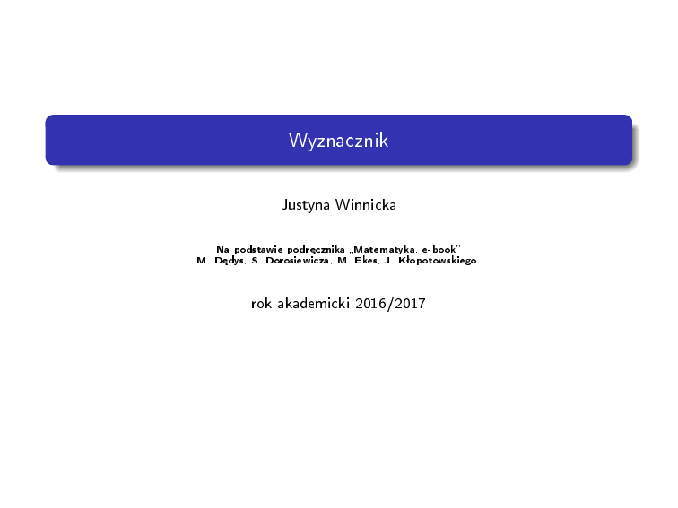 Wyznacznik Justyna Winnicka Na podstawie podr¦cznika Matematyka. e-book M. D¦dys, S. Dorosiewicza, M. Ekes, J. Kªopotowskiego. rok akademicki 2016/2017 Denicja Niech A bedzie macierz¡ kwadratow¡ stopnia n. Macierz B odwrotn¡ do macierzy A wtedy i tylko wtedy, gdy nazywamy macierz¡ AB = BA = I. Macierz odwrotn¡ do macierzy A oznaczamy symbolem Mamy wi¦c AA−1 = A−1 A = I. A−1 . Przykªad Sprawdzimy, która z macierzy macierzy A= B= 3 −2 . 2 −1 3 2 −1 2 ,C = −2 −1 −2 3 jest odwrotna do Denicja Macierz kwadratow¡ A nazywamy odwracaln¡, je±li istnieje macierz A−1 . Twierdzenie Macierz kwadratowa A jest odwracalna wtedy i tylko wtedy, gdy jest nieosobliwa. Twierdzenie Je±li macierz A jest nieosobliwa, to istnieje dokªadnie jedna macierz odwrotna A−1 , która tak»e jest nieosobliwa, oraz (A−1 )−1 = A. Przykªad Wyznaczymy I−1 . Twierdzenie Je±li macierz A jest nieosobliwa, to macierz AT jest nieosobliwa oraz (AT )−1 = (A−1 )T . Twierdzenie Je±li A, B s¡ macierzami nieosobliwymi stopnia (AB)−1 = B−1 A−1 . n, to macierz AB jest nieosobliwa oraz Niech A = [aij ] b¦dzie macierz¡ kwadratow¡ stopnia n > 1. Przez Aij oznaczamy macierz otrzyman¡ z macierzy A przez skre±lenie i -tego wiersza i j -tej kolumny. Denicja nazywamy tak¡ funkcj¦, oznaczan¡ symbolem det, okre±lon¡ na zbiorze wszystkich macierzy kwadratowych, »e a) je±li A = [a] (A jest macierz¡ stopnia 1), to det A = a; b) je±li A = [aij ] jest macierz¡ stopnia n > 1, to Wyznacznikiem macierzy det A = (−1)1+1 a11 det A11 + (−1)2+1 a21 det A21 + · · · + (−1)n+1 an1 det An1 . Wyznacznik macierzy A stopnia n > 1 oznaczamy równie» symbolem |A|. Przykªad Obliczymy wyznacznik macierzy stopnia drugiego A= a11 a12 a21 a22 . Bezpo±rednio z denicji dostajemy a11 a12 a21 a22 = a11 a22 − a21 a12 . det A = det = (−1)1+1 a11 det A11 + (−1)2+1 a21 det A21 = Przykªad a11 a12 a13 Obliczymy wyznacznik macierzy stopnia trzeciego A = a21 a22 a23 . Zgodnie z a31 a32 a33 a11 a12 a13 denicj¡ mamy det A = det a21 a22 a23 = a31 a32 a33 = (−1)1+1 a11 det A11 + (−1)2+1 a21 det A21 + (−1)3+1 a31 det A31 = a a a a a a = a11 det 22 23 − a21 det 12 13 + a31 det 12 13 = a32 a33 a32 a33 a22 a23 =a11 (a22 a33 − a32 a23 ) − a21 (a12 a33 − a32 a13 ) + a31 (a12 a23 − a22 a13 ) = = a11 a22 a33 − a11 a32 a23 − a21 a12 a33 + a21 a32 a13 + a31 a12 a23 − a31 a22 a13 . Do obliczania wyznacznika macierzy kwadratowej stopnia trzeciego (i tylko trzeciego) mo»na zastosowa¢ tzw. schemat Sarrusa. Po prawej stronie macierzy dopisujemy kolumny pierwsz¡ i drug¡, a nast¦pnie tworzymy iloczyny z odpowiednimi znakami: + dla & oraz − dla % . Dodaj¡c otrzymane iloczyny z odpowiednimi znakami, otrzymujemy wyznacznik macierzy. Przykªad 1 2 3 Obliczymy 1 −1 0 . 3 2 1 Twierdzenie (rozwini¦cie Laplace'a) Je±li A jest macierz¡ stopnia n ≥ 2, to a) det A = (−1)1+j a1j det A1j + (−1)2+j a2j (rozwini¦cie wzgl¦dem j -tej kolumny), det A2j + · · · + (−1)n+j anj det Anj b) det A = (−1)i+1 ai 1 det Ai 1 + (−1)i+2 ai 2 det Ai 2 (rozwini¦cie wzgl¦dem i -tego wiersza). + · · · + (−1)i+n ain det Ain Przykªad Obliczymy wyznacznik macierzy A stopnia czwartego, gdzie A= −1 0 3 2 2 −3 0 4 . 3 0 −2 1 0 3 −2 −1 Twierdzenie (wªasno±ci wyznacznika) Niech A = [aij ] b¦dzie macierz¡ kwadratow¡ stopnia n. Wtedy a) det AT = det A; b) je±li A ma kolumn¦ (wiersz) zªo»on¡ z samych zer, to det A = 0; c) je±li dwie kolumny (dwa wiersze) macierzy A s¡ proporcjonalne (w szczególno±ci równe), to det A = 0; d) je±li A jest macierz¡ trójk¡tn¡ górn¡ lub trójk¡tn¡ doln¡, to det A = a11 a22 · · · ann ; e) det In = 1. Kolejne wªasno±ci wyznacznika podamy po zdeniowaniu operacji elementarnych na wierszach (kolumnach) macierzy. Twierdzenie (Cauchy'ego) Je±li A, B s¡ macierzami kwadratowymi stopnia n, to det(AB) = det A det B. Denicja Niech A b¦dzie macierz¡ o wymiarach m × n, a B macierz¡ kwadratow¡ stopnia k otrzyman¡ z macierzy A przez skre±lenie m − k wierszy i n − k kolumn. Wyznacznik det B nazywamy minorem stopnia k macierzy A. Twierdzenie Rz¡d macierzy A o wymiarach m × n jest równy k wtedy i tylko wtedy, gdy istnieje ró»ny od zera minor stopnia k macierzy A i nie istnieje ró»ny od zera minor A stopnia wi¦kszego ni» k . Przykªad Wyznaczymy rz¦dy macierzy 1 0 1 1 a) A = 2 1 1 1 , 3 7 −4 −4 b) B = I4 , 1 m m c) C = m 1 m w zale»no±ci od warto±ci parametru m ∈ R. 3 3 3 Twierdzenie Macierz kwadratowa A stopnia n jest nieosobliwa wtedy i tylko wtedy, gdy det A 6= 0. Przykªad 4 −3 −1 Poka»emy, »e macierz A = −1 0 1 jest osobliwa. 1 1 −2 Denicja Niech A = [aij ] algebraicznym b¦dzie macierz¡ kwadratow¡ stopnia n, gdzie n ≥ 2. elementu aij nazywamy liczb¦ dij = (−1)i+j det Aij . Macierz AD = [dij ] nazywamy macierz¡ lub macierz¡ doª¡czon¡ macierzy A. dopeªnie« algebraicznych Twierdzenie Je±li macierz A jest nieosobliwa, to A−1 = 1 (AD )T . det A Przykªad 0 0 1 Wyznaczymy macierz odwrotn¡ do macierzy A = 1 −3 −2 1 −1 1 i sprawdzimy otrzymany wynik. Dopeªnieniem Przykªad Wyznaczymy macierz odwrotn¡ do macierzy a) b) A= B= a b c d 5 4 . 3 2 (o ile istnieje), Twierdzenie Je±li macierz A jest nieosobliwa, to det A−1 = 1 . det A