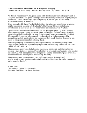 XXXV Rocznica wędrówki ks. Kardynała Wojtyły „Niech zstąpi duch Twój i odnowi obliczę ziemi. Tej ziemi!” (Bł. J.P II) W dniu 9 września 2013 r. jako klasa III b Technikum Usług Fryzjerskich z Zespołu Szkół im. św. Jana Kantego uczestniczyliśmy w rajdzie turystycznym. Msza św., która rozpoczęła rajd odbyła się w parafii pw. Matki Bożej Częstochowskiej w Skawicy. Przy pomniku Bł. Jana Pawła II złożyliśmy kwiaty oraz uczciliśmy otwarcie rajdu ukochaną pieśnią J.P. II „Barką”. Na Suchą Górę dojechaliśmy autokarem, a następnie pieszo ruszyliśmy szlakiem Karola Wojtyły. „Jeśli chcesz znaleźć źródło musisz iść do góry pod prąd” (J.P II). Naszej wyprawie sprzyjał ciepły poranek, choć niebo było zachmurzone, dzielnie stawialiśmy kolejne kroki, by móc doświadczyć trudu wspinaczki. Na Hali Krupowej był czas na odpoczynek i nabranie sił w dalszą drogę. Gdy ruszyliśmy dalej, nagle niebo się zachmurzyło i spadł drobny deszczyk, ale nam to nie przeszkadzało i szliśmy dalej. Na szczycie góry odmówiliśmy krótką modlitwę, zrobiliśmy pamiątkowe zdjęcie przy pomniku upamiętniającym ofiary katastrofy samolotu An-22 PLL „LOT” (2.04.1969 r.) Nasza droga powrotna była bardzo męcząca, ponieważ padał gwałtowny deszcz i było już dość zimno. Pomyśleliśmy o prawdziwym trudzie, jaki musiał znosić Bł. J.P.II. Zaczęliśmy wtedy śpiewać Barkę nabraliśmy pogody ducha. Przemoczeni do suchej nitki dotarliśmy do mety. Nasza wyprawa nauczyła nas, że: „Góry pozwalają doświadczyć trudu wspinaczki, strome podejścia kształtują charakter, kontakt z przyrodą dają pogodę ducha”. Klasa III b Technikum Usług Fryzjerskich Zespołu Szkół im. św. Jana Kantego