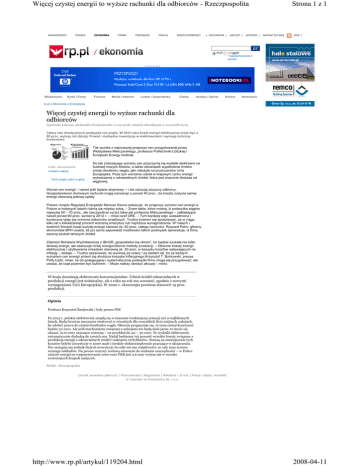 Więcej czystej energii to wyższe rachunki dla odbiorców - Rzeczpospolita WIADOMOŚCI PRAWO EKONOMIA FIRMA PIENIĄDZE PRACA NIERUCHOMOŚCI + ARCHIWUM | eSKLEP | Strona 1 z 1 ePAPIER | NAPISZ DO NAS RSS ? Prześ rp.pl +zaawansowane | pomoc reklama Wiadomości Rynki i Firmy Finanse Media i Internet Ludzie i Gospodarka Giełda Analizy i Opinie Kariera Notowania rp.pl » Ekonomia » Energetyka Więcej czystej energii to wyższe rachunki dla odbiorców Agnieszka Łakoma, Aleksandra Fandrejewska 11-04-2008, ostatnia aktualizacja 11-04-2008 05:23 Cztery lata drastycznych podwyżek cen prądu. W 2012 roku koszt energii elektrycznej może być o 90 proc. wyższy niż dzisiaj. Powód: niezbędne inwestycje w elektrowniach i wymogi ochrony środowiska Tak wynika z najnowszej prognozy cen przygotowanej przez Władysława Mielczarskiego, profesora Politechniki Łódzkiej i European Energy Institute. źródło: Rzeczpospolita +zobacz więcej Ceny prądu ostro w górę Do tak znaczącego wzrostu cen przyczynią się wydatki elektrowni na budowę nowych bloków, a także obowiązek wypełnienia limitów emisji dwutlenku węgla, jaki nałożyła na producentów Unia Europejska. Poza tym wzrośnie udział w krajowym rynku energii wytwarzanej z odnawialnych źródeł, która jest znacznie droższa od węglowej. Wzrost cen energii – nawet jeśli będzie stopniowy – i tak odczują wszyscy odbiorcy. Gospodarstwom domowym rachunki mogą wzrosnąć o ponad 40 proc., bo koszty zużycia samej energii stanowią połowę opłaty. Prezes Urzędu Regulacji Energetyki Mariusz Swora wskazuje, że prognozy wzrostu cen energii w Polsce w kolejnych latach różnią się między sobą. – Znam takie, które mówią, iż podwyżka sięgnie najwyżej 50 – 70 proc., ale rzeczywiście są też takie jak profesora Mielczarskiego – zakładające nawet ponad 90-proc. wzrost w 2012 r. – mówi szef URE. – Tym bardziej więc uzasadniona i konieczna staje się ochrona odbiorców wrażliwych. Trudno bowiem się spodziewać, że w ciągu kilku lat o kilkadziesiąt procent wzrosną emerytury lub najniższe wynagrodzenia. W małych i średnich firmach koszt zużytej energii stanowi ok. 60 proc. całego rachunku. Ryszard Petru, główny ekonomista BPH uważa, że już sama zapowiedź możliwości takich podwyżek spowoduje, iż firmy zaczną szukać tańszych źródeł. Zdaniem Bohdana Wyżnikiewicza z IBnGR „gospodarka się obroni”, bo będzie szukała nie tylko tańszej energii, ale zastosuje mniej energochłonne metody produkcji. – Obecnie koszty energii elektrycznej i użytkowania mieszkań stanowią ok. 20 proc. w koszyku kosztów wpływających na inflację – dodaje. – Trudno oszacować, ile wyniosą za cztery i za siedem lat, bo za każdym wzrostem cen energii zmieni się struktura koszyka inflacyjnego.Krzysztof T. Borkowski, prezes Polfy Łódź, mówi, że do postępującej i systematycznej podwyżki firmy mogą się przygotować, ale uważa, że rząd powinien być buforem. – Może należy obniżyć akcyzę – mówi. W kraju dominują elektrownie konwencjonalne. Udział źródeł odnawialnych w produkcji energii jest minimalny, ale z roku na rok ma wzrastać, zgodnie z nowymi wymaganiami Unii Europejskiej. W 2020 r. ekoenergia powinna stanowić 15 proc. produkcji. Opinia Profesor Krzysztof Żmijewski | były prezes PSE Po 2013 r. polskie elektrownie znajdą się w znacznie trudniejszej sytuacji niż w najbliższych latach. Będą bowiem zmuszone startować w otwartych dla wszystkich firm unijnych aukcjach, by zdobyć prawa do emisji dwutlenku węgla. Obecnie prognozuje się, że tona emisji kosztować będzie 30 euro. Ale jeśli mechanizmy związane z aukcjami nie będą dość jasne, to może się okazać, że te ceny znacząco wzrosną – na przykład do 40 – 50 euro. Te wydatki elektrownie automatycznie dodadzą do swoich cen. Nadal będziemy też ponosić wysokie koszty związane z produkcją energii z odnawialnych źródeł i zakupem certyfikatów. Szansą na zmniejszenie tych kosztów byłyby inwestycje w nowe małe i średnie elektrociepłownie pracujące w skojarzeniu. Nie zastąpią one jednak dużych inwestycji, bo nikt nie ma wątpliwości, że cały nasz system wymaga nakładów. Na pewno wszyscy zostaną zmuszeni do szukania oszczędności – w Polsce zużycie energii na wygenerowanie 1000 euro PKB jest 2,6 razy wyższe niż w wysoko rozwiniętych krajach unijnych. Źródło : Rzeczpospolita Cennik serwisów płatnych | Prenumerata | Regulamin | Reklama | O nas | Praca i staże | Kontakt © Copyright by Presspublica Sp. z o.o. http://www.rp.pl/artykul/119204.html 2008-04-11
