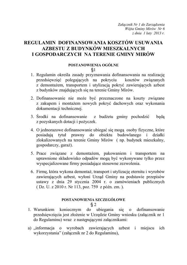 Załącznik Nr 1 do Zarządzenia Wójta Gminy Mirów Nr 6 z dnia 1 luty 2013 r. REGULAMIN DOFINANSOWANIA KOSZTÓW USUWANIA AZBESTU Z BUDYNKÓW MIESZKALNYCH I GOSPODARCZYCH NA TERENIE GMINY MIRÓW POSTANOWIENIA OGÓLNE §1 1. Regulamin określa zasady przyznawania dofinansowania na realizację przedsięwzięć polegających na pokryciu kosztów związanych z demontażem, transportem i utylizacją pokryć zawierających azbest z budynków znajdujących się na terenie Gminy Mirów. 2. Dofinansowanie nie może być przeznaczone na koszty związane z zakupem i montażem nowych pokryć dachowych oraz wykonania dokumentacji technicznej. 3. Środki na dofinansowanie z budżetu gminy pochodzić z pozyskanych dotacji i pożyczek. będą 4. O jednorazowe dofinansowanie ubiegać się mogą osoby fizyczne, które posiadają tytuł prawny do obiektu budowlanego i działki zlokalizowanych na terenie Gminy Mirów ( np. budynek mieszkalny, gospodarczy, garaż). 5. Prace związane z demontażem, pakowaniem i transportem na uprawnione składowisko odpadów mogą być wykonywane tylko przez wyspecjalizowane firmy posiadające stosowne zezwolenia. 6. Firmę, która wykona demontaż, transport i utylizację eternitu i wyrobów zawierających azbest, wyłoni Urząd Gminy na podstawie przepisów ustawy z dnia 29 stycznia 2004 r. o zamówieniach publicznych ( Dz. U. z 2010 r. Nr 113, poz. 759 z późn. zm. ). POSTANOWIENIA SZCZEGÓŁOWE §2 1. Warunkiem koniecznym do ubiegania się o dofinansowanie przedsięwzięcia jest złożenie w Urzędzie Gminy wniosku (załącznik nr 1 do Regulaminu) wraz z następującymi załącznikami: a) „informacja o wyrobach zawierających azbest wykorzystania” (załącznik nr 2 do Regulaminu), i miejscu ich b) „ocena stanu i możliwości bezpiecznego użytkowania wyrobów zawierających azbest” (załącznik nr 3 do Regulaminu), c) kserokopia tytułu prawnego do obiektu budowlanego, z którego są usuwane elementy azbestowe lub materiały zawierające azbest (oryginał do wglądu). W przypadku budynku, do którego tytuł prawny posiada kilka osób, należy dołączyć zgodę współwłaścicieli na wykonanie prac związanych z usuwaniem elementów azbestowych lub materiałów zawierających azbest. §3 1. Wnioski o dofinansowanie w 2013 roku przyjmowane są do 14 lutego złożone wnioski o dofinansowanie przyjmowane będą do realizacji . Na lata następne ustala się terminy składania wniosków do 15 lutego danego roku, a realizacja złożonego wniosku nastąpi w roku kalendarzowym. 2. O zakwalifikowaniu wniosku osoby zainteresowane będą powiadamiane pisemnie. 3. Zakwalifikowane do realizacji z uzyskanych dotacji i pożyczek. wnioski zostaną sfinansowane 4. Rozliczenie nastąpi między Urzędem Gminy, a firmą wyłonioną do wykonania zadania związanego z demontażem, transportem i utylizacją wyrobów zawierających azbest na podstawie przepisów o zamówieniach publicznych. 5. Wnioski niezrealizowane w danym roku kalendarzowym z powodu braku środków finansowych będą realizowane w pierwszej kolejności w latach następnych do wysokości posiadanych środków. 6. Kwotę dofinansowania w przypadku uzyskania dotacji zewnętrznej, przez Gminę Mirów na demontaż, pakowanie, transport i utylizację w całości ponosi Gmina Mirów. 7. Wnioskodawca przed przystąpieniem do wymiany pokrycia dachowego jest obowiązany do złożenia w Urzędzie Gminy w Mirów kopii potwierdzenia zgłoszenia w Starostwie Powiatowym w Szydłowcu w Wydziale Architektury zamiaru usunięcia wyrobów zawierających azbest z budynku, dokonanym na 30 dni przed planowanym rozpoczęciem robót, lub kopii pozwolenia na budowę lub rozbiórkę ( jeśli jest wymagane ). §4 1. Druki wniosku o dofinansowanie przedsięwzięcia będą do pobrania w Urzędzie Gminy Mirów lub na stronie internetowej Urzędu Gminy w Mirów – www.bip.mirow.pl §5 Regulamin podlega ogłoszenia w sposób zwyczajowo przyjęty: 1) na tablicy ogłoszeń Urzędu Gminy w Mirowie, Mirów Stary 27, 26-503 Mirów Stary 2) na stronie BIP Urzędu Gminy w Mirowie.