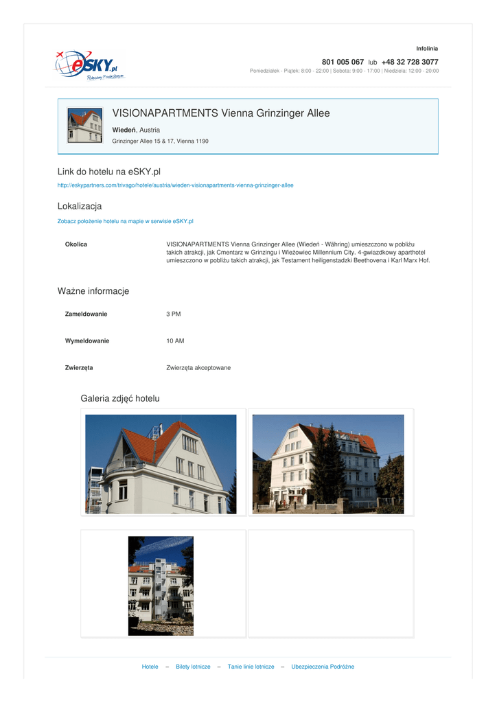 Infolinia 801 005 067 lub +48 32 728 3077 Poniedziałek - Piątek: 8:00 - 22:00 | Sobota: 9:00 - 17:00 | Niedziela: 12:00 - 20:00 VISIONAPARTMENTS Vienna Grinzinger Allee Wiedeń, Austria Grinzinger Allee 15 & 17, Vienna 1190 Link do hotelu na eSKY.pl http://eskypartners.com/trivago/hotele/austria/wieden-visionapartments-vienna-grinzinger-allee Lokalizacja Zobacz położenie hotelu na mapie w serwisie eSKY.pl Okolica VISIONAPARTMENTS Vienna Grinzinger Allee (Wiedeń - Währing) umieszczono w pobliżu takich atrakcji, jak Cmentarz w Grinzingu i Wieżowiec Millennium City. 4-gwiazdkowy aparthotel umieszczono w pobliżu takich atrakcji, jak Testament heiligenstadzki Beethovena i Karl Marx Hof. Ważne informacje Zameldowanie 3 PM Wymeldowanie 10 AM Zwierzęta Zwierzęta akceptowane Galeria zdjęć hotelu Hotele – Bilety lotnicze – Tanie linie lotnicze – Ubezpieczenia Podróżne