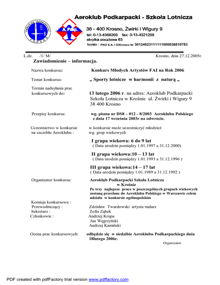 PKO S.A. I O/Krosno Nr L.dz. 30124023111111000038810783 /1/ M/ Krosno, dnia 27.12.2005r. Zawiadomienie – informacja. Nazwa konkursu: Temat konkursu: Termin nadsyłania prac konkursowych do: Przepisy konkursu: Uczestnictwo w konkursie na szczeblu Aeroklubu : Konkurs Młodych Artystów FAI na Rok 2006 „ Sporty lotnicze w harmonii z naturą „ 13 lutego 2006 r. na adres: Aeroklub Podkarpacki Szkoła Lotnicza w Krośnie ul. Żwirki i Wigury 9 38 400 Krosno wg. pisma nr DS8 – 012 - 8/2003 Aeroklubu Polskiego z dnia 17 września 2003r na odwrocie. w konkursie może uczestniczyć młodzież wg. grup wiekowych I grupa wiekowa: 6 do 9 lat ( Data urodzin pomiędzy 1.01.1997 a 31.12.2000) II grupa wiekowa:10 – 13 lat ( Data urodzin pomiędzy 1.01.1993 a 31.12.1996 ) III grupa wiekowa:14 – 17 lat ( Data urodzin pomiędzy 1.01.1989 a 31.12.1992 ) Organizator konkursu: Aeroklub Podkarpacki Szkoła Lotnicza w Krośnie Po trzy najlepsze prace w poszczególnych grupach wiekowych zostaną przesłane do Aeroklubu Polskiego w Warszawie celem udziału w konkursie ogólnopolskim Komisja konkursowa : Przewodniczący : Sekretarz : Członkowie : Ocena prac konkursowych: Zdzisław Twardowski artysta malarz Zofia Ząbek Andrzej Krupa Jan Węgrzyński Andrzej Kamiński odbędzie się w siedzibie Aeroklubu Podkarpackiego dnia 18lutego 2006r. Organizator PDF created with pdfFactory trial version www.pdffactory.com REGULAMIN KONKURSU MŁODYCH ARTYSTÓW NA ROK 2006 Międzynarodowej Federacji Lotniczej FAI 1. Prawo uczestnictwa Wszystkie dzieci w grupach wiekowych wyszczególnionych poniżej zachęca się do udziału w konkursie, nawet jeśli nie są członkami Aeroklubów Narodowych ( Regionalnych ) zrzeszonych w FAI. 2. Grupy wiekowe Zgłoszone prace będą oceniane w 3 grupach wiekowych ( w zależności od wieku autora pracy na dzień 31.12.2006 roku) I grup a wiekowa: 6 do 9 lat ( Data urodzin pomiędzy 1.01.1997 a 31.12.2000) II grupa wiekowa:10 – 13 lat ( Data urodzin pomiędzy 1.01.1993 a 31.12.1996 ) III grupa wiekowa:14 – 17 lat ( Data urodzin pomiędzy 1.01.1989 a 31.12.1992 ) 3. Format Wymagany jest format A3(297X420 mm lub11,75 X 16 cali) lub, jeśli wyżej wymieniony format jest nieosiągalny w Waszym kraju, format najbardziej zbliżony do podanego. Praca nie może być oprawiona w ramkę lub otoczona marginesem ( krawędziami brzegiem, obwódką, lamówką). 4. Wykonanie Cała praca musi być wykonana ręcznie ( lub w przypadku osób niepełnosprawnych stopą lub ustami). Pracę można wykonać: • Farbami wodnymi • farbami akrylowymi • farbami olejnymi • ołówkami nieścieralnymi • flamastrami lub markerami • piórami kulkowymi • tuszem lub trwałym atramentem • pastelami, kredkami lub innymi podobnymi, trwałymi technikami. Praca nie morze być wykonana: • • • Ołówkiem, węglem do rysowania lub innymi nietrwałym środkiem przy użyciu technik komputerowych nie może być to „ kolaż „ z wykorzystaniem zdjęć i fotokopii 5. Oznakowanie Na odwrocie pracy należy wyraźnie napisać dane autora: a) tytuł b) nazwisko c) imię d) datę urodzenia e) aeroklub regionalny f) nazwę i adres szkoły, do której dziecko uczęszcza g) oświadczenie autentyczności 6. Oświadczenie autentyczności. Oświadczenie ma być sformułowane jak niżej i napisane w języku angielskim: „I / We certify that this is the original and unassisted work of ……………….” “ Niniejszym poświadczam ( poświadczamy ), że jest to oryginalna I wykonana samodzielnie praca ………….” ( miejsce kropek proszę wpisać imię i nazwisko autora pracy ). Oświadczenie musi być podpisane przez nauczyciela, rodzica lub opiekuna, albo inną właściwą osobę. 7.Adres nadsyłania prac Prace mają być nadsyłane do organizatora konkursu w danym kraju Aeroklub Podkarpacki Szkoła Lotnicza Krosno, a nie bezpośrednio do FAI. Praca będą oceniane przez Międzynarodową Komisję pod warunkiem , że zostaną przesłane przez członków FAI na adres biura w Lozannie, w wyznaczonym terminie PDF created with pdfFactory trial version www.pdffactory.com