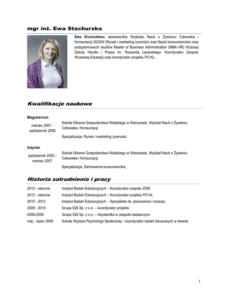 mgr inż. Ewa Stachurska EWA STACHURSKA: absolwentka Wydziału Nauk o Żywieniu Człowieka i Konsumpcji SGGW (Rynek i marketing żywności oraz Nauki konsumenckie) oraz podyplomowych studiów Master of Business Administration (MBA HR) Wyższej Szkoły Handlu i Prawa im. Ryszarda Łazarskiego. Koordynator Zespołu Wczesnej Edukacji oraz koordynator projektu PO KL. Kwalifikacje naukowe Magisterium marzec 2007 październik 2008 Szkoła Główna Gospodarstwa Wiejskiego w Warszawie, Wydział Nauk o Żywieniu Człowieka i Konsumpcji Specjalizacja: Rynek i marketing żywności, Inżynier październik 2003 marzec 2007 Szkoła Główna Gospodarstwa Wiejskiego w Warszawie, Wydział Nauk o Żywieniu Człowieka i Konsumpcji Specjalizacja: Zachowania konsumenckie, Historia zatrudnienia i pracy 2013 - obecnie Instytut Badań Edukacyjnych – Koordynator zespołu ZWE 2012 - obecnie Instytut Badań Edukacyjnych – Koordynator projektu PO KL 2010 - 2012 Instytut Badań Edukacyjnych – Specjalista ds. planowania i rozwoju 2009 - 2010 Grupa IQS Sp. z o.o. – koordynator projektu 2008-2009 Grupa IQS Sp. z o.o. – Asystentka w zespole badawczym maj – lipiec 2009 Szkoła Wyższa Psychologii Społecznej – koordynator badań fokusowych w terenie 1