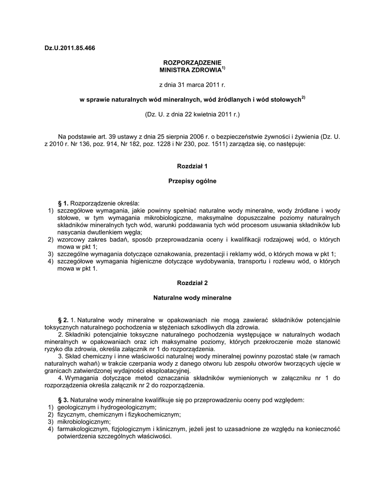Dz.U.2011.85.466 ROZPORZĄDZENIE 1) MINISTRA ZDROWIA z dnia 31 marca 2011 r. w sprawie naturalnych wód mineralnych, wód źródlanych i wód stołowych 2) (Dz. U. z dnia 22 kwietnia 2011 r.) Na podstawie art. 39 ustawy z dnia 25 sierpnia 2006 r. o bezpieczeństwie żywności i żywienia (Dz. U. z 2010 r. Nr 136, poz. 914, Nr 182, poz. 1228 i Nr 230, poz. 1511) zarządza się, co następuje: Rozdział 1 Przepisy ogólne § 1. Rozporządzenie określa: 1) szczegółowe wymagania, jakie powinny spełniać naturalne wody mineralne, wody źródlane i wody stołowe, w tym wymagania mikrobiologiczne, maksymalne dopuszczalne poziomy naturalnych składników mineralnych tych wód, warunki poddawania tych wód procesom usuwania składników lub nasycania dwutlenkiem węgla; 2) wzorcowy zakres badań, sposób przeprowadzania oceny i kwalifikacji rodzajowej wód, o których mowa w pkt 1; 3) szczególne wymagania dotyczące oznakowania, prezentacji i reklamy wód, o których mowa w pkt 1; 4) szczegółowe wymagania higieniczne dotyczące wydobywania, transportu i rozlewu wód, o których mowa w pkt 1. Rozdział 2 Naturalne wody mineralne § 2. 1. Naturalne wody mineralne w opakowaniach nie mogą zawierać składników potencjalnie toksycznych naturalnego pochodzenia w stężeniach szkodliwych dla zdrowia. 2. Składniki potencjalnie toksyczne naturalnego pochodzenia występujące w naturalnych wodach mineralnych w opakowaniach oraz ich maksymalne poziomy, których przekroczenie może stanowić ryzyko dla zdrowia, określa załącznik nr 1 do rozporządzenia. 3. Skład chemiczny i inne właściwości naturalnej wody mineralnej powinny pozostać stałe (w ramach naturalnych wahań) w trakcie czerpania wody z danego otworu lub zespołu otworów tworzących ujęcie w granicach zatwierdzonej wydajności eksploatacyjnej. 4. Wymagania dotyczące metod oznaczania składników wymienionych w załączniku nr 1 do rozporządzenia określa załącznik nr 2 do rozporządzenia. 1) 2) 3) 4) § 3. Naturalne wody mineralne kwalifikuje się po przeprowadzeniu oceny pod względem: geologicznym i hydrogeologicznym; fizycznym, chemicznym i fizykochemicznym; mikrobiologicznym; farmakologicznym, fizjologicznym i klinicznym, jeżeli jest to uzasadnione ze względu na konieczność potwierdzenia szczególnych właściwości. § 4. 1. Ocena i kwalifikacja rodzajowa wody jako naturalnej wody mineralnej są przeprowadzane na podstawie: 1) dokumentacji hydrogeologicznej dotyczącej otworu, z którego czerpana jest woda, opracowanej zgodnie z art. 42 ustawy z dnia 4 lutego 1994 r. - Prawo geologiczne i górnicze (Dz. U. z 2005 r. Nr 3) 228, poz. 1947, z późn. zm. ); 2) określenia obszaru ochrony bezpośredniej i pośredniej ujęcia wody oraz innych środków jego ochrony przed zanieczyszczeniami; 3) zatwierdzonych zasobów eksploatacyjnych ujęcia; 4) temperatury wody pobranej z ujęcia oraz temperatury otoczenia w czasie pobierania próbek wody do badań, o których mowa w ust. 3; 5) związków między warunkami geologicznymi i rodzajem składników mineralnych występujących w wodzie. 2. Niezależnie od danych określonych w ust. 1, wymagane jest przedstawienie wyników następujących analiz chemicznych i pomiarów fizykochemicznych: 1) ilości pobieranej wody u źródła; 2) suchej pozostałości w temperaturze 180°C i 260°C; 3) przewodności lub oporności elektrycznej w określonej temperaturze pomiaru; 4) stężenia jonów wodorowych (pH); 5) zawartości anionów i kationów; 6) zawartości składników niezjonizowanych; 7) zawartości pierwiastków śladowych; 8) radioaktywności wody przy ujęciu; 16 18 9) izotopów tlenu ( O- O) i wodoru (prot - wodór lekki, deuter - wodór ciężki, tryt - wodór promieniotwórczy) i proporcji pomiędzy tymi izotopami, jeżeli jest to konieczne dla ustalenia pochodzenia oznaczonej globalnej radioaktywności; 10) wykluczających obecność organicznych składników antropogenicznych, takich jak: pestycydy, detergenty, wielopierścieniowe węglowodory aromatyczne, polichlorowane bifenyle. 3. Badania mikrobiologiczne wody przy ujęciu mają na celu: 1) wykluczenie obecności: a) pasożytów i drobnoustrojów chorobotwórczych, b) bakterii z grupy coli w 250 ml w temperaturze 37°C, c) Escherichia coli w 250 ml w temperaturze 44,5°C, d) paciorkowców kałowych w 250 ml, e) Clostridia redukujących siarczyny (łącznie z przetrwalnikami) w 50 ml, f) Pseudomonas aeruginosa w 250 ml; 2) określenie ogólnej liczby bakterii w 1 ml wody: a) w temperaturze 20-22°C w czasie 72 godzin w ilości nie większej niż 20 wyhodowanych na agarze lub mieszance agaru i żelatyny, b) 37°C w czasie 24 godzin w ilości nie większej niż 5 wyhodowanych na agarze. 4. Wzrost ogólnej liczby bakterii wyhodowanych na agarze lub mieszance agaru i żelatyny w wodzie rozlanej do butelek nie może być wynikiem zanieczyszczenia wody w procesie produkcji i nie powinien przekraczać 100 w 1 ml wody w temperaturze 20-22°C po 72 godzinach i 20 w 1 ml w temperaturze 37°C po 24 godzinach. Pomiar ogólnej liczby bakterii wykonywany jest w czasie do 12 godzin od rozlania wody do opakowań, przechowywanej w temperaturze 4°C. 5. Woda wprowadzana do obrotu w opakowaniu musi spełniać wymagania mikrobiologiczne określone w ust. 3 pkt 1 i nie może wykazywać żadnych negatywnych cech organoleptycznych. Ogólna liczba bakterii, o których mowa w ust. 4, namnażających się w naturalnej wodzie mineralnej może wynikać tylko z normalnego wzrostu liczby bakterii, które znajdowały się w niej przy pobraniu z ujęcia. 6. Wzorcowy zakres badań naturalnych wód mineralnych określa załącznik nr 3 do rozporządzenia. 7. Kryteria klasyfikacji naturalnych wód mineralnych, wód źródlanych i wód stołowych według pochodzenia i stopnia nasycenia dwutlenkiem węgla określa załącznik nr 4 do rozporządzenia. § 5. 1. Badania kliniczne i farmakologiczne, o których mowa w § 3 pkt 4, obejmują badania wykonane uznan