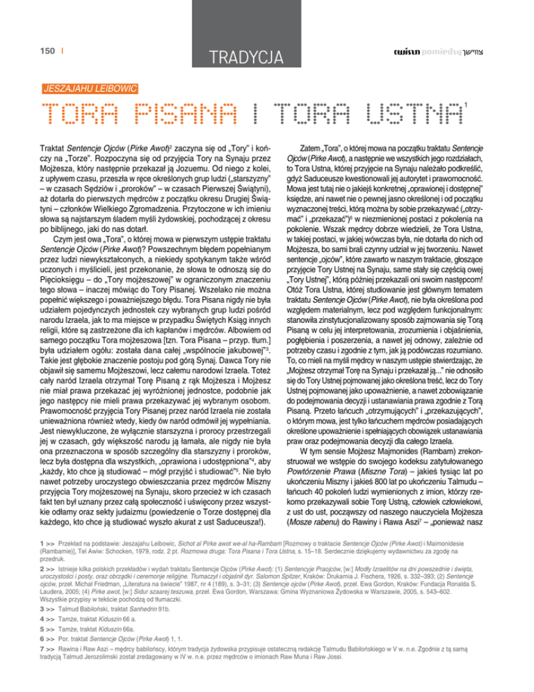 150 tradycja Jeszajahu Leibowic Traktat Sentencje Ojców (Pirke Awot)2 zaczyna się od „Tory” i kończy na „Torze”. Rozpoczyna się od przyjęcia Tory na Synaju przez Mojżesza, który następnie przekazał ją Jozuemu. Od niego z kolei, z upływem czasu, przeszła w ręce określonych grup ludzi („starszyzny” – w czasach Sędziów i „proroków” – w czasach Pierwszej Świątyni), aż dotarła do pierwszych mędrców z początku okresu Drugiej Świątyni – członków Wielkiego Zgromadzenia. Przytoczone w ich imieniu słowa są najstarszym śladem myśli żydowskiej, pochodzącej z okresu po biblijnego, jaki do nas dotarł. Czym jest owa „Tora”, o której mowa w pierwszym ustępie traktatu Sentencje Ojców (Pirke Awot)? Powszechnym błędem popełnianym przez ludzi niewykształconych, a niekiedy spotykanym także wśród uczonych i myślicieli, jest przekonanie, że słowa te odnoszą się do Pięcioksięgu – do „Tory mojżeszowej” w ograniczonym znaczeniu tego słowa – inaczej mówiąc do Tory Pisanej. Wszelako nie można popełnić większego i poważniejszego błędu. Tora Pisana nigdy nie była udziałem pojedynczych jednostek czy wybranych grup ludzi pośród narodu Izraela, jak to ma miejsce w przypadku Świętych Ksiąg innych religii, które są zastrzeżone dla ich kapłanów i mędrców. Albowiem od samego początku Tora mojżeszowa [tzn. Tora Pisana – przyp. tłum.] była udziałem ogółu: została dana całej „wspólnocie jakubowej”3. Takie jest głębokie znaczenie postoju pod górą Synaj. Dawca Tory nie objawił się samemu Mojżeszowi, lecz całemu narodowi Izraela. Toteż cały naród Izraela otrzymał Torę Pisaną z rąk Mojżesza i Mojżesz nie miał prawa przekazać jej wyróżnionej jednostce, podobnie jak jego następcy nie mieli prawa przekazywać jej wybranym osobom. Prawomocność przyjęcia Tory Pisanej przez naród Izraela nie została unieważniona również wtedy, kiedy ów naród odmówił jej wypełniania. Jest niewykluczone, że wyłącznie starszyzna i prorocy przestrzegali jej w czasach, gdy większość narodu ją łamała, ale nigdy nie była ona przeznaczona w sposób szczególny dla starszyzny i proroków, lecz była dostępna dla wszystkich, „oprawiona i udostępniona”4, aby „każdy, kto chce ją studiować – mógł przyjść i studiować”5. Nie było nawet potrzeby uroczystego obwieszczania przez mędrców Miszny przyjęcia Tory mojżeszowej na Synaju, skoro przecież w ich czasach fakt ten był uznany przez całą społeczność i uświęcony przez wszystkie odłamy oraz sekty judaizmu (powiedzenie o Torze dostępnej dla każdego, kto chce ją studiować wyszło akurat z ust Saduceusza!). Zatem „Tora”, o której mowa na początku traktatu Sentencje Ojców (Pirke Awot), a następnie we wszystkich jego rozdziałach, to Tora Ustna, której przyjęcie na Synaju należało podkreślić, gdyż Saduceusze kwestionowali jej autorytet i prawomocność. Mowa jest tutaj nie o jakiejś konkretnej „oprawionej i dostępnej” księdze, ani nawet nie o pewnej jasno określonej i od początku wyznaczonej treści, którą można by sobie przekazywać („otrzymać” i „przekazać”)6 w niezmienionej postaci z pokolenia na pokolenie. Wszak mędrcy dobrze wiedzieli, że Tora Ustna, w takiej postaci, w jakiej wówczas była, nie dotarła do nich od Mojżesza, bo sami brali czynny udział w jej tworzeniu. Nawet sentencje „ojców”, które zawarto w naszym traktacie, głoszące przyjęcie Tory Ustnej na Synaju, same stały się częścią owej „Tory Ustnej”, którą później przekazali oni swoim następcom! Otóż Tora Ustna, której studiowanie jest głównym tematem traktatu Sentencje Ojców (Pirke Awot), nie była określona pod względem materialnym, lecz pod względem funkcjonalnym: stanowiła zinstytucjonalizowany sposób zajmowania się Torą Pisaną w celu jej interpretowania, zrozumienia i objaśnienia, pogłębienia i poszerzenia, a nawet jej odnowy, zależnie od potrzeby czasu i zgodnie z tym, jak ją podówczas rozumiano. To, co mieli na myśli mędrcy w naszym ustępie stwierdzając, że „Mojżesz otrzymał Torę na Synaju i przekazał ją...” nie odnosiło się do Tory Ustnej pojmowanej jako określona treść, lecz do Tory Ustnej pojmowanej jako upoważnienie, a nawet zobowiązanie do podejmowania decyzji i ustanawiania prawa zgodnie z Torą Pisaną. Przeto łańcuch „otrzymujących” i „przekazujących”, o którym mowa, jest tylko łańcuchem mędrców posiadających określone upoważnienie i spełniających obowiązek ustanawiania praw oraz podejmowania decyzji dla całego Izraela. W tym sensie Mojżesz Majmonides (Rambam) zrekonstruował we wstępie do swojego kodeksu zatytułowanego Powtórzenie Prawa (Miszne Tora) – jakieś tysiąc lat po ukończeniu Miszny i jakieś 800 lat po ukończeniu Talmudu – łańcuch 40 pokoleń ludzi wymienionych z imion, którzy rzekomo przekazywali sobie Torę Ustną, człowiek człowiekowi, z ust do ust, począwszy od naszego nauczyciela Mojżesza (Mosze rabenu) do Rawiny i Rawa Aszi7 – „ponieważ nasz 1 >> Przekład na podstawie: Jeszajahu Leibowic, Sichot al Pirke awot we-al ha-Rambam [Rozmowy o traktacie Sentencje Ojców (Pirke Awot) i Maimonidesie (Rambamie)], Tel Awiw: Schocken, 1979, rodz. 2 pt. Rozmowa druga: Tora Pisana i Tora Ustna, s. 15–18. Serdecznie dziękujemy wydawnictwu za zgodę na przedruk. 2 >> Istnieje kilka polskich przekładów i wydań traktatu Sentencje Ojców (Pirke Awot): (1) Sentencyje Praojców, [w:] Modły Izraelitów na dni powszednie i święta, uroczystości i posty, oraz obrządki i ceremonje religijne. Tłumaczył i objaśnił dyr. Salomon Spitzer, Kraków: Drukarnia J. Fischera, 1926, s. 332–393; (2) Sentencje ojców, przeł. Michał Friedman, „Literatura na świecie” 1987, nr 4 (189), s. 3–31; (3) Sentencje ojców (Pirke Awot), przeł. Ewa Gordon, Kraków: Fundacja Ronalda S. Laudera, 200