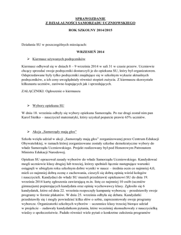 SPRAWOZDANIE Z DZIAŁALNOŚCI SAMORZĄDU UCZNIOWSKIEGO ROK SZKOLNY 2014/2015 Działania SU w poszczególnych miesiącach: WRZESIEŃ 2014 Kiermasz używanych podręczników Kiermasz odbywał się w dniach 8 – 9 września 2014 w sali 31 w czasie przerw. Uczniowie chcący sprzedać swoje podręczniki dostarczyli je do opiekuna SU, który był organizatorem. Odsprzedawane były tylko podręczniki znajdujące się w szkolnym wykazie aktualnych podręczników, a ich ceny uwzględniały również stopień zużycia. Z kiermaszu skorzystało kilkunastu uczniów, zarówno kupujących jak i sprzedających. ZAŁĄCZNIKI: Ogłoszenie o kiermaszu Wybory opiekuna SU W dniu 18. września odbyły się wybory opiekuna Samorządu. Po raz drugi został nim pan Karol Sieńko – nauczyciel matematyki, który uzyskał poparcie prawie 65% uczniów. Akcja „Samorządy mają głos” Szkoła wzięła udział w akcji „Samorządy mają głos” zorganizowanej przez Centrum Edukacji Obywatelskiej, w ramach której zorganizowane zostały szkolne demokratyczne wybory do władz Samorządu Uczniowskiego. Projekt realizowany był pod Honorowym Patronatem Ministra Edukacji Narodowej. Opiekun SU opracował zasady wyborów do władz Samorządu Uczniowskiego. Kandydować mogli uczniowie klasy drugiej lub trzeciej, którzy spełniali łącznie następujące warunki: osiągnęli w ubiegłym roku szkolnym dobre wyniki w nauce – średnia ocen co najmniej 4,0, mieli co najmniej dobrą ocenę z zachowania, cieszyli się dobrą opinią wśród kolegów i nauczycieli. Kandydaci do władz SU musieli przedstawić opiekunowi SU do dnia 19. września 2014 kartę zgłoszenia zawierającą m.in. listę co najmniej 10 osób (uczniów gimnazjum) popierających kandydata oraz opinię wychowawcy klasy. Zgłosiło się 6 kandydatek, które od dnia 22. września rozpoczęły kampanię wyborczą – przedstawiły swoje programy w formie plakatów. W dniu 25. września odbyła się debata. Kandydatki przedstawiły się i mogły powiedzieć kilka słów o sobie, zaprezentowały swoje programy wyborcze. Organizatorki szkolnych wyborów – uczennice klasy trzeciej biorące udział w projekcie – zadawały kandydatkom pytania, które wcześniej skonsultowały z nauczycielką wiedzy o społeczeństwie. Padało również wiele pytań o konkretne założenia programów wyborczych kandydatek, o to w jaki sposób wyobrażają sobie one ich realizację. Następnie każdy przebywający w sali mógł zadawać własne pytania. Dyskusja była gorąca i owocna. Debatę moderował opiekun SU - pan Karol Sieńko. Spotkanie przebiegało w miłej atmosferze i umożliwiło społeczności uczniowskiej bardziej szczegółowe zapoznanie się z wizjami działania poszczególnych kandydatek. Zespół złożony z uczennic klasy trzeciej przygotował urnę wyborczą, skserował karty wyborcze, które zostały opatrzone pieczęcią szkoły. Rozwieszono plakaty profrekwencyjne otrzymane pocztą od CEO. W dniu 30. września 2014 pracownia matematyczna nr 31 zmieniła się w lokal wyborczy, który otwarto godzinie 7:45. Uczniowie mogli odczuć klimat jaki towarzyszy wyborom. Sala wyposażona była w specjalnie przygotowaną urnę, która mogła pomieścić wszystkie wrzucone karty do głosowania. Nie zabrakło też parawanów zapewniających tajność głosowania. Miejsca za osłonami wyposażone były w przybory do pisania oraz plakaty informujące o sposobie głosowania. Nad sprawnym przebiegiem wyborów czuwała powołana komisja wyborcza (zespół projektowy). Porządek zapewniał ochroniarz – Dominika z klasy IIB. Wyborcy, którzy przychodzili do lokalu w czasie przerw otrzymywali opieczętowaną kartę do głosowania. Potwierdzali ten fakt własnoręcznym podpisem przy nazwisku na liście wyborców przy stoliku komisji. Następnie w warunkach zapewniających dyskrecję oddawali swój głos i kartę wrzucali do urny. Głosowanie zakończono o godzinie 13:45. Komisja otworzyła urnę i przystąpiła do obliczania wyników. Sporządzono protokół w trzech jednakowych egzemplarzach, a informację o rezultacie wywieszono na tablicy informacyjnej przy pokoju nauczycielskim. Frekwencja wyniosła 75,3%. Oddano 131 głosów, z których 119 było ważnych. Przewodniczącą Samorządu Uczniowskiego została uczennica klasy trzeciej – Izabela Dryl – która zdobyła poparcie 36 wyborców. Funkcję wiceprzewodniczącej objęła Gabriela Mazur (klasa druga), na którą zagłosowały tylko o dwie osoby mniej. We władzach SU znalazło się jeszcze miejsce dla sekretarza. Została nim Gabriela Kuźmicka. Głosowało na nią 19 wyborców. ZAŁĄCZNIKI: Zasady wyborów, Karta zgłoszenia kandydata, Lista kandydatów, Karta wyborcza, Kserokopia protokołu wyników wyborów PAŹDZIERNIK 2014 Organizacja DNIA BEZ PRZEMOCY Samorząd Uczniowski włączył się czynnie w obchody Międzynarodowego Dnia Bez Przemocy. 2. października 2014. o godzinie 8:00 krótki apel poprowadziła pani pedagog. W jego trakcie wytypowani wcześniej w klasach uczniowie (wzory zachowania) otrzymali dyplomy. Wszyscy przyszli ubrani na biało (lub ze znaczącym elementem stroju w kolorze białym). Uczniowie, którzy spełnili ten warunek nie byli tego dnia pytani, ani nie pisali kartkówek. Natomiast klasa, w której 100% uczniów była przebranych nie miała w piątek nic zadanego na weekend. W ciągu całego tygodnia na godzinach wychowawczych każda klasa miała za zadanie wykonać duży i czytelny transparent z hasłem propagującym: przyjaźń, życzliwość, pokój, tolerancję, wzajemną akceptację (do wyboru). O godzinie 13:00 wszystkie klasy, które wykonały transparenty wyszły ze szkoły na pokojową manifestację ulicami Turośni Kościelnej. Wszyscy dostali też kolorowe baloniki, które nieśli lub przyczepili do ubrania. ZAŁĄCZNIKI: Projekt certyfikatu osoby, która nie akceptuje przemocy Akademia z okazji Dnia Komisji Edukacji Narodowej Opiekun SU pan Karol Sieńko przy współprac