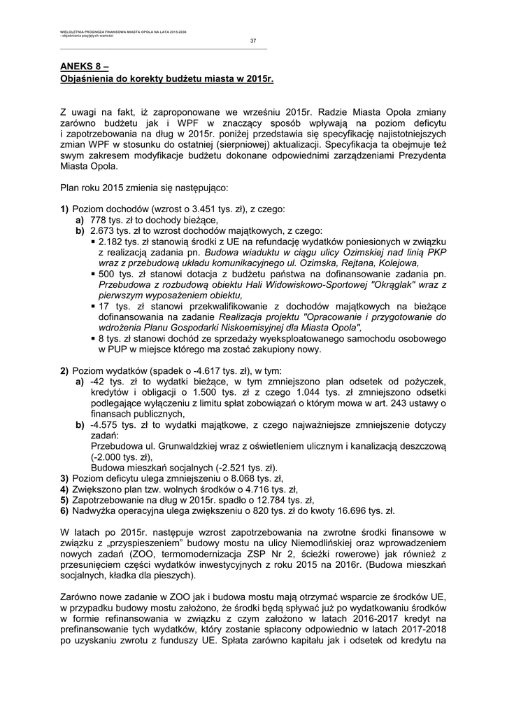 WIELOLETNIA PROGNOZA FINANSOWA MIASTA OPOLA NA LATA 2015-2036 - objaśnienia przyjętych wartości 37 _________________________________________________________________________ ANEKS 8 – Objaśnienia do korekty budżetu miasta w 2015r. Z uwagi na fakt, iż zaproponowane we wrześniu 2015r. Radzie Miasta Opola zmiany zarówno budżetu jak i WPF w znaczący sposób wpływają na poziom deficytu i zapotrzebowania na dług w 2015r. poniżej przedstawia się specyfikację najistotniejszych zmian WPF w stosunku do ostatniej (sierpniowej) aktualizacji. Specyfikacja ta obejmuje też swym zakresem modyfikacje budżetu dokonane odpowiednimi zarządzeniami Prezydenta Miasta Opola. Plan roku 2015 zmienia się następująco: 1) Poziom dochodów (wzrost o 3.451 tys. zł), z czego: a) 778 tys. zł to dochody bieżące, b) 2.673 tys. zł to wzrost dochodów majątkowych, z czego: 2.182 tys. zł stanowią środki z UE na refundację wydatków poniesionych w związku z realizacją zadania pn. Budowa wiaduktu w ciągu ulicy Ozimskiej nad linią PKP wraz z przebudową układu komunikacyjnego ul. Ozimska, Rejtana, Kolejowa, 500 tys. zł stanowi dotacja z budżetu państwa na dofinansowanie zadania pn. Przebudowa z rozbudową obiektu Hali Widowiskowo-Sportowej "Okrąglak" wraz z pierwszym wyposażeniem obiektu, 17 tys. zł stanowi przekwalifikowanie z dochodów majątkowych na bieżące dofinansowania na zadanie Realizacja projektu "Opracowanie i przygotowanie do wdrożenia Planu Gospodarki Niskoemisyjnej dla Miasta Opola", 8 tys. zł stanowi dochód ze sprzedaży wyeksploatowanego samochodu osobowego w PUP w miejsce którego ma zostać zakupiony nowy. 2) Poziom wydatków (spadek o -4.617 tys. zł), w tym: a) -42 tys. zł to wydatki bieżące, w tym zmniejszono plan odsetek od pożyczek, kredytów i obligacji o 1.500 tys. zł z czego 1.044 tys. zł zmniejszono odsetki podlegające wyłączeniu z limitu spłat zobowiązań o którym mowa w art. 243 ustawy o finansach publicznych, b) -4.575 tys. zł to wydatki majątkowe, z czego najważniejsze zmniejszenie dotyczy zadań: Przebudowa ul. Grunwaldzkiej wraz z oświetleniem ulicznym i kanalizacją deszczową (-2.000 tys. zł), Budowa mieszkań socjalnych (-2.521 tys. zł). 3) Poziom deficytu ulega zmniejszeniu o 8.068 tys. zł, 4) Zwiększono plan tzw. wolnych środków o 4.716 tys. zł, 5) Zapotrzebowanie na dług w 2015r. spadło o 12.784 tys. zł, 6) Nadwyżka operacyjna ulega zwiększeniu o 820 tys. zł do kwoty 16.696 tys. zł. W latach po 2015r. następuje wzrost zapotrzebowania na zwrotne środki finansowe w związku z „przyspieszeniem” budowy mostu na ulicy Niemodlińskiej oraz wprowadzeniem nowych zadań (ZOO, termomodernizacja ZSP Nr 2, ścieżki rowerowe) jak również z przesunięciem części wydatków inwestycyjnych z roku 2015 na 2016r. (Budowa mieszkań socjalnych, kładka dla pieszych). Zarówno nowe zadanie w ZOO jak i budowa mostu mają otrzymać wsparcie ze środków UE, w przypadku budowy mostu założono, że środki będą spływać już po wydatkowaniu środków w formie refinansowania w związku z czym założono w latach 2016-2017 kredyt na prefinansowanie tych wydatków, który zostanie spłacony odpowiednio w latach 2017-2018 po uzyskaniu zwrotu z funduszy UE. Spłata zarówno kapitału jak i odsetek od kredytu na WIELOLETNIA PROGNOZA FINANSOWA MIASTA OPOLA NA LATA 2015-2036 - objaśnienia przyjętych wartości 38 _________________________________________________________________________ prefinansowanie podlega wyłączeniu ze wskaźnika z art. 243 ustawy o finansach publicznych. Proponowana we wrześniu zmiana powoduje, że skumulowane zapotrzebowanie na nowy dług w latach 2015-2018 (bez uwzględnienia kredytu na prefinansowanie) spada o 1.724 tys. zł. Wskaźniki planowanej łącznej spłaty zobowiązań, jak i górny limit spłat o których mowa w art. 243 ustawy o finansach publicznych zmieniają się nieznacznie (zmiana nie przekracza 0,1%), a zmiany powodowane są przede wszystkim różnicą na poziomie dochodów ogółem.