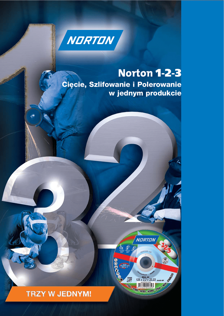 Norton 1-2-3 Cięcie, Szlifowanie i Polerowanie w jednym produkcie NORTON 1-2-3 TO TRZY APLIKACJE W JEDNYM PRODUKCI NORTON 1-2-3 Od przecinania do polerowania używając jednej tarczy! Cięcie, lekkie szlifowanie i polerowanie! Wszystkie aplikacje wykonywane jedną tarczą. Niemożliwe? Już tak! Dzięki zastosowaniu unikalnego 3 warstwowego wzmocnienia mechanicznego w połączeniu z odpowiednio dobranym ziarnem, w nowej tarczy Norton 1-2-3, niemożliwe staje się możliwe. W końcu możemy zapomnieć o ciągłej wymianie tarcz ściernych w zależności od wykonywanej aplikacji. Użyte materiały ścierne są bardzo agresywne oraz poddawane zabiegom termicznym i fizycznym w celu uzyskania perfekcyjnej struktury tarczy ściernej. Nowa ściernica Norton 1-2-3 przecina łatwo i czysto płyty, rury i inne kształty wykonane ze stali i stali nierdzewnej (inox). Lekkie prace szlifierskie, przy użyciu ściernicy 1-2-3, wykonywane są z łatwością i dokładnością, pozostawiając gładką i czystą powierzchnię. Maksymalne bezpieczeństwo jest osiągnięte poprzez zastosowanie 3 wzmocnień mechanicznych. Specyfikacja Norton 1-2-3 Numer produktu 90º 90º 30º30º30º 30º30º30º Index Kod EAN produktu Wymiary Specyfikacja m/s 66252829704 566626 3157625666269 115x2,2x22,23 A 46 S-BF 80 25 66252921592 564680 3157625646803 125x2,2x22,23 A 46 S-BF 80 25 15º 15º Zalety produktu Norton 1-2-3 • cięcie, lekkie szlifowanie i polerowanie przy użyciu jednej ściernicy • eliminacja straconego czasu wynikającego z konieczności wymiany ściernic przy różnych aplikacjach • doskonałe i jednolite wykończenie dzięki drobnej granulacji ziarna • ekstremalna żywotność w porównaniu z konwencjonalnymi ściernicami • niskie wibracje; komfortowa praca • nie zawiera żelaza, siarki i chloru • bardzo gładka i czysta powierzchnia szlifowana • jest to produkt Norton, czyli jakość gwarantowana Drobna granulacja ziarna zapewnia doskonałe i jednolite wykończenie obrabianej powierzchni. Maksymalne bezpieczeństwo dzięki 3 warstwom mocnego włókna szklanego. Norton 1-2-3 opis etykiety Zastosowanie Czerwony pasek prędkości = 80 m/s Maksymalna prędkość robocza Piktogramy bezpieczeństwa Średnica x grubość x otwór Numer produktu: używany przy zamawianiu Zalecanie zastosowanie Stal Nierdzewna Stal Stosować słuchawki Stosować okulary ochronne Piktogramy bezpieczeństwa Stosować maskę Stosować rękawice ochronne Przed użyciem zapoznaj się z instrukcją Nie zawiera żelaza, siarki lub chloru Nie używać uszkodzonej ściernicy Przetestuj sam! Aby wypróbować ściernice Norton 1-2-3, skontaktuj się z najbliższym dystrybutorem marki Norton. Saint-Gobain Abrasives Sp. z o.o. ul. Toruńska 239/241 62-600 Koło www.fepa-abrasives.org tel. Centrala: (+48 63) 26 17 100 fax: (+48 63) 27 20 401 Bezpieczeństwo pracowników wykorzystujących narzędzia ścierne jest nadrzędnym celem firmy Saint-Gobain spełniają międzynarodowe standardy bezpieczeństwa OSA. Dodatkowo firma Saint-Gobain Abrasives posiada Zintegrowany System Zarządzania certyfikowany według norm PN-ISO 9001, PN-ISO 14001 oraz PN-N-18001. Form # 1178 Abrasives. Wszystkie nasze wyroby są rozwijane, testowane i wytwarzane zgodnie z Europejską Normą EN-12413 i e-mail: [email protected] www.saint-gobain.abrasives.com.pl