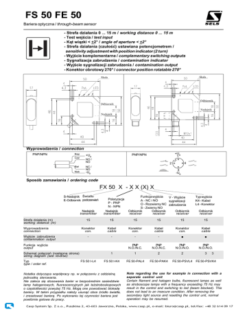 FS 50 FE 50 Bariera optyczna / through-beam sensor - Strefa dzia³ania 0 ... 15 m / working distance 0 ... 15 m - Test wejcia / test input - K¹t wi¹zki < +2° / angle of aperture < +2° - Strefa dzia³ania (czu³oæ) ustawiana potencjometrem / sensitivity adjustment with position indicator (2 turn) - Wyjcie komplementarne / complementary switching outputs - Sygnalizacja zabrudzenia / contamination indicator - Wyjcie sygnalizacji zabrudzenia / contamination output - Konektor obrotowy 270° / connector position rotatable 270° Skala Skala Odbiornik Odbiornik Nadajnik Nadajnik Wyprowadzenia / connection PNP/NPN Br¹z Czar +UB 1 PNP/NPN +UB NO / NO Bia³ NC / NO Nieb -UB 4 2 3 -UB Sposób zamawiania / ordering code FX 50 X - X X (X) X S-Nadajnik wiat³o E-Odbiornik podczerwieñ Nadajnik transmitter Strefa dzialania (m) working distance (m) Wyprowadzenia connection Wyjcie zabrudzenia contamination output Polaryzacja P - PNP N - NPN Nadajnik transmitter Typ wyjcia K4 - Kabel L4 - Konektor Odbiornik receiver 15 15 15 15 15 15 Konektor con. Kabel cable Konektor con. Kabel cable Konektor con. Kabel cable - - - - - - PNP N.O./N.C. PNP N.O./N.C. PNP N.O./N.O. PNP N.O./N.O. 1 1 2 2 3 FS 50 I-K4 FE 50-PAL4 FE 50-PAK4 FE 50-PSVL4 FE 50-PSVK4 Funkcja wyjcia output Schemat po³¹czeñ (nastêpna strona) wiring diagram (see reverse) Typ type / order ref. Funkcja wyjcia V - Wyjcie A - NC i NO sygnalizacji O - Rozwierny NC zabrudzenia S - Zwierny NO Odbiornik Odbiornik Odbiornik receiver receiver receiver FS 50 I-L4 Notatka dotycz¹ca wspó³pracy np. w po³¹czeniu z oddzieln¹ jednostk¹ sterowania. Nie zaleca siê stosowania barier w bezporednim sasiedztwie lamp halogenowych, fluorescencyjnych jak te¿stroboskopowych o czêstotliwoci powy¿ej 75 Hz. Mog¹ one powodowaæ blokadê bariery. W takim przypadku nale¿y usun¹æ obce ród³o wiat³a, i zresetowaæ barierê. Po wykonaniu tej czynnoci bariera jest powtórnie gotowa do pracy. 3 Note regarding the use for example in connection with a separate control unit Certain filament and halogen bulbs, fluorescent lamps as well as stroboscope lamps with a frequency exceeding 75 Hz may result in the control and switching to red (beam blocked). This does not lead to an insecure condition. After removing the secondary light source and resetting the control unit, normal operation may be resumed. SELS S.J. ul. Malawskiego, 5a 02-641Warszawa, tel. (022) 848 08 42, 848 52 81, fax 848 16 48 e-mail: [email protected], http://www.sels.com.pl FS 50 FE 50 Bariera optyczna / through-beam sensor Schemat po³¹czeñ / wiring BN WH BU 1 BN 1 PNP BK 4 PNP WH 2 BU 3 +UB 2 Test 3 -UB Rys. 1 / fig. 1 +UB -UB Rys. 2 / fig. 2 PNP BN 1 BK 4 WH 2 BU 3 +UB -UB Rys. 3 / fig. 3 UTEST FS 50 Parametry optyczne / Optical data (typ.) Nadajnik = aktywny transmitter = on 10 V (on) Strefa dzia³ania: scanning range: 2V (wy³.) Max. strefa dzia³ania: maximum distance: t 0 ton OUT 1 FE 50 toff Ustawianie czu³oci: sensitivity adjustment: Rodzaj wiat³a: used light: 18 m 18 m pot. dwuobrotowy z podzia³k¹ 2 turn with indicator podczerwieñ 880 nm, pulsacyjne IR 880 nm, pulsed Norma warunów optycznych: ambient light: t 0 0 ... 15 m 0 ... 15 m EN 60947-5-2 EN 60947-5-2 K¹t wi¹zki: angle of aperture: ton, toff = max. 500 µs < +2° < +2° Wykres strefy dzia³ania / sensing range diagram Parametry elektryczne / Electrical data (typ.) Napiêcie zasilania: operating voltage: 10 ... 30 V DC 10 ... 30 V DC Max. têtnienia: max. residual ripple: 10 % 10 % Wew. zabezpieczenie przed zmian¹ polaryzacji: polarity reversal protection, short circuit protection: Pobór pr¹du bez obci¹¿enia: power consumption (no load): Funkcja wyjcia: signal output: Max pr¹d sygn. wyjciowego: output current: Parametry mechaniczne / Mechanical data tak yes Materia³ obudowy: casing material: wstrz¹soodporny ABS ABS, shock-resistant < 30 mA < 30 mA Klasa ochrony: protection standard: IP67 IP67 patrz tabela see selection table 200 mA 200 mA Temperatura pracy: ambient temperature range: -20 ... +60 °C -20 ... +60 °C Temperatura sk³adowania: storage temperature range: -20 ... +80 °C -20 ... +80 °C Kabel: cable: Czêstotliwoæ prze³¹czania (ti/tp 1:1): switching frequency (at ppp 1:1): Standardowa d³ugoæ kabla: Standard cable lenght: Odbiornik / receiver Dopuszczalny spadek napiêcia sygna³u wyjciowego: < 2,4 V voltage drop at signal output: < 2,4 V Sygnalizacja funkcji wyjcia: output signal indicator: Sygnalizacja funkcji zabrudzenia: contamination indicator: 1000 Hz 1000 Hz ¿ó³ta dioda LED yellow czerwona dioda LED red 4 x 0,25 mm2 4 x 0,25 mm2 Maksymalna dopuszczalna d³ugoæ kabla: max. permitted cable length: 100 m 100 m Konektor: connection: L4 L4 Sygnalizacja zasilania: operating voltage indicator: zielona dioda LED green Masa (wersja z konektorem): weight (plug): Sygnalizacja zadzia³ania nadajnika: operating indicator transmitter on: zielona dioda LED green Pakowane bez akcesoriów do monta¿u packaging without mounting bracket Sygnalizacja wy³¹czenia nadajnika: operating indicator transmitter off: Klasa bezpieczeñstwa: protection class: czerwona dioda LED red Odbiornik / receiver 3m 3m ca. 60 g app. 60 g Powy¿szy optyczny czujnik odbiciowy nie mo¿e byæ stosowany w aplikacjach bezpieczeñstwa lub podobnych. These Proximity Switches are not suited for safety related applications. SELS S.J. ul. Malawskiego 5a, 02-641Warszawa, tel.: (022) 848 08 42, 848 52 81, fax: 848 16 48 e-mail: [email protected], http://www.sels.com.pl