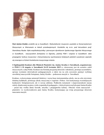 Pani Janina Kraśko urodziła się w Suwałkach. Wykształcenie muzyczne uzyskała w Konserwatorium Muzycznym w Warszawie w latach przedwojennych. Kształciła się m.in. pod kierunkiem prof. Stanisławy Raube. Była współzałożycielką i pierwszym dyrektorem Społecznego Ogniska Muzycznego w Suwałkach, nauczycielem fortepianu w Ognisku, później PSM I stopnia w Suwałkach. Jako propagator kultury muzycznej i charyzmatyczny wychowawca kolejnych pokoleń suwalczan zapisała się znacząco w historii kształcenia muzycznego miasta. I Ogólnopolski Konkurs dla Młodych Pianistów im. Janiny Kraśko w Suwałkach, organizowany w PSM I i II stopnia w Suwałkach 24-25 kwietnia 2015 r., skierowany jest do uczniów szkół muzycznych z całej Polski. Konkurs ma formułę przyjazną dzieciom i młodzieży, promuje uczestników, sprzyja wymianie doświadczeń pedagogicznych, a także ma na celu uczczenie pamięci wybitnej suwalskiej nauczycielki fortepianu, Janiny Kraśko – prekursora muzyki w Suwałkach. Konkurs, wykorzystując potencjał lokalowy i nową bazę instrumentalną szkoły, ma na celu ożywienie lokalnej dydaktyki, promocję szkoły muzycznej w regionie i Polsce. Jest kontynuacją wcześniejszych konkursów fortepianowych, ale w nowej odsłonie. Podkreśla tożsamość i niepowtarzalność naszej szkoły zbudowanej na pracy wielu wspaniałych pedagogów, z których pierwszą była pani Janina Kraśko – przed laty wielka dama Suwałk, artystka i propagatorka kultury. Obecnie wielu nauczycieli pianistów- to wychowankowie pani Janiny Kraśko, kontynuujący jej wizję przyjaznego dzieciom nauczania muzyki.