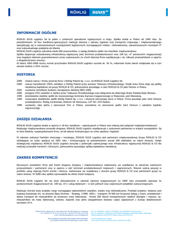 INFORMACJE OGÓLNE ROHLIG SUUS Logistics SA to jeden z czołowych operatorów logistycznych w kraju. Spółka działa w Polsce od 1990 roku. Za pośrednictwem 18 biur handlowo-operacyjnych realizuje zlecenia z zakresu logistyki oraz transportu krajowego i międzynarodowego specjalizując się w zaawansowanych rozwiązaniach logistycznych wymagających wiedzy i doświadczenia, zaawansowanych rozwiązań IT oraz indywidualnego podejścia do Klienta. ROHLIG SUUS Logistics zatrudnia około 600 pracowników, a zasięg działania spółki ma charakter międzynarodowy. Spółka dysponuje rozbudowaną infrastrukturą logistyczną (sieć terminali przeładunkowych oraz 100 tys. m2 powierzchni magazynowej) oraz bogatym taborem gwarantowanym przez wykonawców (w chwili obecnej firma współpracuje z ok. kilkuset przewoźnikami w oparciu o długoterminowe umowy). W latach 2003-2008 roczny wzrost przychodów ROHLIG SUUS Logistics wynosił ok. 36 %, natomiast liczba zleceń zwiększała się w tym okresie średnio o 35% rocznie. HISTORIA 2009 2006 2002 2000 1999 1990 1989 zmiana nazwy i formy prawnej firmy z Rohlig Poland Sp. z o.o. na ROHLIG SUUS Logistics SA. wykup menedŜerski 100% udziałów w Rohlig Poland przez prezesa Tadeusza Chmielewskiego. Dzięki temu firma staje się spółką niezaleŜną kapitałowo od grupy ROHLIG & CO, jednocześnie pozostając w sieci ROHLIG & CO jako Partner w Polsce. uzyskanie certyfikatu Systemu Zarządzania Jakością 9001:2000. przejęcie 25% udziałów w Spółce przez Tadeusza Chmielewskiego oraz dołączenie do elitarnego Klubu Polskiej Rady Biznesu. przeniesienie siedziby spółki do nowoczesnego terminalu biurowo-magazynowego w Piasecznie, pod Warszawą. rozpoczęcie działalności spółki Rohlig Poland Sp. z o.o. i otwarcie pierwszego biura w Polsce. Firma powstaje jako Joint Venture przedsiębiorstw: Rohlig Continental, Elektrim SA Warszawa, LOT SA i ZTE Radom. uzyskanie, jako jedna z pierwszych firm w Polsce, zezwolenia na utworzenie spółki Joint Venture z udziałem kapitału zagranicznego ZASIĘG DZIAŁANIA ROHLIG SUUS Logistics działa w oparciu o 18 biur handlowo – operacyjnych w Polsce oraz własną sieć połączeń międzyterminalowych. Realizując międzynarodowe przesyłki drogowe, ROHLIG SUUS Logistics współpracuje z wybranymi partnerami w krajach europejskich. Są to silne lokalnie, wyspecjalizowane firmy, od lat dobrze funkcjonujące na rynku spedycji i logistyki. W zakresie realizacji frachtów lotniczego i morskiego, ROHLIG SUUS Logistics jest partnerem międzynarodowej Grupy ROHLIG & CO (działającej na rynku spedycji od 1852 roku i funkcjonującej za pośrednictwem ponad 200 oddziałów na całym świecie). Dzięki strategicznej współpracy ROHLIG SUUS Logistics korzysta z potencjału operacyjnego oraz infrastruktury logistycznej ROHLIG & CO dla realizacji przesyłek morskich i lotniczych, jednocześnie pozostając spółką kapitałowo niezaleŜną. ZAKRES KOMPETENCJI Kluczowym produktem firmy jest fracht drogowy (krajowy i międzynarodowy) realizowany we współpracy ze starannie wybranymi przewoźnikami i partnerami oraz w oparciu o sieć terminali przeładunkowych krajowych i zagranicznych. Równie waŜną pozycję w portfolio usług zajmują fracht morski i lotniczy, realizowane we współpracy z biurami grupy ROHLIG & CO oraz partnerami grupy na całym świecie. W 2008 roku spółka wprowadziła do oferty fracht kolejowy. ROHLIG SUUS Logistics SA ma duŜe doświadczenie w zakresie operacji magazynowych (w 2009 roku prowadziła operacje na powierzchniach magazynowych ok. 100 tys. m2) i usług dodanych – w tym pełnych oraz częściowych projektów outsourcingowych. Realizuje równieŜ duŜe projekty cargo wymagające odpowiednich zasobów, wiedzy oraz doświadczenia. Przykład projektu: dostawy pod budowę Autostrady A4, na zlecenie Ilbau Kirchner - Strabag (1998- 2001) - transport 70 000 ton kruszywa koleją z Czech, przeładunek i dalszy transport do mieszalników do przewozu masy betonowej. Ponad 200 zleceń transportowych cięŜkich dźwigów i maszyn, np. mieszalników do masy betonowej, walców, koparek oraz pilne cotygodniowe dostawy części zapasowych z Europy dedykowanym serwisem 24 h. ROHLIG SUUS Logistics SA, ul. Jana Pawła II 66, 05-500 Piaseczno k. Warszawy tel. +48 (22) 737 75 75, 212 15 75, fax + 48 (22) 737 75 00, 212 15 00 e-mail: [email protected], www.suuslogistics.pl Nasza działalność prowadzona jest według zasad określonych przez Ogólne Polskie Warunki Spedycyjne, wydanie 2002. NIP: PL 1230993241, REGON: 015490202, KRS: 0000328793 (Sąd Rejonowy dla m.st. Warszawy w Warszawie, XIV Wydział Gospodarczy Krajowego Rejestru Sądowego) Kapitał zakładowy 693 000 PLN, Kapitał wpłacony 693 000 PLN Our all transactions are subject to the Polish General Forwarding Rules, operative from 2002. Paleta usług: • • • • • • • • • Fracht drogowy Fracht lotniczy Fracht morski Fracht kolejowy Transport multimodalny Odprawy celne, skład celny Usługi logistyczne o magazynowanie i obsługa towarowa o co-packing o kompleksowe projekty outsourcingowe o projekty specjalne: VMI (Vendor Management Inventory) – zarządzenie logistyką przedprodukcyjną firm Projekty cargo Ubezpieczenie cargo Spółka dywersyfikuje portfolio klientów obsługując następujące branŜe: • • • • • • • • • • elektroniczną AGD komputerową samochodową spoŜywczą budowlaną tekstylną chemiczną odzieŜową i inne CERTYFIKATY JAKOŚCI Spółka wdroŜyła Zintegrowany System Zarządzania w oparciu o wymagania norm ISO 9001:2000 oraz ISO 14001:2004, a takŜe Wewnętrzny System Kontroli (WSK) umoŜliwiający obsługę spedycyjną towarów o znaczeniu strategicznym, zgodnie z obowiązującym prawem. Ponadto, firma posiada certyfikat HACCP, który potwierdza kompetencje zakresie bezpiecznej i zgodnej z normami obsługi logistycznej artykułów spoŜywczych. Firma spełnia równieŜ wymagania dotyczące