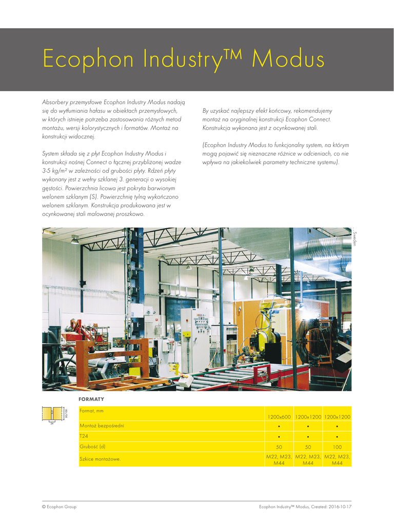 Ecophon Industry™ Modus Absorbery przemysłowe Ecophon Industry Modus nadają się do wytłumiania hałasu w obiektach przemysłowych, w których istnieje potrzeba zastosowania różnych metod montażu, wersji kolorystycznych i formatów. Montaż na konstrukcji widocznej. System składa się z płyt Ecophon Industry Modus i konstrukcji nośnej Connect o łącznej przybliżonej wadze 3-5 kg/m² w zależności od grubości płyty. Rdzeń płyty wykonany jest z wełny szklanej 3. generacji o wysokiej gęstości. Powierzchnia licowa jest pokryta barwionym welonem szklanym (S). Powierzchnię tylną wykończono welonem szklanym. Konstrukcja produkowana jest w ocynkowanej stali malowanej proszkowo. By uzyskać najlepszy efekt końcowy, rekomendujemy montaż na oryginalnej konstrukcji Ecophon Connect. Konstrukcja wykonana jest z ocynkowanej stali. (Ecophon Industry Modus to funkcjonalny system, na którym mogą pojawić się nieznaczne różnice w odcieniach, co nie wpływa na jakiekolwiek parametry techniczne systemu). , , Sweden Formaty Format, mm 1200x600 1200x1200 1200x1200 Montaż bezpośredni • • • T24 • • • Grubość (d) 50 50 100 Szkice montażowe. © Ecophon Group M22, M23, M22, M23, M22, M23, M44 M44 M44 Ecophon Industry™ Modus, Created: 2016-10-17 Płyta Industry Modus Przekrój systemu Industry Modus System Industry Modus Akustyka Pochłanianie dźwięku: Pomiary przeprowadzane zgodnie z EN ISO 354. Klasyfikacja zgodnie z EN ISO 11654. αp, Praktyczny współczynnik pochłaniania dźwięku — Industry Modus S 50 mm, 50 mm o.d.s. 1.0 — Industry Modus S 50 mm, 200 mm o.d.s. 0.8 · · · Industry Modus S 100 mm, 100 mm o.d.s. 0.6 - - - Industry Modus S 100 mm, 200 mm o.d.s. 0.4 o.d.s = c.w.k. = całkowita wysokość konstrukcyjna 0.2 0.0 125 d mm 250 c.w.k. mm 500 1000 2000 4000 Częstotliwość, Hz αp, Praktyczny współczynnik pochłaniania dźwięku 125 Hz 250 Hz 500 Hz αw 1000 Hz 2000 Hz 4000 Hz Klasa pochłaniania dźwięku 50 50 0.20 0.65 0.95 0.95 1.00 1.00 0.95 A 50 200 0.45 0.95 1.00 0.95 1.00 1.00 1.00 A 100 100 0.55 1.00 1.00 1.00 1.00 1.00 1.00 A 100 200 0.75 1.00 1.00 1.00 1.00 1.00 1.00 A d mm c.w.k. mm NRC SAA 100 100 1.10 1.07 100 200 1.10 1.07 Dostęp Płyty są łatwo demontowalne. Minimalny prześwit umożliwiający demontaż zgodnie ze szkicem montażowym. Utrzymywanie w czystości Odkurzanie ręczne i maszynowe raz w tygodniu. Odbicie światła White 190, najbliższy kolor wg NCS: S 0500-N, odbicie światła 80%. Grey 981, najbliższy kolor wg NCS: S S 2502-Y, odbicie światła 45%. Black 970, najbliższy kolor wg NCS: S 8502-Y, odbicie światła 4%. Naturalny, odbicie światła 60%. Mogą występować niewielkie różnice kolorystyczne. © Ecophon Group Ecophon Industry™ Modus, Created: 2016-10-17 Odporność na wilgoć Płyty są odporne na wilgoć do 95%, przy temperaturze 30°C bez ugięcia, wypaczenia, czy też rozwarstwienia (EN 13964). Płyty są również przeznaczone do pomieszczeń o wysokiej wilgotności oraz temperaturze. W razie wątpliwości projektowych skontaktuj się z działem technicznym Ecophon. Warunki wewnątrz pomieszczenia Certyfikat / Znak Fiński M1 • Francuskie VOC A+ • Szwedzki Związek Chorych na Astmę i Alergię • Duński Znak Klimatu Wnętrz Dansk Indeklima • California Emission Regulation, CDPH • Do produkcji wełny szklanej 3.generacji wykorzystujemy ponad 70% szkła z odzysku oraz naturalne spoiwo pochodzenia roślinnego. Substancje naturalne, wytwarzane m.in. z pszenicy, mogą w początkowej fazie wydzielać delikatny zapach. Jest on całkowicie nieszkodliwy dla zdrowia i nie powoduje żadnych dolegliwości dla organizmu. Zastąpienie ropopochodnych substancji wiążących lepiszczem naturalnym pozwala zaoszczędzić 24 tysiące baryłek ropy rocznie. Wpływ na środowisko naturalne W całości nadają się do powtórnego przetworzenia. Bezpieczeństwo pożarowe Kraj Europa Standard EN 13501-1 Klasa A2-s1,d0 Płyty są materiałem niepalnym według badań i klasyfikacji EN ISO 1182. Obchodzenie się z płytami i wytrzymałość mechaniczna Informacje dotyczące maksymalnego obciążenia użytkowego, minimalnej nośności oraz innych właściwości funkcjonalnych i mechanicznych dostępne w tabeli na stronie www.ecophon.pl. Montaż Zgodnie ze szkicem montażowym, przewodnikiem instalacyjnym oraz rysunkami pomocniczymi. Informacje na temat minimalnej całkowitej wysokości konstrukcyjnej umieszczone są pod szkicem montażowym w specyfikacji ilościowej. CE Oznaczenie CE odnosi się do takich właściwości jak poziom pochłaniania dźwięku, emisje substancji szkodliwych, bezpieczeństwo ogniowe dopuszczalne obciążenia użytkowe. Wszystkie sufity Ecophon oznakowane CE spełniają europejskie standardy EN13964 oraz właściwości deklarowane w Deklaracjach Właściwości Użytkowych (DWU). © Ecophon Group Ecophon Industry™ Modus, Created: 2016-10-17 M22 Szkic montażowy (M22): Ecophon Industry Modus, profil nośny Inline Specyfikacja ilościowa (wyłączając odpady) Format, mm 1200x600 1200x1200 0,7/m² 1 Industry Modus 1,4/m² 2 Profil nośny Inline Connect, 1200 mm 0,9m/m² 0,9m/m² 3 Wkręt i podkładka Connect (do lekkiego betonu lub metalu), mocowane co 1 panel 1,4/m² 0,7/m² 4 Metalowy wkręt Absorber Connect 0,9/m² 0,9/m² Δ Minimalna całkowita wysokość konstrukcyjna: 50 lub 100mm - - δ Najmniejszy prześwit umożliwiający demontaż: płyty nie są przeznaczone do demontażu - - Format, mm Patrz Specyfikacja ilościowa Maks. obciążenie użytkowe (N) Min. nośność (N) 1200x600 - - 1200x1200 - - Obciążenie użytkowe/ nośność M23 Szkic montażowy (M23): Ecophon Industry Modus, wkręty i podkładki 1 3 2 © Ecophon Group Specyfikacja ilościowa (wyłączając odpady) Format, mm 1200x600 1200x1200 1 Industry Modus 1,4/m² 0,7/m² 2 Connect Wkręt z podkładką (do lekkiego betonu lub metalu) 5,6/m² 2,8/m² 3 Connect Podkładka 5,6/m² 2,8/m² Δ Minimalna całkowita wysokoś