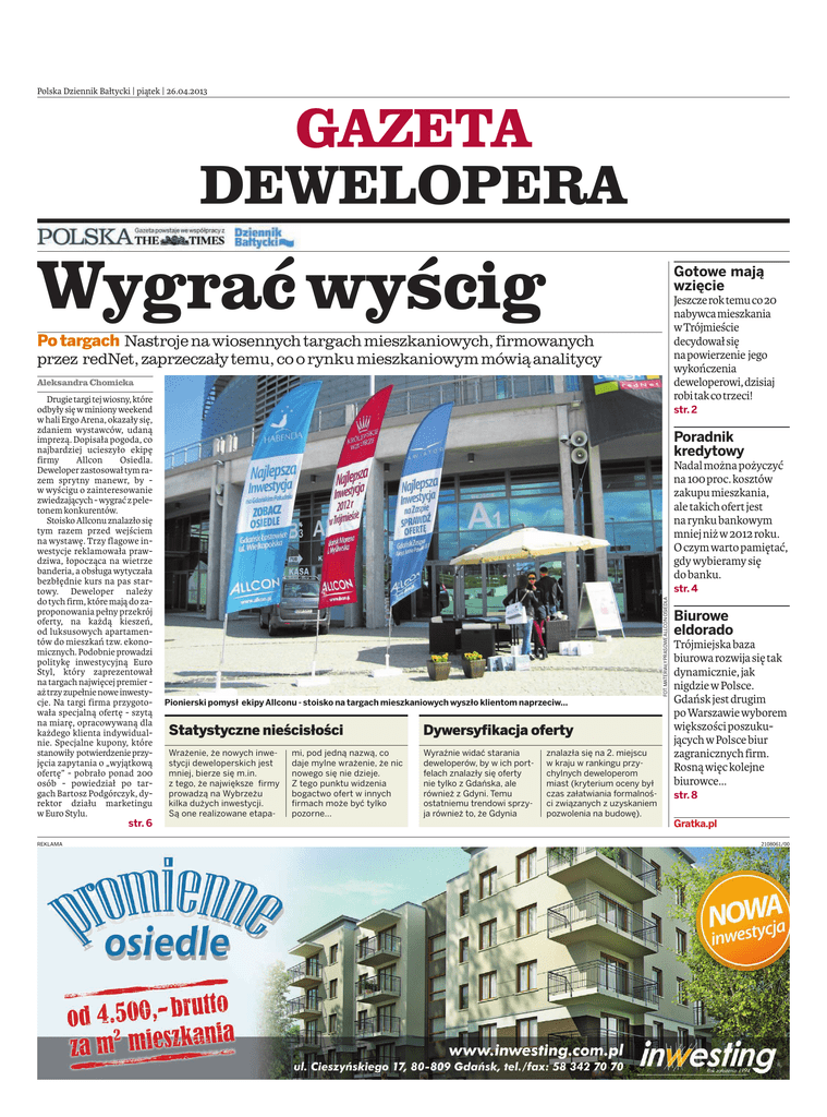 Polska Dziennik Bałtycki | piątek | 26.04.2013 GAZETA DEWELOPERA Wygrać wyścig Gotowe mają wzięcie Jeszczeroktemuco20 nabywcamieszkania wTrójmieście decydowałsię napowierzenie jego wykończenia deweloperowi,dzisiaj robitakcotrzeci! Po targach Nastroje na wiosennych targach mieszkaniowych, firmowanych przez redNet, zaprzeczały temu, co o rynku mieszkaniowym mówią analitycy Aleksandra Chomicka str. 6 REKLAMA str. 2 Poradnik kredytowy Nadal można pożyczyć na 100 proc. kosztów zakupu mieszkania, ale takich ofert jest na rynku bankowym mniej niż w 2012 roku. O czym warto pamiętać, gdy wybieramy się do banku. str. 4 FOT.MATERIAŁYPRASOWEALLCON OSIEDLA Drugie targi tej wiosny, które odbyły się w miniony weekend w hali Ergo Arena, okazały się, zdaniem wystawców, udaną imprezą. Dopisała pogoda, co najbardziej ucieszyło ekipę firmy Allcon Osiedla. Deweloper zastosował tym razem sprytny manewr, by w wyścigu o zainteresowanie zwiedzających - wygrać z peletonem konkurentów. Stoisko Allconu znalazło się tym razem przed wejściem na wystawę. Trzy flagowe inwestycje reklamowała prawdziwa, łopocząca na wietrze banderia, a obsługa wytyczała bezbłędnie kurs na pas startowy. Deweloper należy do tych firm, które mają do zaproponowania pełny przekrój oferty, na każdą kieszeń, od luksusowych apartamentów do mieszkań tzw. ekonomicznych. Podobnie prowadzi politykę inwestycyjną Euro Styl, który zaprezentował na targach najwięcej premier aż trzy zupełnie nowe inwestycje. Na targi firma przygotowała specjalną ofertę - szytą na miarę, opracowywaną dla każdego klienta indywidualnie. Specjalne kupony, które stanowiły potwierdzenie przyjęcia zapytania o „wyjątkową ofertę” - pobrało ponad 200 osób - powiedział po targach Bartosz Podgórczyk, dyrektor działu marketingu w Euro Stylu. Pionierski pomysł ekipy Allconu - stoisko na targach mieszkaniowych wyszło klientom naprzeciw... Statystyczne nieścisłości Wrażenie, że nowych inwestycji deweloperskich jest mniej, bierze się m.in. z tego, że największe firmy prowadzą na Wybrzeżu kilka dużych inwestycji. Są one realizowane etapa- mi, pod jedną nazwą, co daje mylne wrażenie, że nic nowego się nie dzieje. Z tego punktu widzenia bogactwo ofert w innych firmach może być tylko pozorne... Dywersyfikacja oferty Wyraźnie widać starania deweloperów, by w ich portfelach znalazły się oferty nie tylko z Gdańska, ale również z Gdyni. Temu ostatniemu trendowi sprzyja również to, że Gdynia znalazła się na 2. miejscu w kraju w rankingu przychylnych deweloperom miast (kryterium oceny był czas załatwiania formalności związanych z uzyskaniem pozwolenia na budowę). Biurowe eldorado Trójmiejska baza biurowa rozwija się tak dynamicznie, jak nigdzie w Polsce. Gdańsk jest drugim po Warszawie wyborem większości poszukujących w Polsce biur zagranicznych firm. Rosną więc kolejne biurowce... str. 8 Gratka.pl 2108061/00