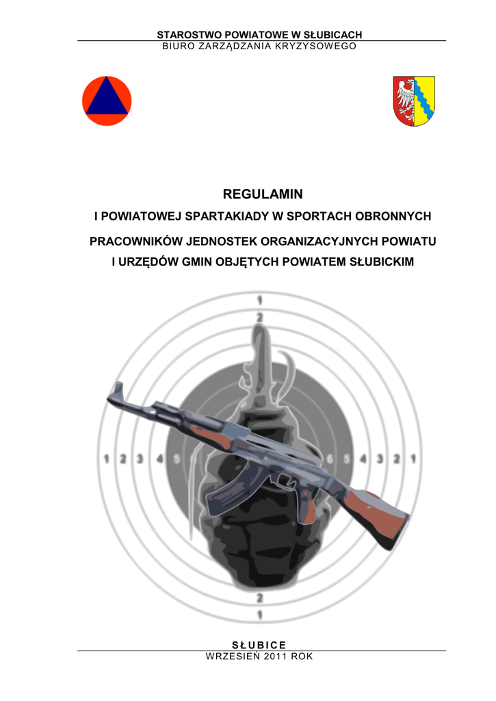 STAROSTWO POWIATOWE W SŁUBICACH BIURO ZARZ ĄDZANIA KRYZYSOW EGO REGULAMIN I POWIATOWEJ SPARTAKIADY W SPORTACH OBRONNYCH PRACOWNIKÓW JEDNOSTEK ORGANIZACYJNYCH POWIATU I URZĘDÓW GMIN OBJĘTYCH POWIATEM SŁUBICKIM SŁUBICE W RZESIEŃ 2011 RO K Spis treści 1. Postanowienia ogólne .................................................................... 3 2. Warunki uczestnictwa .................................................................... 3 3. Punktacja ......................................................................................... 3 4. Konkurencje .................................................................................... 4 4.1.Strzelanie z karabinka kbks ........................................................ 4 4.2.Rzut granatem ćwiczebnym na celność ...................................... 5 4.3.Marsz na orientację .................................................................... 5 4.4.Udzielanie pierwszej pomocy medycznej.................................... 5 4.5.Alfabet Morse’a ........................................................................... 5 4.6.Transport rannego ...................................................................... 5 4.7.Sztafeta sprawnościowa ............................................................. 6 4.8.Sztafeta urzędnika ...................................................................... 6 4.9.Rzut piłką koszykową do kosza .................................................. 6 4.10. Rzut lotką do tarczy ................................................................. 6 5. Sprawy organizacyjne.................................................................... 6 6.Program I Powiatowej Spartakiady w sportach obronnych ........ 7 2 1. Postanowienia ogólne 1.1. Organizatorem Spartakiady jest Starostwo Powiatowe w Słubicach. 1.2. Celem jest popularyzacja wiedzy obronnej z zakresu obrony cywilnej oraz podnoszenie sprawności fizycznej. 2. Warunki uczestnictwa 2.1. Warunkiem uczestnictwa zespołu w Spartakiadzie jest przesłanie dokumentacji ujętej w punkcie 5 „Sprawy organizacyjne". 2.2. W zawodach uczestniczą zespoły 3 osobowe, 2.3. Uczestnicy zawodów winni posiadać: dokument tożsamości oraz ubiór dostosowany do warunków zawodów. 3. Punktacja 3.1. Każda konkurencja oceniana jest osobno według zasad określonych w danej konkurencji. 3.2. Do klasyfikacji ogólnej zalicza się sumę punktów uzyskanych za wszystkie konkurencje według zasady określonej w tabeli poniżej. Tabela. Zasady do klasyfikacji ogólnej (np. przy udziale 18 drużyn) Miejsce za konkurencję 1 miejsce 2 miejsce 3 miejsce 4 miejsce 5 miejsce 6 miejsce 7 miejsce 8 miejsce 9 miejsce Punkty 18 17 16 15 14 13 12 11 10 Miejsce za konkurencję 10 miejsce 11 miejsce 12 miejsce 13 miejsce 14 miejsce 15 miejsce 16 miejsce 17 miejsce 18 miejsce Punkty 9 8 7 6 5 4 3 2 1 3.3. Zespół, w którego składzie jest chociaż jedna kobieta (zawodniczka) otrzymuje bonus punktowy do klasyfikacji ogólnej - 5 pkt. (bez względu na ilość kobiet w zespole). 3.4. W przypadku uzyskania przez zespoły takiej samej ilości punktów w klasyfikacji ogólnej, o kolejności miejsc decyduje: liczba punktów zdobytych przez zespoły, w konkurencji - strzelanie z karabinka kbks. Gdyby ilość punktów za strzelanie, także była jednakowa wyższe miejsce zajmuje zespół, który uzyska wyższe miejsce w konkurencji Alfabet Morse’,a. 3.5. Zespół może zostać zdyskwalifikowany w danej konkurencji za rażące naruszenie zasad regulaminu zawodów i otrzymuje wtedy 0 pkt. 3.6. Zespół, który zajmie w końcowej klasyfikacji I miejsce otrzyma puchar przechodni Starosty Słubickiego, a zawodnicy zespołu po nagrodzie rzeczowej. 3.7. Każdy zespól otrzyma dyplom za udział w Spartakiadzie. 4. Konkurencje 4.1. Strzelanie z karabinka kbks a) każdy zawodnik z drużyny oddaje 3 strzały próbne oraz 5 strzałów konkursowych liczonych do punktacji, b) strzelanie wykonuje się z karabinka sportowego kbks do tarczy TS 3 z odległości 50 m w postawie leżąc z podpórką, 3 c) każdy zawodnik może uzyskać maksymalnie 50 pkt., d) wynik strzelania stanowić będzie suma punktów uzyskanych w wyniku oddania 5 strzałów konkursowych, e) w przypadku zdobycia przez zespoły takiej samej liczby punktów, o kolejności zespołu w tej konkurencji decyduje większa liczba trafionych 10,9,8... itd. 4.2. Rzut granatem ćwiczebnym na celność a) każdy zawodnik zespołu wykonuje 3 rzuty oceniane granatem oraz rzut próbny, z którego wykonania może zrezygnować, b) rzuty wykonywane są granatem RG-42 ćwiczebnym z odległości 25 m (kobiety 20 m) w postawie stojącej, do prostokąta o wymiarach 5 x 2 m z wykreślonym centralnie w nim prostokątem 2x1 m, c) upadek granatu na linii granicznej prostokąta zaliczony jest jako trafienie w cel wyżej punktowany, d) o ilości zdobytych punktów w konkurencji decyduje suma punktów za każdy oceniany rzut, e) za każde celne trafienie przyznaje się następującą ilość punktów: trafienie do prostokąta 2 x1 m - 3 pkt., trafienie do prostokąta 5 x2 m - 1 pkt. 4.3. Marsz na orientację a) zespoły otrzymują jedną kartę startową i mapę, na której zaznaczone będą punkty do odnalezienia w czasie marszu w terenie, b) punkty oznaczane będą lampionami w kolorze biało czerwonym, c) odnalezienie punktu należy potwierdzić na otrzymanej karcie startowej, d) czas trwania marszu 40 minut, e) uczestnicy startują i kończą bieg całym zespołem, f) do klasyfikacji liczy się czas ostatniego zawodnika zespołu, g) za każdy odnaleziony punkt kontrolny zespół uzyskuje 10 pkt., h) w razie przekroczenia limitu czasowego, zespołowi odlicza się 3 pkt. za każde rozpoczęte 3 minuty, i) za nie odnalezienie punktu w terenie zespołowi odlicza się 10 pkt., j) o kolejności miejsc decydują: czas pokonania trasy (Cz) oraz liczba zdobytych punktów (Pk), k) suma uzyskanych punków (Y) za czas i odnalezione punkty kontrolne stanowi