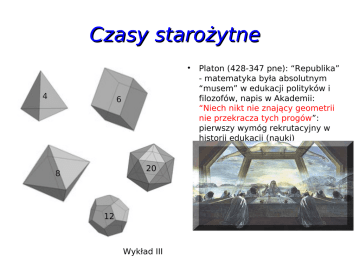 Czasy starożytne 4 6 20 8 12 Wykład III Platon (428-347 pne): “Republika” - matematyka była absolutnym “musem” w edukacji polityków i filozofów, napis w Akademii: “Niech nikt nie znający geometrii nie przekracza tych progów”: pierwszy wymóg rekrutacyjny w historii edukacji (nauki) Czasy starożytne Platon połączył teorięEmpedoklesa (490-430 pne) o 4 elementach z teorią atomową Demokryta (460-370 pne). Jego “unifikacja” przedstawia 4 elementy jako oddzielne podstawowe cząstki mające kształt brył doskonałych(dopiero Dalton miał podobne idee w chemii w XIX w.) W jego teorii m.in. 20 to Wszechświat Brak piątego elementu? Arystoteles – eter (materiał boski) jako piąty element (tzw. quintessence – termin przyjęty w kosmologii), teoria eteru dla propagacji światła aż do 1887 (Michelson-Morley) Wykład III Chemia Platona, np. [woda] ->2 [powietrze]+[ogien] (tylko tak odpowiednio bryły przylegają do siebie) Ale to nie wszystko: dla Platona złożoność materii i zjawisk to nie była najważniejsza rzecz, alenaprawdę fundamentalne są odpowiadające im symetrie Podobne idee wcześniej u Hindusów Upaniszady (VII w. p.n.e.): “Brahman, pragnąc sie pomnożyć, stworzył tejas (ogień), ap (wodę) oraz ksiti (ziemię) i wniknął w nie”. Póżniej dodano powietrze oraz akasa (eter, przestrzeń, niematerialny byt) – teoria pięciu żywiołów (nawiasem mówiąc łącząca się z pięcioma zmysłami) Wykład III Poza tym Hindusi doszli do tych samych wniosków dotyczących ziarnistości materii co Grecy, wykorzystując pojęcie nieskończoności (mieli podstawowe pojęcie o zbiorach nieskończonych) Weźmy górę i pagórek. Która ma więcej cząstek? Góra. Nie możemy dzielić w nieskończoność. Gdyby cząstki można dzielić w nieskończoność, to góra i pagórek zawierałyby taką samą ilość cząstek i straciłyby jakikolwiek sens Wykład III „Idąc plażą widzę piasek, który wydaje mi się ciągły, ale gdy spojrzę na niego z bliska wyraźnie widzę, że składa się z drobnych ziarenek. Tak samo jest z wodą morską i każdą inną substancją“, Demokryt, uczeń Lekipposa „Materia jest ciągła, można ją dzielić bez końca“, Arystoteles (384-322 p.n.e) Przez 2000 lat (!) obowiązywała za sprawą Kościoła filozofia Arystotelesa (dotycząca zarówno Wykład III mikro- jak i makro- świata) Antyreklama (lub jak to nazwać?) “Trudno porównywać jakąkolwiek starożytną lub średniowieczną kulturę ze współczesną fizyką w taki sposób, by porównanie wypadło korzystnie dla tej ostatniej, W tym przyadku przez “współczesny” rozumiem okres od Galileusza do dnia dzisiejszego. Niezależnie od doskonałego sprzętu, współdziałanie teorii z praktyką w nowoczesnej filozofii przyrody – jak ją się czasami nazywa – nigdy nie zostało Historia fizyki cząstek powtórzone” właśnie temu Cytat z popularnonaukowej książki, nie podam tytułu, aby nie robić reklamy temu “dziełu” Wykład III zaprzecza! Kepler, 1596: “Mysterium Cosmographicum” Platończycy byli zafascynowani symetriami [brył] (także ciekawy przypadek Keplera), nie tylko zresztą oni, fascynacja ta trwa po dzień dzisiejszy i jest jednym z fundamentów fizyki cząstek elementarnych, chociaż nie chodzi już o symetrie brył Wykład III Podsumujmy ten etap ... Wykład III Współczesność (XVII-XIX) Dalton 1808 (atomy, argument?) Mendelejew 1850 Rutherford 1911 – jądro (argument?) Mechanizm Higgsa 1964 Bohr – 1913 – model atomu MS GWS 1967-1972 Dirac 1927: spin (g=2), antycząstki T'hooft, Veltman Chadwick – 1932 jądro (p+n) Stern 1938 – proton g około 5.6 Gellmann, Ne'eman, Zweig 1961 – kwarki Wykład III Wilczek, Politzer, Asymptotyczna swoboda 1973 Prądy neutralne 1974 LEP, Rubia, 1983: cząstki W i Z ... Feynman, QED, renormalizacja, 1947 Schwinger, 1947, g=2.... Nieabelowe teorie Yanga-Millsa, 1954 1895: X-ray, W. Rontgen (Nobel, 1901) 1896 – Becquerel: promieniotwórczość (przypadek?) 1895-1896 – Thomson, Rutherford; dwa rodzaje promieniowania (jakie?) 1898-1898: rad, polon (kto?) 1905: foton (A. Einstein) 1911: jądro - Rutherford 1919: proton - Rutherford 1929: akcelerator van der Graaffa 1930: neutrino (Pauli) 1931: cyklotron – E. Lawrence 1932: pozytron – C. Anderson Wykład III 1937: mion – I. Rabi - "Who ordered that?" Inne spojrzenie Joseph Thomson (1896-) Odkrył elektron, 1897 Nagroda Nobla, 1937 Wykład III Zakrzywienie promieniowania w polu: ładunek Oryginał: Public domain. This image (or other media file) is in the public domain because its copyright has expired (wiki) Wykład III Obraz obecny: materia (fermiony) i siły (bozony) skrót myślowy! Kartezjusz – ciała oddziałują bezpośrednio Newton – także na odległość 1. Grawitacja 2. Elektryczność i magnetyzm Wykład III Demon Laplace'a Pod koniec XIX wieku uważano, że fizyka jest już pełna nauką: rządziła teoria mechanistyczna Newtona, najdobitniej wyrażona przez Laplace'a w postaci tzw. Demona (w 1814 PierreSimon Laplace powiedział, że gdyby znał dokładne położenie i pęd każdego atomu w kosmosie, mógłby za pomocą zasad Newtona określić całą przeszłość Wykład III i przyszłość Oddziaływanie elektromagnetyczne Nie można wytłumaczyć w ramach teorii mechanistycznej (siły nie działają wzdłuż prostej, zależą od prędkości) Faraday, Maxwell: POLE Oersted, Faraday: pierwsza unifikacja sił Wykład III Kwantowa wersja elektromagnetyzmu (QED) Foton Dualizm falowokorpuskularny Zasada nieoznaczoności Heisenberga (cząstki wirtualne) Wykład III Kwantowa wersja elektromagnetyzmu (QED) Odpychanie (ale proszę nie traktować tego typu obrazków zbyt dosłownie!) Wykład III Kwantowa wersja elektromagnetyzmu (QED) Odpychanie: także wymiana wirtualnych cząstek Wykład III Następne oddziaływanie: oddziaływania słabe Oddziaływanie słabe różni się znacznie od dwóch poprzednich oddzia