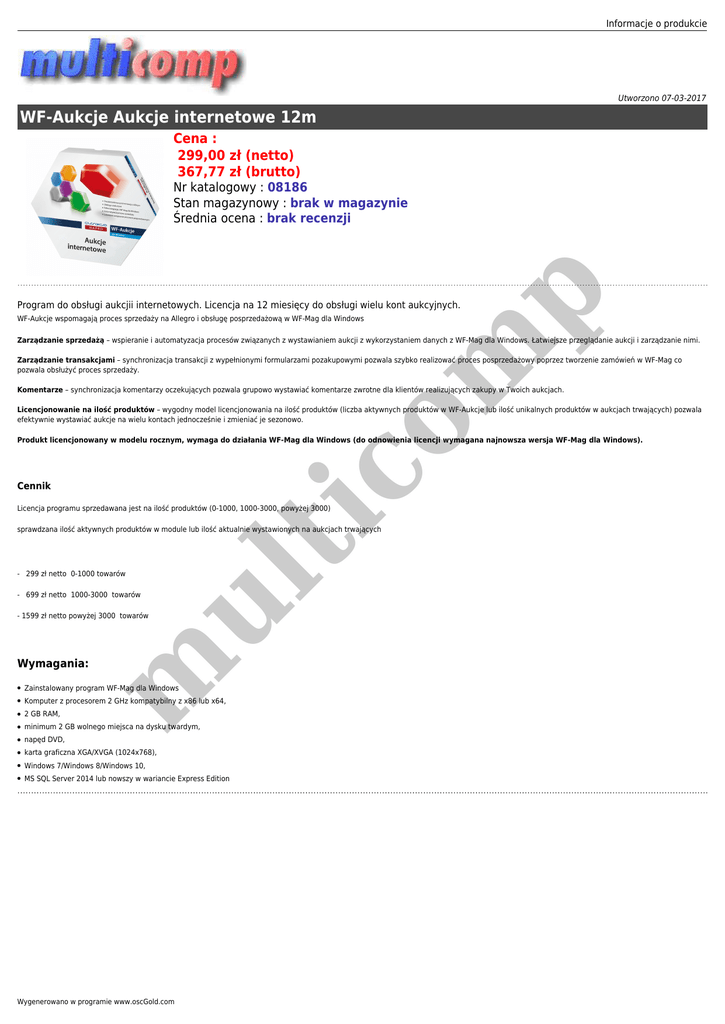 Informacje o produkcie Utworzono 07-03-2017 WF-Aukcje Aukcje internetowe 12m Cena : 299,00 zł (netto) 367,77 zł (brutto) m p Nr katalogowy : 08186 Stan magazynowy : brak w magazynie Średnia ocena : brak recenzji Program do obsługi aukcjii internetowych. Licencja na 12 miesięcy do obsługi wielu kont aukcyjnych. WF-Aukcje wspomagają proces sprzedaży na Allegro i obsługę posprzedażową w WF-Mag dla Windows Zarządzanie sprzedażą – wspieranie i automatyzacja procesów związanych z wystawianiem aukcji z wykorzystaniem danych z WF-Mag dla Windows. Łatwiejsze przeglądanie aukcji i zarządzanie nimi. Zarządzanie transakcjami – synchronizacja transakcji z wypełnionymi formularzami pozakupowymi pozwala szybko realizować proces posprzedażowy poprzez tworzenie zamówień w WF-Mag co pozwala obsłużyć proces sprzedaży. Komentarze – synchronizacja komentarzy oczekujących pozwala grupowo wystawiać komentarze zwrotne dla klientów realizujących zakupy w Twoich aukcjach. ti co Licencjonowanie na ilość produktów – wygodny model licencjonowania na ilość produktów (liczba aktywnych produktów w WF-Aukcje lub ilość unikalnych produktów w aukcjach trwających) pozwala efektywnie wystawiać aukcje na wielu kontach jednocześnie i zmieniać je sezonowo. Produkt licencjonowany w modelu rocznym, wymaga do działania WF-Mag dla Windows (do odnowienia licencji wymagana najnowsza wersja WF-Mag dla Windows). Cennik Licencja programu sprzedawana jest na ilość produktów (0-1000, 1000-3000, powyżej 3000) - 299 zł netto 0-1000 towarów ul sprawdzana ilość aktywnych produktów w module lub ilość aktualnie wystawionych na aukcjach trwających - 699 zł netto 1000-3000 towarów - 1599 zł netto powyżej 3000 towarów m Wymagania: ● Zainstalowany program WF-Mag dla Windows ● Komputer z procesorem 2 GHz kompatybilny z x86 lub x64, ● 2 GB RAM, ● minimum 2 GB wolnego miejsca na dysku twardym, ● napęd DVD, ● karta graficzna XGA/XVGA (1024x768), ● Windows 7/Windows 8/Windows 10, ● MS SQL Server 2014 lub nowszy w wariancie Express Edition Wygenerowano w programie www.oscGold.com