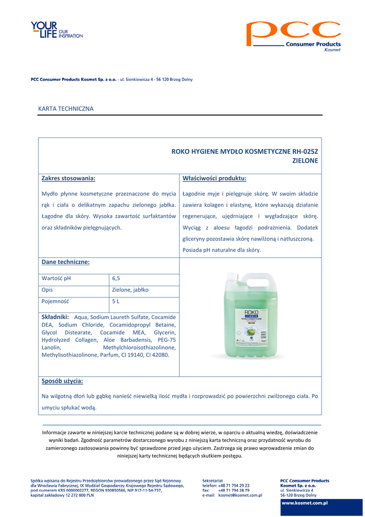 KARTA TECHNICZNA ROKO HYGIENE MYDŁO KOSMETYCZNE RH-025Z ZIELONE Zakres stosowania: Właściwości produktu: Mydło płynne kosmetyczne przeznaczone do mycia Łagodnie myje i pielęgnuje skórę. W swoim składzie rąk i ciała o delikatnym zapachu zielonego jabłka. zawiera kolagen i elastynę, które wykazują działanie Łagodne dla skóry. Wysoka zawartość surfaktantów regenerujące, ujędrniające i wygładzające skórę. oraz składników pielęgnujących. Wyciąg z aloesu łagodzi podrażnienia. Dodatek gliceryny pozostawia skórę nawilżoną i natłuszczoną. Posiada pH naturalne dla skóry. Dane techniczne: Wartość pH 6,5 Opis Zielone, jabłko Pojemność 5L Składniki: Aqua, Sodium Laureth Sulfate, Cocamide DEA, Sodium Chloride, Cocamidopropyl Betaine, Glycol Distearate, Cocamide MEA, Glycerin, Hydrolyzed Collagen, Aloe Barbadensis, PEG-75 Lanolin, Methylchloroisothiazolinone, Methylisothiazolinone, Parfum, CI 19140, CI 42080. Sposób użycia: Na wilgotną dłoń lub gąbkę nanieść niewielką ilość mydła i rozprowadzić po powierzchni zwilżonego ciała. Po umyciu spłukać wodą. Informacje zawarte w niniejszej karcie technicznej podane są w dobrej wierze, w oparciu o aktualną wiedzę, doświadczenie wyniki badań. Zgodność parametrów dostarczonego wyrobu z niniejszą karta techniczną oraz przydatność wyrobu do zamierzonego zastosowania powinny być sprawdzone przed jego użyciem. Zastrzega się prawo wprowadzenie zmian do niniejszej karty technicznej będących skutkiem postępu.