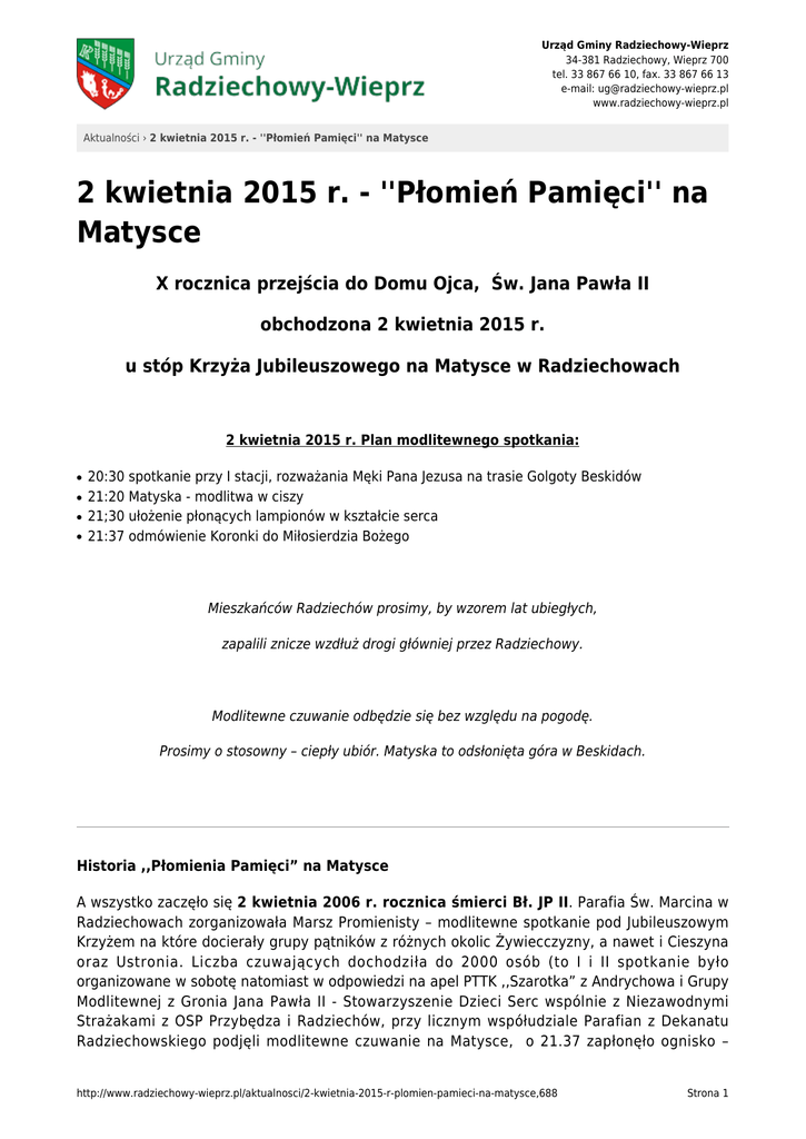 Urząd Gminy Radziechowy-Wieprz 34-381 Radziechowy, Wieprz 700 tel. 33 867 66 10, fax. 33 867 66 13 e-mail: [email protected] www.radziechowy-wieprz.pl Aktualności › 2 kwietnia 2015 r. - ''Płomień Pamięci'' na Matysce 2 kwietnia 2015 r. - ''Płomień Pamięci'' na Matysce X rocznica przejścia do Domu Ojca, Św. Jana Pawła II obchodzona 2 kwietnia 2015 r. u stóp Krzyża Jubileuszowego na Matysce w Radziechowach 2 kwietnia 2015 r. Plan modlitewnego spotkania: ● ● ● ● 20:30 spotkanie przy I stacji, rozważania Męki Pana Jezusa na trasie Golgoty Beskidów 21:20 Matyska - modlitwa w ciszy 21;30 ułożenie płonących lampionów w kształcie serca 21:37 odmówienie Koronki do Miłosierdzia Bożego Mieszkańców Radziechów prosimy, by wzorem lat ubiegłych, zapalili znicze wzdłuż drogi główniej przez Radziechowy. Modlitewne czuwanie odbędzie się bez względu na pogodę. Prosimy o stosowny – ciepły ubiór. Matyska to odsłonięta góra w Beskidach. Historia ,,Płomienia Pamięci” na Matysce A wszystko zaczęło się 2 kwietnia 2006 r. rocznica śmierci Bł. JP II. Parafia Św. Marcina w Radziechowach zorganizowała Marsz Promienisty – modlitewne spotkanie pod Jubileuszowym Krzyżem na które docierały grupy pątników z różnych okolic Żywiecczyzny, a nawet i Cieszyna oraz Ustronia. Liczba czuwających dochodziła do 2000 osób (to I i II spotkanie było organizowane w sobotę natomiast w odpowiedzi na apel PTTK ,,Szarotka” z Andrychowa i Grupy Modlitewnej z Gronia Jana Pawła II - Stowarzyszenie Dzieci Serc wspólnie z Niezawodnymi Strażakami z OSP Przybędza i Radziechów, przy licznym współudziale Parafian z Dekanatu Radziechowskiego podjęli modlitewne czuwanie na Matysce, o 21.37 zapłonęło ognisko – http://www.radziechowy-wieprz.pl/aktualnosci/2-kwietnia-2015-r-plomien-pamieci-na-matysce,688 Strona 1 Urząd Gminy Radziechowy-Wieprz 34-381 Radziechowy, Wieprz 700 tel. 33 867 66 10, fax. 33 867 66 13 e-mail: [email protected] www.radziechowy-wieprz.pl Aktualności › 2 kwietnia 2015 r. - ''Płomień Pamięci'' na Matysce Płomień Pamięci, a syreny strażackie przypomniały o doniosłości chwili. Popłynęły łzy smutku, żalu, ale i radości. Przecież Nasz Papież jest już w Domu Ojca i nadal pragnie nam pomagać. W ten sposób oddaliśmy Hołd Największemu z Polaków, Janowi Pawłowi II. Śpiewając ulubione pieśni Papieża, czuliśmy Jego obecność wśród nas. A widząc inne ogniska na szczytach beskidzkich gór – zrozumieliśmy, że utworzyliśmy wspólny świetlany łańcuch – łańcuch zjednoczonych w modlitwie serc. Dziękujemy Ci Panie za Tych ludzi, dzięki którym mogliśmy w tym cudownym miejscu trwać na modlitwie, a szczególnie jesteśmy wdzięczni za ś.p. Ks. Prałata Stanisława Gawlika, który ten wyjątkowy zakątek Beskidów odkrył dla nas i naszych potomnych. 2 kwiecień 2007r Czas biegnie nieubłaganie. Minęły już dwa lata od momentu odejścia do Domu Ojca, Sługi Bożego Jana Pawła II. A my nadal słyszymy Jego głos i co najważniejsze, czujemy Jego obecność. To dla Niego – 02.04.07r. na szczytach naszych beskidzkich gór zapłonęły wieczorem ogniska - ,,chóry”, w ten właśnie szczególny sposób, tak jak to czynili niegdyś nasi pradziadowie połączyliśmy się we wspólnym modlitewnym czuwaniu. W Radziechowach płonęły dwa ogniska; jedno na Matysce, a drugie na Kopie. Na Matysce zebrała się liczna grupa pielgrzymów, którą dowodziły dwie jednostki OSP z Przybędzy i Radziechów oraz Stowarzyszenie Dzieci Serc .Czekając na godz. 21.37 odmówiliśmy cząstkę Różańca Św. modliliśmy się w tych intencjach, które każdy osobiście mógł wypowiedzieć do mikrofonu. A były one następujące: o rychłą beatyfikację i kanonizację Sługi Bożego Jana Pawła II, za ś.p. ks. Prałata Stanisława Gawlika twórcę Golgoty Beskidów, za obecnego ks. Proboszcza Ryszarda Kubasiaka – kontynuatora budowy, za fundatorów Krzyża Jubileuszowego i stacji Drogi Krzyżowej, o łaski wytrwania w dobrym mieszkańców parafii i wszystkich przecierających szlaki na Matyske, o świętych kapłanów, za dusze w czyśćcu cierpiące. Następnie śpiewaliśmy ulubione pieśni Jana Pawła II i tak dotrwaliśmy do 21.37 wówczas to nastąpiła cisza, każdy w skupieniu, na indywidualnej rozmowie z Panem Bogiem przedstawiał swoje głęboko zamknięte w sercu sprawy. Tego wieczora nikomu nie śpieszyło się do domu, jeszcze długo śpiewaliśmy, ciesząc oczy migocącymi płomieniami ogniska na tle nocnej Panoramy Kotliny Żywieckiej. Wozy strażackie, migocąca sygnalizacja świetlna i dźwięk syreny alarmowej to wszystko razem stanowiło niepowtarzalną oprawę tej uroczystości. Warto było zadać sobie trochę trudu i być w tej godzinie na Matysce, a jaki kształt miał płomień o 21.37 to można zobaczyć na zdjęciu wykonanym przez Grzegorza Łukasika z Twardorzeczki. Te wspomnienia to już historia, ale jaka historia, wpierw lokalna prasa pisała o wyjątkowym zdjęciu i pewnie nic by się już nie wydarzyło, gdyby nie spotkanie Ks. Władysława Janke, Proboszcza z Lalik – nauczyciela, z Ks. Jarosławem Cieleckim Dyrektorem Watykańskiego Serwisu Informacyjnego – uczniem. To dzięki nim zdjęcie ,,Płomienia Pamięci” obiegło świat, a III Rocznica Śmierci Jana Pawła II stała się wydarzeniem międzynarodowym. 2 kwietnia 2008 r. dotarła do Radziechów na Matyskę międzynarodowa grupa maratończyków http://www.radziechowy-wieprz.pl/aktualnosci/2-kwietnia-2015-r-plomien-pamieci-na-matysce,688 Strona 2 Urząd Gminy Radziechowy-Wieprz 34-381 Radziechowy, Wieprz 700 tel. 33 867 66 10, fax. 33 867 66 13 e-mail: [email protected] www.radziechowy-wieprz.pl Aktualności › 2 kwietnia 2015 r. - ''Płomień Pamięci'' na Matysce niosąca pochodnię zapaloną od ognia z grobu JP II. Maratończycy w ciągu kilku dni przebiegli trasę od Zakopanego, Niegowici, Krakowa, Wieliczki, Kalwarii Zeb