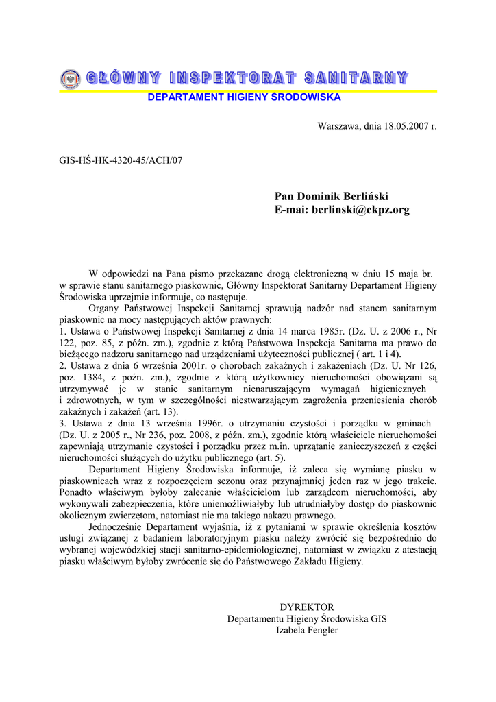 DEPARTAMENT HIGIENY ŚRODOWISKA Warszawa, dnia 18.05.2007 r. GIS-HŚ-HK-4320-45/ACH/07 Pan Dominik Berliński E-mai: [email protected] W odpowiedzi na Pana pismo przekazane drogą elektroniczną w dniu 15 maja br. w sprawie stanu sanitarnego piaskownic, Główny Inspektorat Sanitarny Departament Higieny Środowiska uprzejmie informuje, co następuje. Organy Państwowej Inspekcji Sanitarnej sprawują nadzór nad stanem sanitarnym piaskownic na mocy następujących aktów prawnych: 1. Ustawa o Państwowej Inspekcji Sanitarnej z dnia 14 marca 1985r. (Dz. U. z 2006 r., Nr 122, poz. 85, z późn. zm.), zgodnie z którą Państwowa Inspekcja Sanitarna ma prawo do bieżącego nadzoru sanitarnego nad urządzeniami użyteczności publicznej ( art. 1 i 4). 2. Ustawa z dnia 6 września 2001r. o chorobach zakaźnych i zakażeniach (Dz. U. Nr 126, poz. 1384, z poźn. zm.), zgodnie z którą użytkownicy nieruchomości obowiązani są utrzymywać je w stanie sanitarnym nienaruszającym wymagań higienicznych i zdrowotnych, w tym w szczególności niestwarzającym zagrożenia przeniesienia chorób zakaźnych i zakażeń (art. 13). 3. Ustawa z dnia 13 września 1996r. o utrzymaniu czystości i porządku w gminach (Dz. U. z 2005 r., Nr 236, poz. 2008, z późn. zm.), zgodnie którą właściciele nieruchomości zapewniają utrzymanie czystości i porządku przez m.in. uprzątanie zanieczyszczeń z części nieruchomości służących do użytku publicznego (art. 5). Departament Higieny Środowiska informuje, iż zaleca się wymianę piasku w piaskownicach wraz z rozpoczęciem sezonu oraz przynajmniej jeden raz w jego trakcie. Ponadto właściwym byłoby zalecanie właścicielom lub zarządcom nieruchomości, aby wykonywali zabezpieczenia, które uniemożliwiałyby lub utrudniałyby dostęp do piaskownic okolicznym zwierzętom, natomiast nie ma takiego nakazu prawnego. Jednocześnie Departament wyjaśnia, iż z pytaniami w sprawie określenia kosztów usługi związanej z badaniem laboratoryjnym piasku należy zwrócić się bezpośrednio do wybranej wojewódzkiej stacji sanitarno-epidemiologicznej, natomiast w związku z atestacją piasku właściwym byłoby zwrócenie się do Państwowego Zakładu Higieny. DYREKTOR Departamentu Higieny Środowiska GIS Izabela Fengler