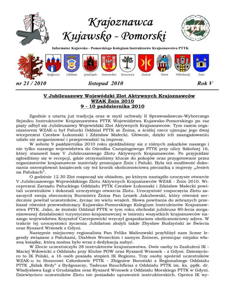 V Jubileuszowego Wojewódzkiego Zlotu Aktywnych Krajoznawców WZAK - śnin 2010. Wiceprezesi Zarządu Pałuckiego Oddziału PTTK Czesław Łukomski i Zdzisław Małecki powitali uczestników i dokonali uroczystego otwarcia Zlotu. Uroczystość rozpoczęcia Zlotu zaszczycił swoją obecnością Burmistrz śnina Pan Leszek Jakubowski, który równieŜ serdecznie powitał uczestników, Ŝycząc im wielu wraŜeń. Słowa powitania do zebranych przekazał równieŜ przewodniczący Kujawsko-Pomorskiego Kolegium Instruktorów Krajoznawstwa PTTK. Jako, Ŝe Ŝniński Oddział PTTK w tym roku obchodzi jubileusz 80-lecia zorganizowanej działalności turystyczno-krajoznawczej w imieniu wszystkich krajoznawców naszego województwa Krzysztof Czerepowicki wręczył gospodarzom okolicznościowy adres. W