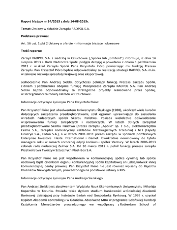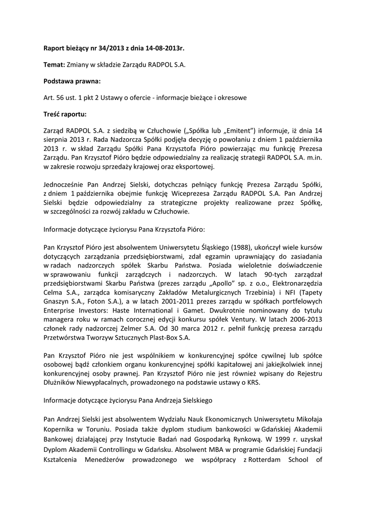 Raport bieżący nr 34/2013 z dnia 14-08-2013r. Temat: Zmiany w składzie Zarządu RADPOL S.A. Podstawa prawna: Art. 56 ust. 1 pkt 2 Ustawy o ofercie - informacje bieżące i okresowe Treść raportu: Zarząd RADPOL S.A. z siedzibą w Człuchowie („Spółka lub „Emitent”) informuje, iż dnia 14 sierpnia 2013 r. Rada Nadzorcza Spółki podjęła decyzję o powołaniu z dniem 1 października 2013 r. w skład Zarządu Spółki Pana Krzysztofa Pióro powierzając mu funkcję Prezesa Zarządu. Pan Krzysztof Pióro będzie odpowiedzialny za realizację strategii RADPOL S.A. m.in. w zakresie rozwoju sprzedaży krajowej oraz eksportowej. Jednocześnie Pan Andrzej Sielski, dotychczas pełniący funkcję Prezesa Zarządu Spółki, z dniem 1 października obejmie funkcję Wiceprezesa Zarządu RADPOL S.A. Pan Andrzej Sielski będzie odpowiedzialny za strategiczne projekty realizowane przez Spółkę, w szczególności za rozwój zakładu w Człuchowie. Informacje dotyczące życiorysu Pana Krzysztofa Pióro: Pan Krzysztof Pióro jest absolwentem Uniwersytetu Śląskiego (1988), ukończył wiele kursów dotyczących zarządzania przedsiębiorstwami, zdał egzamin uprawniający do zasiadania w radach nadzorczych spółek Skarbu Państwa. Posiada wieloletnie doświadczenie w sprawowaniu funkcji zarządczych i nadzorczych. W latach 90-tych zarządzał przedsiębiorstwami Skarbu Państwa (prezes zarządu „Apollo” sp. z o.o., Elektronarzędzia Celma S.A., zarządca komisaryczny Zakładów Metalurgicznych Trzebinia) i NFI (Tapety Gnaszyn S.A., Foton S.A.), a w latach 2001-2011 prezes zarządu w spółkach portfelowych Enterprise Investors: Haste International i Gamet. Dwukrotnie nominowany do tytułu managera roku w ramach corocznej edycji konkursu spółek Ventury. W latach 2006-2013 członek rady nadzorczej Zelmer S.A. Od 30 marca 2012 r. pełnił funkcję prezesa zarządu Przetwórstwa Tworzyw Sztucznych Plast-Box S.A. Pan Krzysztof Pióro nie jest wspólnikiem w konkurencyjnej spółce cywilnej lub spółce osobowej bądź członkiem organu konkurencyjnej spółki kapitałowej ani jakiejkolwiek innej konkurencyjnej osoby prawnej. Pan Krzysztof Pióro nie jest również wpisany do Rejestru Dłużników Niewypłacalnych, prowadzonego na podstawie ustawy o KRS. Informacje dotyczące życiorysu Pana Andrzeja Sielskiego Pan Andrzej Sielski jest absolwentem Wydziału Nauk Ekonomicznych Uniwersytetu Mikołaja Kopernika w Toruniu. Posiada także dyplom studium bankowości w Gdańskiej Akademii Bankowej działającej przy Instytucie Badań nad Gospodarką Rynkową. W 1999 r. uzyskał Dyplom Akademii Controllingu w Gdańsku. Absolwent MBA w programie Gdańskiej Fundacji Kształcenia Menedżerów prowadzonego we współpracy z Rotterdam School of Management. Z RADPOL S.A. związany jest od 1998 r., początkowo na stanowisku prokurenta oraz kierownika działu finansów i controllingu. Od 2001 r. pełnił funkcję członka zarządu i dyrektora ds. finansowych, a od 2004 r. funkcję Prezesa Zarządu RADPOL S.A. Pan Andrzej Sielski nie wykonuje innej działalności poza przedsiębiorstwem Emitenta, nie uczestniczy w spółce konkurencyjnej jako wspólnik spółki cywilnej, spółki osobowej, nie jest też członkiem innej konkurencyjnej spółki kapitałowej oraz nie uczestniczy w innej konkurencyjnej osobie prawnej jako członek jej organu. Pan Andrzej Sielski nie jest wpisany do Rejestru Dłużników Niewypłacalnych, prowadzonego na podstawie ustawy o KRS. Jednocześnie Zarząd spółki RADPOL S.A. informuje, że Rada Nadzorcza Spółki odwołała z dniem 14 sierpnia 2013 r. ze składu Zarządu Pana Adama Dombrowskiego, który dotychczas pełnił funkcję Wiceprezesa Zarządu.
