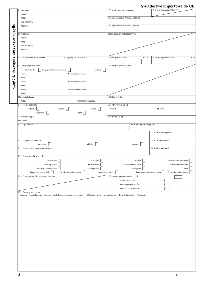 Świadectwo importowe do UE I.1. Nadawca I.2. Nr referencyjny świadectwa I.2.a. Nr referencyjny TRACES: Nazwa Adres I.3. Odpowiedzialna Władza Centralna Część I: Szczegóły dotyczące wysyłki Kod pocztowy I.4. Odpowiedzialna Władza Lokalna Państwo I.5. Odbiorca Odpowiedzialny za ładunek w UE Nazwa Adres Kod pocztowy Państwo I.7. Kraj pochodzenia, Kod ISO I.8. Region pochodzenia, Kod I.9. Kraj przeznaczenia I.11 Miejsce pochodzenia Gospodarstwo Kod ISO I.10 Region przeznaczenia Kod I.12. Miejsce przeznaczenia Stacja pozyskiwania nasienia Nazwa Zakład Numer zatwierdzenia Adres Nazwa Numer zatwierdzenia Adres Nazwa Numer zatwierdzenia Adres Miejsce załadunku I.14 Data wysyłki Adres Numer zatwierdzenia I.15. Środki transportu I.16. PKG wwozu do UE Samolot Statek Samochód Kolej Nazwa Nr PKG: Inne Nr identyfikacyjny:: I.17. Nr (y) CITES Dokument: I.18. Opis towaru I.19. Kod Taryfy Celnej (CN) I.20. Całkowita waga brutto I.21. Temperatura produktu I.22. Liczba opakowań otoczenia chłodni mroźni I.23. Oznakowanie kontenera/nr plomby I.24. Rodzaj opakowań I.25. Towar certyfikowany dla: Hodowlane Do tuczu Rzeźne Zatwierdzone instytucje Sztuczny rozród Kwarantanna Do odtworzenia stada Konie zarejestrowane Zwierzęta towarzyszące Cyrk/Wystawa Pociągowe Do spożycia przez ludzi Środki żywienia zwierząt późniejszy proces I.26. Tranzyt przez UE do państwa trzeciego Do użytku farmaceutycznego Inne Do użytku technicznego I.27. Import lub dopuszczenie do UE Import ostateczny Konie-ponowny wwóz Konie na pobyt czasowy I.28. Oznakowanie towaru Gatunek Rodzaj leczenia pl Rzeźnia Zakład rozbioru/zakład przetwórczy Chłodnia ilość Nr partii towaru Rodzaj elementów Waga netto 1/ 3 1774/2002 Świeże lub schłodzone skóry parzystokopytnych II: Informacje o zdrowotności II.a. Numer referencyjny świadectwa II.b. TRACES nr referencyjny Poświadczenie zdrowotności Ja, niżej podpisany urzędowy lekarz weterynarii, oświadczam, że zapoznałem(am) się i rozumiem Część II: Poświadczenie 1.pochodzą od zwierząt, które: (a) zostały ubite w rzeźniach, poddanych badaniu przedubojowemu, w wyniku którego uznane zostały za nadające się do uboju zgodnie z ustawodawstwem wspólnotowym (b) nie wykazywały żadnych objawów chorób przenoszonych na ludzi lub zwierzęta; oraz (c) nie zostały ubite celem zlikwidowania epidemii choroby zwierzęcej; 2.pochodzą z kraju lub w przypadku regionalizacji zgodnie z prawodawstwem wspólnotowym, z części kraju, z której import wszystkich kategorii mięsa świeżego odnośnych gatunków jest objęty zezwoleniem oraz który: (a) przez przynajmniej 12 miesięcy przed wysyłką był wolny od poniższych chorób: - albo klasycznego pomoru świń, oraz - afrykańskiego pomoru świń, (3) i (3)/ lub (3) - pomoru bydlęcego, (3), oraz (b) przez okres przynajmniej 24 miesięcy przed wysyłką był wolny od pryszczycy i na którym przez okres 12 miesięcy przed wysyłką nie prowadzono szczepień przeciwko pryszczycy; 3.zostały pozyskane: albo ze zwierząt, które przebywały na terytorium kraju pochodzenia przynajmniej przez trzy miesiące lub w przypadku zwierząt młodszych niż trzymiesięczne od urodzenia; (3) albo w przypadku skór zwierząt parzystokopytnych, ze zwierząt pochodzących z gospodarstw, w których w okresie poprzedzających 30 dni nie wystąpiła epidemia pryszczycy, i w promieniu 10 km od których nie wystąpiły w okresie 30 dni przypadki pryszczycy ; (3) albo w przypadku skór świń, ze zwierząt pochodzących z gospodarstw, w których w okresie poprzedzających 30 dni nie wystąpiła epidemia choroby pęcherzykowej świń lub w okresie poprzedzających 40 dni nie wystąpiła epidemia klasycznego lub afrykańskiego pomoru świń i w promieniu 10 km od których nie wystąpiły w okresie 30 dni przypadki tych chorób; (3) or ze zwierząt, które przeszły badania przedubojowe w rzeźni, w ciągu 24 godzin przed ubojem i nie wykazały żadnych objawów pryszczycy (3), pomoru bydlęcego (3), klasycznego pomoru świń (3), afrykańskiego pomoru świń (3) lub choroby pęcherzykowej świń (3); (3) 4.objęte zostały wszelkimi środkami ostrożności celem uniknięcia zanieczyszczenia czynnikami patogennymi. TSE.W odniesieniu do przenośnej encefalopatii gąbczastej (TSE), wymienione powyżej produkty opisane w ppkt. I.28 (TSE2): TSE1. albo nie zawierają ani nie pochodzą od materiałów pochodzenia bydlęcego, owczego lub koziego innych niż te pochodzące od zwierząt urodzonych, hodowanych w hodowli ciągłej oraz poddanych ubojowi na terytorium opisanym w ppkt. I.7/I.8, i/lub od zwierząt urodzonych i hodowanych w hodowli ciągłej na terytorium (kod ISO) (TSE1) , oraz przywiezionych i ubitych na terytorium opisanym w ppkt. I.7/I.8. (5) (TSE2) lub nie zawierają ani nie pochodzą z materiału szczególnego ryzyka jak określono w załączniku XI sekcja A do rozporządzenia (WE) nr 999/2001, wyprodukowanego po 31 marca 2001 r., ani z mechanicznie oddzielonego mięsa otrzymanego z kości wołowych, owczych i kozich wyprodukowanego po 31 marca 2001 r. Po dniu 31 marca 2001 r. bydło, owce i kozy, z których ten produkt pochodzi, nie zostały poddane ubojowi po oszołomieniu za pomocą gazu wstrzykniętego do jamy czaszkowej, ani zabite za pomocą tej samej metody, ani poddane ubojowi poprzez zniszczenie po oszołomieniu centralnej tkanki nerwowej za pomocą instrumentu w kształcie wydłużonego pręta, wprowadzonego do jamy czaszkowej. Tusze, półtusze i ćwierćtusze mogą zawierać kręgosłup, jeżeli są przywożone; (TSE2) (TSE2) TSE2. zawiera lub jest uzyskiwany wyłącznie z mięsa, wyłączając podroby i rdzeń kręgowy, zwierzyny płowej, która została przebadana pod względem chronicznej choroby wyniszczającej, za pomocą histopatologii, immunohistochemii lub innej metody diagnostycznej uznawanej przez właściwe władze, z wynikiem negatywnym i produkt nie został uzyskany ze zwierząt pochodzących ze 