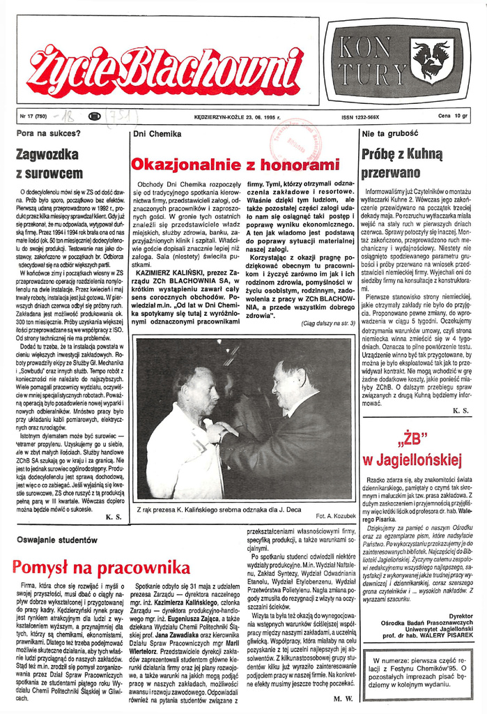 \ Życie Blachowni Nr 17 (750) Pora na sukces? Zagwozdka z surowcem 0 dodecylofenolu mówi się w ZS od dość dawna. Prób było sporo, początkowo bez efektów. Pierwszą udaną przeprowadzono w 1992 r., produkt przez kilka miesięcy sprawdzał klient. Gdy już się przekonał, że mu odpowiada, wytypował duńską firmę. Przez 1994 i 1994 rok brała ona od nas małe ilości (ok. 50 ton miesięcznie) dodecylofenolu do swojej produkcji. Testowanie nas jako dostawcy, zakończono w początkach br. Odbiorca adecydował się na odbiór większych partii. W końcówce zimy i początkach wiosny w ZS przeprowadzono operaqę rozdzielenia nonylofenolu na dwie instalacje. Przez kwiecień i maj trwały roboty, instalacja jest już gotowa. W pierwszych dniach czerwca odbył się próbny ruch. Zakładana jest możliwość produkowania ok. 300 ton miesięcznie. Próby uzyskania większej ilości przeprowadzane są we współpracy z ISO. Od strony technicznej nie ma problemów. Dodać tu trzeba, że ta instalacja powstała w cieniu większych inwestycji zakładowych. Roboty prowadziły ekipy ze Służby Gł. Mechanika i „Sowbudu" oraz innych służb. Tempo robót z konieczności nie należało do najszybszych. Wiele pomagali pracownicy wydziału, oczywiście w mniej specjalistycznych robotach. Poważną operacją było posadowienie nowej wyparki i nowych odbieralników. Mnóstwo pracy było przy układaniu kabli pomiarowych, elektrycznych oraz rurociągów. Istotnym dylematem może być surowiec — •etramer propylenu. Uzyskujemy go u siebie, ale w zbyt małych ilościach. Służby handlowe ZChB SA szukają go w kraju i za granicą. Nie jest to jednak surowiec ogólnodostępny. Produkcja dodecylofenolu jest sprawą dochodową, jest więc o co zabiegać. Jeśli wyjaśnią się kwestie surowcowe, ZS chce ruszyć z tą produkcją pełną parą w III kwartale. Wówczas dopiero można będzie mówić o sukcesie. K . S. KĘDZIERZYN-KOŹLE 23. 06. 1995 r. 10 gr Nie ta grubość Okazjonalnie z honorami Obchody Dni C h e m i k a rozpoczęły się od tradycyjnego spotkania kierownictwa firmy, przedstawicieli załogi, odznaczonych pracowników i zaproszonych gości. W gronie tych ostatnich znaleźli się p r z e d s t a w i c i e l e w ł a d z miejskich, służby zdrowia, banku, zaprzyjaźnionych klinik i szpitali. Właściwie goście dopisali znacznie lepiej niż załoga. Sala (niestety) świeciła pustkami. KAZIMIERZ KALIŃSKI, prezez Zarządu ZCh B L A C H O W N I A SA, w krótkim w y s t ą p i e n i u z a w a r ł c a ł y s e n s c o r o c z n y c h o b c h o d ó w . Powiedział m.in. „Od lat w Dni Chemika spotykamy się tutaj z wyróżnionymi odznaczonymi pracownikami Cena ISSN 1232-566X Dni Chemika Próbę z Kuhną przerwano firmy. Tymi, którzy otrzymali odznaczenla zakładowe i resortowe. Właśnie dzięki tym ludziom, ale także pozostałej części załogi udało nam się osiągnąć taki postęp i poprawę wyniku ekonomicznego. A ten jak w i a d o m o jest podstawą do p o p r a w y s y t u a c j i m a t e r i a l n e j naszej załogi. Korzystając z okazji pragnę podziękować o b e c n y m tu pracownikom i życzyć zarówno im jak i ich rodzinom zdrowia, pomyślności w życiu osobistym, rodzinnym, zadowolenia z pracy w Z C h B L A C H O W NIA, a przede wszystkim dobrego zdrowia". Informowaliśmy już Czytelników o montażu wytłaczarki Kuhne 2. Wówczas jego zakończenie przewidywano na początek trzeciej dekady maja. Po rozruchu wytłaczarka miała wejść na stały ruch w pierwszych dniach czerwca. Sprawy potoczyły się inaczej. Montaż zakończono, przeprowadzono ruch mechaniczny i wydajnościowy. Niestety nie osiągnięto spodziewanego parametru grubości i próby przerwano na wniosek przedstawicieli niemieckiej firmy. Wyjechali oni do siedziby firmy na konsultacje z konstruktorami. Pierwsze stanowisko strony niemieckiej, jakie otrzymały zakłady nie było do przyjęcia. Proponowano pewne zmiany, do wpro(Ciąg dalszy na str. 3) wadzenia w ciągu 5 tygodni. Oczekujemy dotrzymania warunków umowy, czyli strona niemiecka winna zmieścić się w 4 tygodniach. Oznacza to pilne powtórzenie testu. Urządzenie winno być tak przygotowane, by można je było eksploatować tak jak to przewidywał kontrakt. Nie mogą wchodzić w grę żadne dodatkowe koszty, jakie ponieść miałyby ZChB. O dalszym przebiegu spraw związanych z drugą Kuhną będziemy informować. K . S. "ŻB" w Jagiellońskiej Z rąk prezesa K. Kalińskiego srebrna Oswajanie studentów Pomysł na pracownika Firma, która chce się rozwijać i myśli o swojej przyszłości, musi dbać o ciągły napływ dobrze wykształconej i przygotowanej do pracy kadry. Kędzierzyński rynek pracy jest rynkiem atrakcyjnym dla ludzi z wykształceniem wyższym, a przynajmniej dla tych, którzy są chemikami, ekonomistami, prawnikami. Dlatego też trzeba podejmować możliwie skuteczne działania, aby tych właśnie ludzi przyciągnąć do naszych zakładów. Stąd też m.in. zrodził się pomysł zorganizowania przez Dział Spraw Pracowniczych spotkania ze studentami piątego roku Wydziału Chemii Politechniki Śląskiej w Gliwicach. KON TURY Spotkanie odbyło się 31 maja z udziałem prezesa Zarządu — dyrektora naczelnego mgr. inż. Kazimierza Kalińskiego, członka Zarządu — dyrektora produkcyjno-handlowego mgr. inż. Eugeniusza Zająca, a także dziekana Wydziału Chemii Politechniki Śląskiej prof. Jana Zawadiaka oraz kierownika Działu Spraw Pracowniczych mgr Marii Wiertelorz. Przedstawiciele dyrekcji zakładów zaprezentowali studentom główne kierunki działania firmy oraz jej plany rozwojowe, a także warunki na jakich mogą podjąć pracę w naszych zakładach, możliwości awansu i rozwoju zawodowego. Odpowiadali również na pytania studentów związane z Rzadko zdarza się, aby znakomitości świata dziennikarskiego, pamiętały o czymś tak skromnym i maluczkim jak tzw. prasa zakładowa. Z dużym zaskoczeniem i przyje