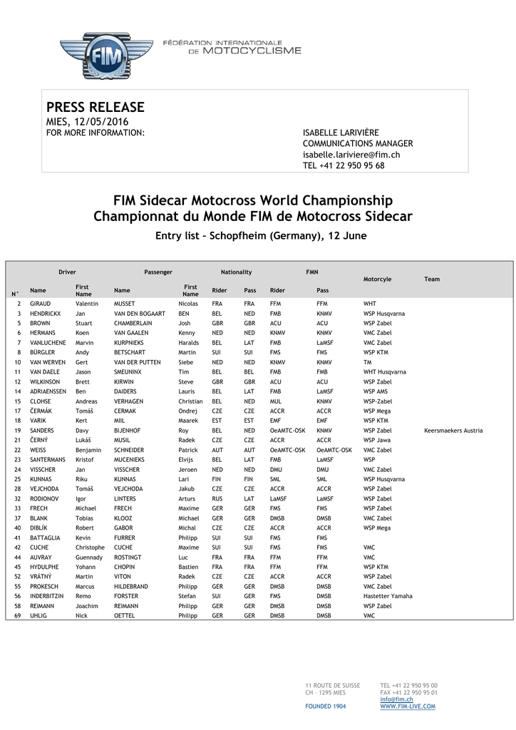 PRESS RELEASE MIES, 12/05/2016 FOR MORE INFORMATION: ISABELLE LARIVIÈRE COMMUNICATIONS MANAGER [email protected] TEL +41 22 950 95 68 FIM Sidecar Motocross World Championship Championnat du Monde FIM de Motocross Sidecar Entry list – Schopfheim (Germany), 12 June Driver Passenger Nationality FMN Motorcyle Name First Name Name 2 GIRAUD Valentin MUSSET 3 HENDRICKX Jan VAN DEN BOGAART 5 BROWN Stuart 6 HERMANS 7 8 First Name Rider Pass Rider Pass Nicolas FRA FRA FFM FFM WHT BEN BEL NED FMB KNMV WSP Husqvarna CHAMBERLAIN Josh GBR GBR ACU ACU WSP Zabel Koen VAN GAALEN Kenny NED NED KNMV KNMV VMC Zabel VANLUCHENE Marvin KURPNIEKS Haralds BEL LAT FMB LaMSF VMC Zabel BÜRGLER Andy BETSCHART Martin SUI SUI FMS FMS WSP KTM 10 VAN WERVEN Gert VAN DER PUTTEN Siebe NED NED KNMV KNMV TM 11 VAN DAELE Jason SMEUNINX Tim BEL BEL FMB FMB WHT Husqvarna 12 WILKINSON Brett KIRWIN Steve GBR GBR ACU ACU WSP Zabel 14 ADRIAENSSEN Ben DAIDERS Lauris BEL LAT FMB LaMSF WSP AMS 15 CLOHSE Andreas VERHAGEN Christian BEL NED MUL KNMV WSP-Zabel 17 ČERMÁK Tomáš CERMAK Ondrej CZE CZE ACCR ACCR WSP Mega 18 VARIK Kert MIIL Maarek EST EST EMF EMF WSP KTM 19 SANDERS Davy BIJENHOF Roy BEL NED OeAMTC-OSK KNMV WSP Zabel 21 ČERNÝ Lukáš MUSIL Radek CZE CZE ACCR ACCR WSP Jawa 22 WEISS Benjamin SCHNEIDER Patrick AUT AUT OeAMTC-OSK OeAMTC-OSK VMC Zabel 23 SANTERMANS Kristof MUCENIEKS Elvijs BEL LAT FMB LaMSF WSP 24 VISSCHER Jan VISSCHER Jeroen NED NED DMU DMU VMC Zabel 25 KUNNAS Riku KUNNAS Lari FIN FIN SML SML WSP Husqvarna 28 VEJCHODA Tomáš VEJCHODA Jakub CZE CZE ACCR ACCR WSP Zabel 32 RODIONOV Igor LINTERS Arturs RUS LAT LaMSF LaMSF WSP Zabel 33 FRECH Michael FRECH Maxime GER GER FMS FMS WSP Zabel 37 BLANK Tobias KLOOZ Michael GER GER DMSB DMSB VMC Zabel 40 DIBLÍK Robert GABOR Michal CZE CZE ACCR ACCR WSP Mega 41 BATTAGLIA Kevin FURRER Philipp SUI SUI FMS FMS 42 CUCHE Christophe CUCHE Maxime SUI SUI FMS FMS VMC 44 AUVRAY Guennady ROSTINGT Luc FRA FRA FFM FFM VMC 45 HYDULPHE Yohann CHOPIN Bastien FRA FRA FFM FFM WSP KTM 52 VRÁTNÝ Martin VITON Radek CZE CZE ACCR ACCR WSP Zabel 55 PROKESCH Marcus HILDEBRAND Philipp GER GER DMSB DMSB VMC Zabel 56 INDERBITZIN Remo FORSTER Stefan SUI GER FMS DMSB Hastetter Yamaha 58 REIMANN Joachim REIMANN Philipp GER GER DMSB DMSB WSP Zabel 69 UHLIG Nick OETTEL Philipp GER GER DMSB DMSB VMC N° 11 ROUTE DE SUISSE CH – 1295 MIES FOUNDED 1904 Team Keersmaekers Austria TEL +41 22 950 95 00 FAX +41 22 950 95 01 [email protected] WWW.FIM-LIVE.COM Driver Passenger Nationality FMN Motorcyle Name First Name Name 76 POZZI Hotmar CERESA 78 MECENE Anthony DUPRAT 82 BAX Etienne 86 FAUSTMANN 87 93 First Name Team Rider Pass Rider Pass Marco ITA ITA FMI FMI WSP Husqvarna Jimmy FRA FRA FFM FFM WHT Zabel BAX Robbie NED NED KNMV KNMV WSP Yamaha Marcel HALLER Andres GER GER DMSB DMSB VMC Zabel HENDRICKX Larris VAES Levi BEL BEL OeAMTC-OSK OeAMTC-OSK WSP Husqvarna HEINZER Marco BETSCHART Ruedi SUI SUI FMS FMS VMC KTM 100 SENZ Silvio NICKE Stefan GER GER DMSB DMSB VMC Zabel 111 WILLEMSEN Daniel BEUNK Peter NED NED KNMV KNMV WSP Zabel 117 DEPREZ Steven SERPIETERS Bjorn BEL BEL OeAMTC-OSK OeAMTC-OSK WSP Kawasaki Keersmaekers Austria 118 MATTHYS Stijn SABBE Dagwin BEL BEL OeAMTC-OSK OeAMTC-OSK WSP Zabel Keersmaekers Austria 128 VAN DER VEKEN Christof SMEUNINX Thomas BEL BEL OeAMTC-OSK OeAMTC-OSK VMC Zabel Keersmaekers Austria 132 COMPALATI Zeno PIANA Matteo ITA ITA FMI FMI WSP Zabel 133 PUDLO Lukáš HOTOVY Vaclav CZE CZE ACCR ACCR VMC Zabel 271 DIERCKENS Arne BOXTAELE Kenny BEL BEL OeAMTC-OSK OeAMTC-OSK VMC Zabel Keersmaekers Austria 338 GOEYVAERTS Stan MAAS Nick BEL NED OeAMTC-OSK OeAMTC-OSK VMC Zabel Keersmaekers Austria 444 JARVIS Nick NILSSON Christian GBR SWE ACU SVEMO WSP Husqvarna 714 DIERCKENS Kenneth VAN DEN BULCK Dennis BEL BEL OeAMTC-OSK OeAMTC-OSK VMC Zabel 911 PETER Adrian SCHLINNERTZ Andy GER BEL DMSB OeAMTC-OSK WSP Zabel N° Dakwerken Hendrickx / AMS Keersmaekers Austria ----------------------------------------------------------------------------------------------------------------------------------------------About the FIM (www.fim-live.com) The FIM (Fédération Internationale de Motocyclisme) founded in 1904, is the governing body for motorcycle sport and the global advocate for motorcycling. The FIM is an independent association formed by 113 National Federations throughout the world. It is recognised as the sole competent authority in motorcycle sport by the International Olympic Committee (IOC). Among its 50 FIM World Championships the main events are MotoGP, Superbike, Endurance, Motocross, Supercross, Trial, Enduro, Cross-Country Rallies and Speedway. Furthermore, the FIM is also active and involved in the following areas: public affairs, road safety, touring and protection of the environment. The FIM was the first international sports federation to impose an Environmental Code in 1994. 11 ROUTE DE SUISSE CH – 1295 MIES FOUNDED 1904 TEL +41 22 950 95 00 FAX +41 22 950 95 01 [email protected] WWW.FIM-LIVE.COM