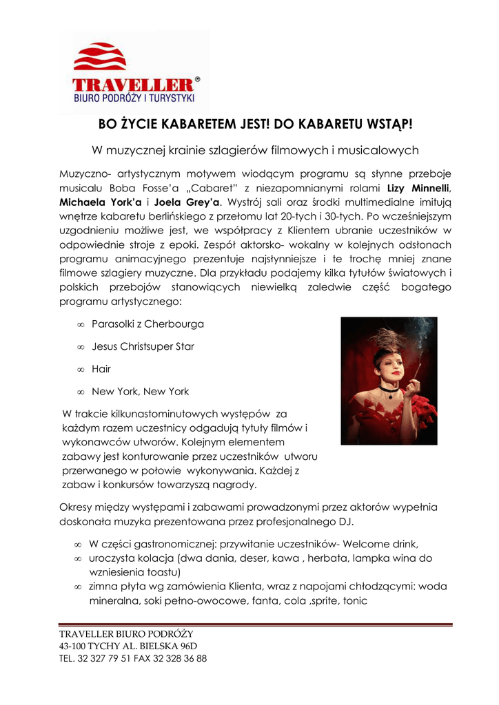 BO śYCIE KABARETEM JEST! DO KABARETU WSTĄP! W muzycznej krainie szlagierów filmowych i musicalowych Muzyczno- artystycznym motywem wiodącym programu są słynne przeboje musicalu Boba Fosse’a „Cabaret” z niezapomnianymi rolami Lizy Minnelli, Michaela York’a i Joela Grey’a. Wystrój sali oraz środki multimedialne imitują wnętrze kabaretu berlińskiego z przełomu lat 20-tych i 30-tych. Po wcześniejszym uzgodnieniu moŜliwe jest, we współpracy z Klientem ubranie uczestników w odpowiednie stroje z epoki. Zespół aktorsko- wokalny w kolejnych odsłonach programu animacyjnego prezentuje najsłynniejsze i te trochę mniej znane filmowe szlagiery muzyczne. Dla przykładu podajemy kilka tytułów światowych i polskich przebojów stanowiących niewielką zaledwie część bogatego programu artystycznego: • Parasolki z Cherbourga • Jesus Christsuper Star • Hair • New York, New York W trakcie kilkunastominutowych występów za kaŜdym razem uczestnicy odgadują tytuły filmów i wykonawców utworów. Kolejnym elementem zabawy jest konturowanie przez uczestników utworu przerwanego w połowie wykonywania. KaŜdej z zabaw i konkursów towarzyszą nagrody. Okresy między występami i zabawami prowadzonymi przez aktorów wypełnia doskonała muzyka prezentowana przez profesjonalnego DJ. • W części gastronomicznej: przywitanie uczestników- Welcome drink, • uroczysta kolacja (dwa dania, deser, kawa , herbata, lampka wina do wzniesienia toastu) • zimna płyta wg zamówienia Klienta, wraz z napojami chłodzącymi: woda mineralna, soki pełno-owocowe, fanta, cola ,sprite, tonic TRAVELLER BIURO PODRÓŻY 43-100 TYCHY AL. BIELSKA 96D TEL. 32 327 79 51 FAX 32 328 36 88 • incydentalne dodatki do zimnej płyty korespondujące z aktualnie realizowanym odcinkiem programu animacyjnego (skromne dodatki stanowią kulinarne tło prezentowanego programu ) • gorące danie wzmacniające • inne napoje, które mogą stanowić istotne wzmocnienie programu artystycznego wg zamówienia Klienta. TRAVELLER BIURO PODRÓŻY 43-100 TYCHY AL. BIELSKA 96D TEL. 32 327 79 51 FAX 32 328 36 88