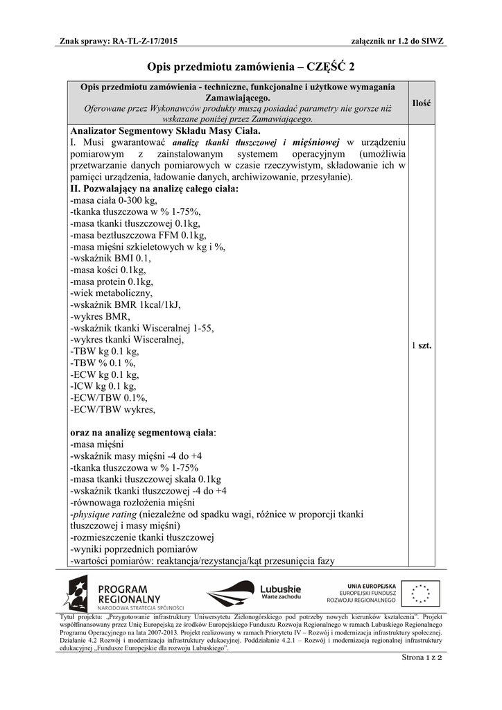 Znak sprawy: RA-TL-Z-17/2015 załącznik nr 1.2 do SIWZ Opis przedmiotu zamówienia – CZĘŚĆ 2 Opis przedmiotu zamówienia - techniczne, funkcjonalne i użytkowe wymagania Zamawiającego. Oferowane przez Wykonawców produkty muszą posiadać parametry nie gorsze niż wskazane poniżej przez Zamawiającego. Ilość Analizator Segmentowy Składu Masy Ciała. I. Musi gwarantować analizę tkanki tłuszczowej i mięśniowej w urządzeniu pomiarowym z zainstalowanym systemem operacyjnym (umożliwia przetwarzanie danych pomiarowych w czasie rzeczywistym, składowanie ich w pamięci urządzenia, ładowanie danych, archiwizowanie, przesyłanie). II. Pozwalający na analizę całego ciała: -masa ciała 0-300 kg, -tkanka tłuszczowa w % 1-75%, -masa tkanki tłuszczowej 0.1kg, -masa beztłuszczowa FFM 0.1kg, -masa mięśni szkieletowych w kg i %, -wskaźnik BMI 0.1, -masa kości 0.1kg, -masa protein 0.1kg, -wiek metaboliczny, -wskaźnik BMR 1kcal/1kJ, -wykres BMR, -wskaźnik tkanki Wisceralnej 1-55, -wykres tkanki Wisceralnej, 1 szt. -TBW kg 0.1 kg, -TBW % 0.1 %, -ECW kg 0.1 kg, -ICW kg 0.1 kg, -ECW/TBW 0.1%, -ECW/TBW wykres, oraz na analizę segmentową ciała: -masa mięśni -wskaźnik masy mięśni -4 do +4 -tkanka tłuszczowa w % 1-75% -masa tkanki tłuszczowej skala 0.1kg -wskaźnik tkanki tłuszczowej -4 do +4 -równowaga rozłożenia mięśni -physique rating (niezależne od spadku wagi, różnice w proporcji tkanki tłuszczowej i masy mięśni) -rozmieszczenie tkanki tłuszczowej -wyniki poprzednich pomiarów -wartości pomiarów: reaktancja/rezystancja/kąt przesunięcia fazy Tytuł projektu: „Przygotowanie infrastruktury Uniwersytetu Zielonogórskiego pod potrzeby nowych kierunków kształcenia”. Projekt współfinansowany przez Unię Europejską ze środków Europejskiego Funduszu Rozwoju Regionalnego w ramach Lubuskiego Regionalnego Programu Operacyjnego na lata 2007-2013. Projekt realizowany w ramach Priorytetu IV – Rozwój i modernizacja infrastruktury społecznej. Działanie 4.2 Rozwój i modernizacja infrastruktury edukacyjnej. Poddziałanie 4.2.1 – Rozwój i modernizacja regionalnej infrastruktury edukacyjnej „Fundusze Europejskie dla rozwoju Lubuskiego”. Strona 1 z 2 Znak sprawy: RA-TL-Z-17/2015 załącznik nr 1.2 do SIWZ III. Musi zawierać oprogramowanie kompatybilne z analizatorem składu ciała umożliwia zdalne sterowanie analizatorem z komputera i przechowywanie informacji o pacjentach wraz z wynikami pomiarów – tworzenie bazy pacjentów na komputerze. IV. Specyfikacja analizatora składu ciała musi spełniać następujące wymagania: 1. Normy MDD: CLASS IIa, NAVI CLASS III 2. Zasilanie: 230V AC(50/60Hz) 3. Zakres prądu: 0.3 A 4. System Pomiaru a) wieloczęstotliwościowa analiza bioimpedancji BIA b) min. 8 elektrod c) pomiar segmentowy 5. Częstotliwości pomiarowe o 1kHz/5kHz/50kHz/250kHz/500kHz/1000kHz 6. Prąd pomiarowy: 90 µA lub mniej 7. Elektrody: stal nierdzewna, 8. Pomiar segmentowy: o korpus/prawa ręka/lewa ręka/prawa noga/lewa noga 9. Zakres pomiaru: 75 - 1,500 Ω ze skala co 0.1 10. Dokładność przy pierwszej kalibracji ± 0.2 kg 11. Wyświetlacz: kolorowy panel 12. dotykowy 13. Interfejs 1) USB A-typ złącze (USB host) x 3 2) USB B-typ złącze (Device) x 1 3) LAN złącze x 1 4) Audio standard jack (Mic-in, Line-out) 14. Zakres temp. pracy: 5-36 C 15. Zakres wilgotności: 30-80% 16. Waga urządzenia: 30-33 kg 17. System operacyjny: odpowiadający urządzeniu 18. Procesor: odpowiadający urządzeniu 19. Pamięć: 450-512 MB 20. SSD: Compact Flash Typ1 4GB Tytuł projektu: „Przygotowanie infrastruktury Uniwersytetu Zielonogórskiego pod potrzeby nowych kierunków kształcenia”. Projekt współfinansowany przez Unię Europejską ze środków Europejskiego Funduszu Rozwoju Regionalnego w ramach Lubuskiego Regionalnego Programu Operacyjnego na lata 2007-2013. Projekt realizowany w ramach Priorytetu IV – Rozwój i modernizacja infrastruktury społecznej. Działanie 4.2 Rozwój i modernizacja infrastruktury edukacyjnej. Poddziałanie 4.2.1 – Rozwój i modernizacja regionalnej infrastruktury edukacyjnej „Fundusze Europejskie dla rozwoju Lubuskiego”. Strona 2 z 2
