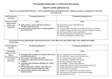 Wymagania edukacyjne z wychowania fizycznego klasaVI szkoły podstawowej DBAMY O NASZE BEZPIECZEŃSTWO – CZYLI ZACHOWUJEMY SIĘ BEZPIECZNIE W SZKOLE, W DOMU, NA DRODZE I W TERENIE NATURALNYM Treści kształcenia i nauczania Wymagania podstawowe Wymagania ponadpodstawowe Podstawowe zasady bezpieczeństwa podczas zajęć ruchowych Uczeń: Uczeń: ★ dobiera obuwie i strój w zależności od miejsca i warunków atmosferycznych ★ omawia sposoby postępowania w sytuacji zagrożenia zdrowia lub życia ★ ★ ★ ★ ★ ★ ★ bezpiecznie korzysta z dróg publicznych jeździ rowerem wymienia zasady zachowania się na drodze jako pieszy i rowerzysta wyjaśnia, dlaczego na drodze należy zachować szczególną ostrożność przestrzega ustalonych zasad i regulaminów pomaga kolegom podczas pokonywania toru przeszkód zachowuje się bezpiecznie podczas zajęć OCENIAMY WŁASNĄ SPRAWNOŚĆ I ROZWÓJ FIZYCZNY, CZYLI BIEGAMY SKACZEMY, RZUCAMY, MIERZYMY SIEBIE NAWZAJEM Treści kształcenia i nauczania Wymagania podstawowe Lekkoatletyka, Uczeń: atletyka terenowa – ★ wykonuje próbę oceniającą wytrzymałość tlenową oraz diagnoza siłę mięśni posturalnych sprawności fizycznej ★ mierzy tętno w spoczynku i po wysiłku oraz rozwoju ★ wykonuje bez zatrzymania marszowo-biegowy test fizycznego Cooper‘a ★ wykonuje próbę wielobojową składającą się z biegu, skoku i rzutu ★ dokonuje pomiarów wysokości i masy ciała oraz z pomocą nauczyciela interpretuje ich wyniki. ★ omawia sposoby ochrony przed nadmiernym nasłonecznieniem Wymagania ponadpodstawowe Uczeń: ★ ★ ★ ★ ★ ★ ★ ★ ★ ★ ★ ★ jest zaangażowany w wykonywane zadania jest zadowolony z zabawy na świeżym powietrzu dba o bezpieczeństwo swoje i innych jest kulturalny i koleżeński wobec innych przestrzega ustalonych zasad i reguł jest dokładny w wykonywaniu pomiarów pomaga innym podczas wykonywania prób sprawnościowych pomaga innym podczas wykonywania pomiarów szanuje środowisko naturalne angażuje się w przygotowanie i prowadzenie zabawy wyraża pozytywny stosunek do wychowania fizycznego dokonuje prób samooceny ★ dokonuje pomiaru szybkości, skoczności i rzutu oraz za pomocą nauczyciela interpretuje wyniki ★ prawidłowo wykonuje start niski i wysoki ★ posługuje się wybranym testem sprawnościowym ★ organizuje proste zawody lekkoatletyczne ★ wymienia wybrane próby różnych testów motorycznych ★ wyjaśnia, jak przygotować się do lekcji w terenie ★ omawia technikę biegu, skoku i rzutu ★ wyjaśnia, jak posługiwać się stoperem i taśmą mierniczą ★ wyjaśnia pojęcie szybkość, siła, skoczność, wytrzymałość ★ omawia zależność pomiędzy wagą ciała a zdrowiem ★ wyjaśnia, na czym powinien przebiegać prawidłowy rozwój. WSPÓŁPRACUJEMY W ZESPOLE, CZYLI UPRAWIAMY MINIGRY SPORTOWE Treści kształcenia i nauczania Wymagania podstawowe Wymagania ponadpodstawowe Minipiłka ręczna Uczeń: Uczeń: ★ ★ ★ ★ ★ ★ ★ ★ ★ respektuje przepisy gry podporządkowuje się decyzjom sędziego dziękuje przeciwnikowi za wspólną grę stosuje w grze: przeprowadzenie piłki w biegu ze zmiana kierunku ruchu, podanie piłki oburącz i jednorącz, rzut piłki do bramki stosuje w grze kozłowanie piłki w biegu ze zmianą kierunku ruchu uczestniczy w sportowych rozgrywkach klasowych omawia dobór odpowiedniego stroju i obuwia do ćwiczeń, w zależności od miejsca zajęć oraz pogody. wyjaśnia, dlaczego należy przestrzegać ustalonych reguł w trakcie rywalizacji sportowej wyjaśnia zasady kulturalnego kibicowania ★ ★ ★ ★ ★ ★ ★ ★ ★ ★ ★ ★ jest odpowiedzialny za siebie i innych w czasie gry współpracuje w zespole cieszy się ze zwycięstwa i godnie znosi porażkę zachowuje bezpieczeństwo podczas gry jest kulturalny podczas gry wykonuje rzuty na bramkę po wyminięciu obrońcy wykonuje rzut piłką na bramkę z biegu i z wyskoku wykonuje obronę strefą i „krycie każdy swego” dokonuje próby ataku szybkiego wymienia podstawowe przepisy gry w minipiłkę ręczną wymienia czołowe polskie drużyny piłki ręcznej rozumie sens współdziałania w zespole Minipiłka nożna Uczeń: ★ stosuje zasady czystej gry podczas rozgrywania meczu ★ stosuje w grze: prowadzenie piłki nogą w biegu, strzał piłką do bramki ★ uczestniczy w sportowych rozgrywkach klasowych ★ omawia dobór stroju i obuwia do ćwiczeń w zależności od zajęć oraz pogody ★ wyjaśnia, dlaczego należy przestrzegać ustalonych reguł w trakcie rywalizacji sportowej ★ wyjaśnia zasady kulturalnego kibicowania Minipiłka siatkowa Uczeń: ★ ★ ★ ★ ★ ★ ★ ★ ★ ★ ★ ★ ★ ★ ★ ★ ★ ★ jest bardzo aktywny na zajęciach zachowuje bezpieczeństwo gry cieszy się ze zwycięstwa i godnie znosi porażkę samodzielnie doskonali swoje umiejętności w czasie wolnym od nauki wykazuje chęć uczestniczenia w grze w czasie wolnym od nauki odpowiednio zachowuje się w roli zawodnika, sędziego i kibica. prowadzi piłkę z omijaniem przeszkód pełni rolę bramkarza przyjmuje piłkę udem rozwija swoją szybkość, zwinność i koordynację ruchową stosuje zwody podczas gry organizuje rozgrywki klasowe odbija piłkę głową podczas gry zna podstawową terminologię piłkarską wymienia czołowe polskie i zagraniczne kluby piłkarskie wymienia regionalne kluby piłkarskie wymienia podstawowe przepisy gry opisuje technikę wykonania podstawowych elementów gry Uczeń: ★ ★ ★ ★ ★ ★ ★ ★ ★ ★ ★ ★ ★ współpracuje w zespole cieszy się ze zwycięstwa i godnie znosi porażkę sprawiedliwie podlicza zdobyte punkty stara się podnosić własne umiejętności dokonuje próby wykonania zagrywki górnej stosuje w grze odbicia piłki sposobem dolnym oburącz i jednorącz wystawia piłkę partnerowi organizuje z kolegami w czasie wolnym mecz piłki siatkowej pełni rolę zawodnika, sędziego, kibica wyjaśnia rolę p