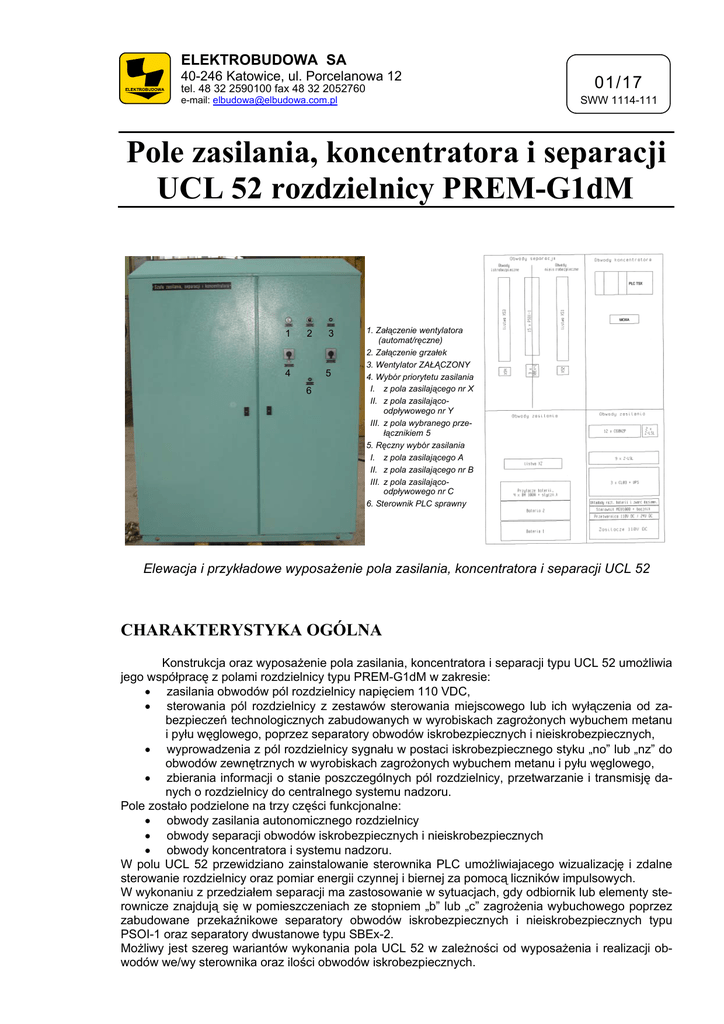ELEKTROBUDOWA SA 40-246 Katowice, ul. Porcelanowa 12 tel. 48 32 2590100 fax 48 32 2052760 01/17 SWW 1114-111 e-mail: [email protected] Pole zasilania, koncentratora i separacji UCL 52 rozdzielnicy PREM-G1dM 1 2 4 3 5 6 1. Załączenie wentylatora (automat/ręczne) 2. Załączenie grzałek 3. Wentylator ZAŁĄCZONY 4. Wybór priorytetu zasilania I. z pola zasilającego nr X II. z pola zasilającoodpływowego nr Y III. z pola wybranego przełącznikiem 5 5. Ręczny wybór zasilania I. z pola zasilającego A II. z pola zasilającego nr B III. z pola zasilającoodpływowego nr C 6. Sterownik PLC sprawny Elewacja i przykładowe wyposażenie pola zasilania, koncentratora i separacji UCL 52 CHARAKTERYSTYKA OGÓLNA Konstrukcja oraz wyposażenie pola zasilania, koncentratora i separacji typu UCL 52 umożliwia jego współpracę z polami rozdzielnicy typu PREM-G1dM w zakresie: • zasilania obwodów pól rozdzielnicy napięciem 110 VDC, • sterowania pól rozdzielnicy z zestawów sterowania miejscowego lub ich wyłączenia od zabezpieczeń technologicznych zabudowanych w wyrobiskach zagrożonych wybuchem metanu i pyłu węglowego, poprzez separatory obwodów iskrobezpiecznych i nieiskrobezpiecznych, • wyprowadzenia z pól rozdzielnicy sygnału w postaci iskrobezpiecznego styku „no” lub „nz” do obwodów zewnętrznych w wyrobiskach zagrożonych wybuchem metanu i pyłu węglowego, • zbierania informacji o stanie poszczególnych pól rozdzielnicy, przetwarzanie i transmisję danych o rozdzielnicy do centralnego systemu nadzoru. Pole zostało podzielone na trzy części funkcjonalne: • obwody zasilania autonomicznego rozdzielnicy • obwody separacji obwodów iskrobezpiecznych i nieiskrobezpiecznych • obwody koncentratora i systemu nadzoru. W polu UCL 52 przewidziano zainstalowanie sterownika PLC umożliwiajacego wizualizację i zdalne sterowanie rozdzielnicy oraz pomiar energii czynnej i biernej za pomocą liczników impulsowych. W wykonaniu z przedziałem separacji ma zastosowanie w sytuacjach, gdy odbiornik lub elementy sterownicze znajdują się w pomieszczeniach ze stopniem „b” lub „c” zagrożenia wybuchowego poprzez zabudowane przekaźnikowe separatory obwodów iskrobezpiecznych i nieiskrobezpiecznych typu PSOI-1 oraz separatory dwustanowe typu SBEx-2. Możliwy jest szereg wariantów wykonania pola UCL 52 w zależności od wyposażenia i realizacji obwodów we/wy sterownika oraz ilości obwodów iskrobezpiecznych. DANE TECHNICZNE Dane znamionowe Typ pola zasilania, koncentratora i separacji Napięcie zasilania: autonomiczne (z pola zasilającego lub pomiarow. rozdzielnicy) zewnętrzne (z poza rozdzielnicy) Napięcie zasilania obwodów iskrobezpiecznych Napięcie znamionowe izolacji Zasilacz UPS moc czas podtrzymania Sterownik PLC Zestaw baterii Separatory dwustanowe Stopień ochrony: Wymiary gabarytowe pola: szerokość wysokość głębokość Masa pola Zgodność z normami UCL 52 230 V AC, 50 Hz 230 V AC, 50 Hz 24 V DC 500 V AC wg. uzgodnień wg. uzgodnień wg. uzgodnień 9x12V 17Ah PSOI-1, SBEx-2 IP 54 1450 mm 2000 mm 600 mm ok. 100 kg Dyrektywy LVD i EMC, PN-EN 60529:2003, PN-EN 60439-1:2003, PN-G-50003:2003, PN-G-42041:1997, PN-G-50006:1997 Pole UCL 52 zostało przebadane w Laboratorium Badań Stosowanych CMG KOMAG. Pozytywny wynik badań został potwierdzony w Opinii Nr 363/AO/2008 wydanej przez ZBA CMG KOMAG. Decyzją Prezesa Wyższego Urzędu Górniczego w Katowicach pole zostało dopuszczone do stosowania w wyrobiskach podziemnych zakładów górniczych. Warunki środowiskowe Pole zasilania, koncentratora i separacji UCL 52 może być instalowane w wydzielonym pomieszczeniu ruchu elektrycznego zaliczanym do stopnia „a” niebezpieczeństwa wybuchu metanu i klasy A zagrożenia wybuchem pyłu węglowego. Warunki pracy wg PN-G-50003:2003 - temperatura otoczenia od 0oC do +40oC 0 - wilgotność względna w temperaturze do +40 C do 95% - max wilgotność wzgl. w temp. +25oC i niższych 100% z możliwością kondensacji pary Stopień agresywności korozyjnej wg PN-71/H-04651 C INFORMACJE DODATKOWE Szczegółowe informacje zawiera Katalog Rozdzielnicy SN typu PREM-G1dM. ELEKTROBUDOWA SA STOSUJE POTWIERDZONE CERTYFIKATAMI SYSTEMY ZARZĄDZANIA ZGODNE Z ISO 9001, ISO 14001, AQAP-110 SPOSÓB ZAMÓWIENIA Zapytania ofertowe i zamówienia prosimy kierować do Biur Marketingu producenta. PRODUCENT: Oddział Spółki Rynek Dystrybucji Energii 62-505 Konin, ul. Przemysłowa 156 tel. 48 63 2466 200 fax 48 63 2427 292 e-mail: [email protected] BIURA MARKETINGU Region Północny Region Południowy Region Zachodni 62-505 Konin, ul. Przemysłowa 156 40-246 Katowice, ul. Porcelanowa 12 53-009 Wrocław, ul. Ożynowa 32 tel. 63 2466 214 fax 63 2427 162 tel. 32 2590 167 fax 32 2590 340 tel. 71 3906 154 fax 71 3608 934 e-mail: [email protected] e-mail:[email protected] e-mail: [email protected] Opracowano: sierpień 2010 Producent zastrzega sobie prawo do wprowadzania zmian