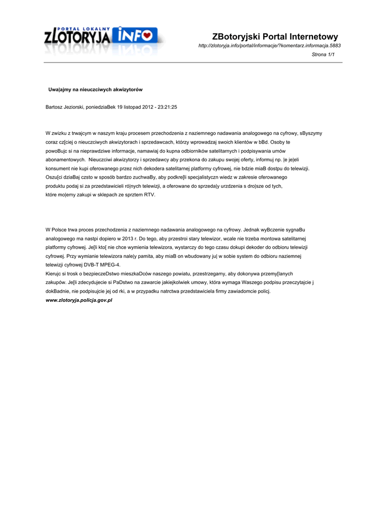 ZBotoryjski Portal Internetowy http://zlotoryja.info/portal/informacje/?komentarz.informacja.5883 Strona 1/1 Uwa|ajmy na nieuczciwych akwizytorów Bartosz Jeziorski, poniedziaBek 19 listopad 2012 - 23:21:25 W zwizku z trwajcym w naszym kraju procesem przechodzenia z naziemnego nadawania analogowego na cyfrowy, sByszymy coraz cz[ciej o nieuczciwych akwizytorach i sprzedawcach, którzy wprowadzaj swoich klientów w bBd. Osoby te powoBujc si na nieprawdziwe informacje, namawiaj do kupna odbiorników satelitarnych i podpisywania umów abonamentowych. Nieuczciwi akwizytorzy i sprzedawcy aby przekona do zakupu swojej oferty, informuj np. |e je|eli konsument nie kupi oferowanego przez nich dekodera satelitarnej platformy cyfrowej, nie bdzie miaB dostpu do telewizji. Oszu[ci dziaBaj czsto w sposób bardzo zuchwaBy, aby podkre[li specjalistyczn wiedz w zakresie oferowanego produktu podaj si za przedstawicieli ró|nych telewizji, a oferowane do sprzeda|y urzdzenia s dro|sze od tych, które mo|emy zakupi w sklepach ze sprztem RTV. W Polsce trwa proces przechodzenia z naziemnego nadawania analogowego na cyfrowy. Jednak wyBczenie sygnaBu analogowego ma nastpi dopiero w 2013 r. Do tego, aby przestroi stary telewizor, wcale nie trzeba montowa satelitarnej platformy cyfrowej. Je[li kto[ nie chce wymienia telewizora, wystarczy do tego czasu dokupi dekoder do odbioru telewizji cyfrowej. Przy wymianie telewizora nale|y pamita, aby miaB on wbudowany ju| w sobie system do odbioru naziemnej telewizji cyfrowej DVB-T MPEG-4. Kierujc si trosk o bezpieczeDstwo mieszkaDców naszego powiatu, przestrzegamy, aby dokonywa przemy[lanych zakupów. Je[li zdecydujecie si PaDstwo na zawarcie jakiejkolwiek umowy, która wymaga Waszego podpisu przeczytajcie j dokBadnie, nie podpisujcie jej od rki, a w przypadku natrctwa przedstawiciela firmy zawiadomcie policj. www.zlotoryja.policja.gov.pl