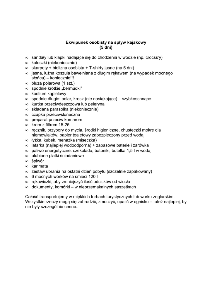 Ekwipunek osobisty na spływ kajakowy (5 dni) • • • • • • • • • • • • • • • • • • • • • • • • sandały lub klapki nadające się do chodzenia w wodzie (np. crocss’y) kaloszki (niekoniecznie) skarpety + bielizna osobista + T-shirty jasne (na 5 dni) jasna, luźna koszula bawełniana z długim rękawem (na wypadek mocnego słońca) – koniecznie!!! bluza polarowa (1 szt.) spodnie krótkie „bermudki” kostium kąpielowy spodnie długie: polar, kresz (nie nasiąkające) – szybkoschnące kurtka przeciwdeszczowa lub peleryna składana parasolka (niekoniecznie) czapka przeciwsłoneczna preparat przeciw komarom krem z filtrem 15-25 ręcznik, przybory do mycia, środki higieniczne, chusteczki mokre dla niemowlaków, papier toaletowy zabezpieczony przed wodą łyżka, kubek, menażka (miseczka) latarka (najlepiej wodoodporna) + zapasowe baterie i żarówka paliwo energetyczne: czekolada, batoniki, butelka 1,5 l w wodą ulubione płatki śniadaniowe śpiwór karimata zestaw ubrania na ostatni dzień pobytu (szczelnie zapakowany) 6 mocnych worków na śmieci 120 l rękawiczki, aby zmniejszyć ilość odcisków od wiosła dokumenty, komórki – w nieprzemakalnych saszetkach Całość transportujemy w miękkich torbach turystycznych lub worku żeglarskim. Wszystkie rzeczy mogą się zabrudzić, zmoczyć, upalić w ognisku – toteż najlepiej, by nie były szczególnie cenne...