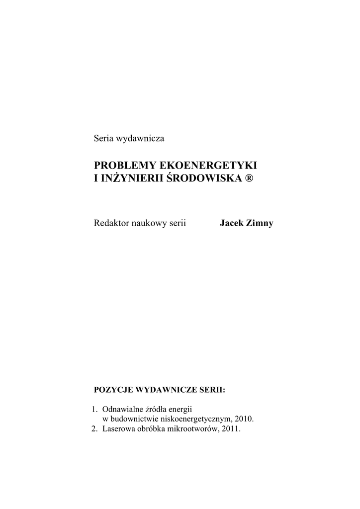 ródła energii dzynarodowych i krajowych zespołów badawczo cz), kolektory słoneczne i fotoogniwa (AR Kraków, P Zakłady Mechaniczne Tarnów), energetyka geotermalna i pompy ciepła (PAN Kraków, Polska aków, Zakłady Mechaniczne Tanów, Współzało złonek International ołowskiego. Wieloletni członek Komitetu Problemów Energ tarnego Zespołu ds. Restrukturyzacji Energetyki, ek Autor przeszło 400 publikacji, ekspertyz, patentów Prowadzi działalno i społeczn rozwoju gospodarczego Polski z wykorzystaniem własn ródeł energii, szczególnie geotermicznych, pomp ciepła oraz solarnych z uw dnieniem współczesnych technik wy gii energetycznych oraz stałego zwi . Ryszard Henryk Kozłowski, Politechnika Krakowska . Wacław Przybyło, Wojskowa Akademia Techniczna, Wa Płk dr in . Mieczysław Stru , PGA, Politechnika Wrocławska Projekt okładki: Łukasz Buchała, Jacek Zimny Na okładce: Grafika, skład, łamanie: Współpraca: Szkoła Ochrony i In Towarzystwo Słowaków w Polsce 1.2. Zasada działania lasera z ciałem stałym ...... 1.3. Zasada działania lasera gazowego He - Ne. .... 1.4. Zasada działania lasera molekularnego CO Wła dzie w obróbce materiałów ......................... ce laserowej obróbce materiałów ................... 3.1. Pochłanianie energii ......................... 3.2. Nagrzewanie materiału obrabianego bez niszczen 3.3. Topnienie i usuwanie materiału ............... cie materiału...................................... 5.1.3. Materiały obrabiane ........................ 5.2.1. Wpływ warunków obróbki laserowej na g 5.2.2. Analiza graficzna wpływu warunków obróbki la 5.3.1. Wpływ parametrów obróbki laserowej na wydajn a) ołów (Pb) ...................................... 5.6.2. Geometria powierzchni na przekroju podłu 6.2. Wpływ warunków obróbki laserowej na g kszenia dokładno 8.2. Kształtowanie charakterystyki impulsu ........ dzenia laserowe stosowane w obróbce materiałów .... 9.4. Przykłady zastosowa i Współpracowników, w wiod Maszyn Przepływowych PAN w Gda (Uniwersytet w Pizie, Włochy w ramach Umowy Mi dzynarodowej o Współpracy współczesnych metod kształtowania elementów maszyn, urz Mimo stałego rozwoju zastosowa laserowych, stałym niedostatkiem s ce z braku pełnego poznania zjawisk fizycz ka składa si z 11 rozdziałów, po podczas korzystania z laserów przemysłowych du działania laserów o pracy impulsowej i ci głej Rozdział 2. Dotyczy wła cieplnej i powierzchniowej, kształtowania budowy i własno ce laserowej obróbce materiałów Rozdział 4. dotyczy podstaw technologii obróbki las le stałym. własnych procesu i skutków erozji fotono c do tego celu współ identyfikacji zło po obróbce laserowej (LBM), formułuj Rozdział 7. zawiera sposoby zwi kszenia dokładno ci wymiarowo-kształtowej oraz wy Rozdział 10. dotyczy bezpiecze yciu człowieka. Rozdział 11. stanowi obszerna literatura z zakresu Niniejsza publikacja jest rozszerzeniem i uzupełnie rej recenzentami byli płk. prof. Zbigniew Puzewicz w Warszawie oraz prof. Michał Semena z Politechniki ki: Panu Profesorowi Ryszardowi H. Kozłoworowi Wacławowi Przybyło z Wojskowej Moim Współpracownikom na Wydziale In . Michałowi Karchowi oraz mgr in ce: budowy i działania laserów technologicznych (rozdział 1.), charakterystyki impulsu laserowego (rozdział 2.), fizycznych modeli erozji fotonowej (rozdział 3.), podstaw technologii obróbki laserowej otworów (rozdział 4.). (rozdział 4.) przedstawiono wyniki bada noskrawalnych (rozdział 5.). Po omówieniu szczegółowego programu bada (rozdział 5.1.), zawieraj ci (rozdział 5.1.1.), metodyk dział 5.1.2.), materiały badane (rozdział 5.1.3.), pomiarów (rozdział 5.1.4.), w cz drugiej rozdziału 5. przedstawiono wyniki obróbki jednoimpulsowej (rozdział 5.2.-5.3.) metali czystych oraz stali trudnoskrawalnych (rozdział 5.4 lono: wpływ charakterystyki impulsu na warto e wpływ g ci procesu (rozdział 5.3.-5.5.) – powierzchni materiałów po obróbce: warstwy wierzchniej (rozdział 5.6.); badania struktury i wła ał 5.7.) w celu optymalizacji jedno- i wielo pozwoliły na okre wykazała, i dego badanego materiału mo z uwagi na wła ci materiałowe i optymaln , dla której przebieg procesu erozji materiału i je liwiałby dowolne kojarzenie energii impulsu i czasu e najlepsze wła ”, tzw. kryształów zamro białej”. lono wpływ charakterystyki ci mocy, wpływ g wpływ liczby impulsów na wymiary geometryczne otwor cesu technologicznego obróbki laserowej” (rozdział kszania dokładno na tzw. aktywnym kształtowaniu charakterystyki imp Rozdział 10. dotyczy warunków bezpiecze yciu człowieka. ki zawiera bibliografia (rozdział 11.).