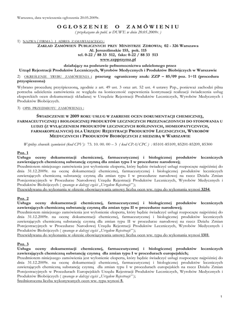 Warszawa, data wywieszenia ogłoszenia 20.05.2009r. OGŁOSZENIE O ZAMÓWIENIU ( przekazano do publ. w DUWE w dniu 20.05.2009r. ) 1) NAZWA ( FIRMA ) I ADRES ZAMAWIAJĄCEGO : ZAKŁAD ZAMÓWIEŃ PUBLICZNYCH PRZY MINISTRZE ZDROWIA; 02 - 326 Warszawa Al. Jerozolimskie 155, pok. 115 tel. 0-22 / 88 33 512, faks: 0-22 / 88 33 513 www.zzpprzymz.pl działający na podstawie pełnomocnictwa udzielonego przez Urząd Rejestracji Produktów Leczniczych, Wyrobów Medycznych i Produktów Biobójczych w Warszawie 2) OKREŚLENIE TRYBU ZAMÓWIENIA : przetarg ograniczony znak: ZZP – 85/09 poz. 1÷11 (procedura przyspieszona) Wybrano procedurę przyśpieszoną, zgodnie z art. 49 ust. 3 oraz art. 52 ust. 4 ustawy Pzp., ponieważ zachodzi pilna potrzeba udzielenia zamówienia ze względu na konieczność zapewnienia kontynuacji realizacji świadczenia usług eksperckich ocen dokumentacji składanej w Urzędzie Rejestracji Produktów Leczniczych, Wyrobów Medycznych i Produktów Biobójczych. 3) OPIS PRZEDMIOTU ZAMÓWIENIA : ŚWIADCZENIE W 2009 ROKU USŁUG W ZAKRESIE OCEN DOKUMENTACJI CHEMICZNEJ, FARMACEUTYCZNEJ I BIOLOGICZNEJ PRODUKTÓW LECZNICZYCH PRZEZNACZONYCH DO STOSOWANIA U LUDZI (Z WYŁĄCZENIEM PRODUKTÓW LECZNICZYCH ROŚLINNYCH, HOMEOPATYCZNYCH, FARMAKOPEALNYCH) DLA URZĘDU REJESTRACJI PRODUKTÓW LECZNICZYCH, WYROBÓW MEDYCZNYCH I PRODUKTÓW BIOBÓJCZYCH Z SIEDZIBĄ W WARSZAWIE Wspólny słownik zamówień (kod CPV): 73. 10. 00. 00 – 3 ( kod CPA/CPC ) : 85101-85109, 85201-85209, 85300 Poz. 1 Usługa oceny dokumentacji chemicznej, farmaceutycznej i biologicznej produktów leczniczych zawierających chemiczną substancję czynną dla zmian typu I w procedurze narodowej; Przedmiotem niniejszego zamówienia jest wyłonienie eksperta, który będzie świadczyć usługi rozpoczęte najpóźniej do dnia 31.12.2009r. na ocenę dokumentacji chemicznej, farmaceutycznej i biologicznej produktów leczniczych zawierających chemiczną substancję czynną dla zmian typu I w procedurze narodowej na rzecz Działu Zmian Porejestracyjnych w Procedurze Narodowej Urzędu Rejestracji Produktów Leczniczych, Wyrobów Medycznych i Produktów Biobójczych ( zwanego w dalszej części „Urzędem Rejestracji” ); Przewidywana do wykonania w okresie obowiązywania umowy liczba ocen ww. typu do wykonania wynosi 3254. Poz. 2 Usługa oceny dokumentacji chemicznej, farmaceutycznej i biologicznej produktów leczniczych zawierających chemiczną substancję czynną dla zmian typu II w procedurze narodowej; Przedmiotem niniejszego zamówienia jest wyłonienie eksperta, który będzie świadczyć usługi rozpoczęte najpóźniej do dnia 31.12.2009r. na ocenę dokumentacji chemicznej, farmaceutycznej i biologicznej produktów leczniczych zawierających chemiczną substancję czynną dla zmian typu II w procedurze narodowej na rzecz Działu Zmian Porejestracyjnych w Procedurze Narodowej Urzędu Rejestracji Produktów Leczniczych, Wyrobów Medycznych i Produktów Biobójczych ( zwanego w dalszej części „Urzędem Rejestracji” ); Przewidywana do wykonania w okresie obowiązywania umowy liczba ocen ww. typu do wykonania wynosi 1311. Poz. 3 Usługa oceny dokumentacji chemicznej, farmaceutycznej i biologicznej produktów leczniczych zawierających chemiczną substancję czynną dla zmian typu I w procedurach europejskich; Przedmiotem niniejszego zamówienia jest wyłonienie eksperta, który będzie świadczyć usługi rozpoczęte najpóźniej do dnia 31.12.2009r. na ocenę dokumentacji chemicznej, farmaceutycznej i biologicznej produktów leczniczych zawierających chemiczną substancję czynną dla zmian typu I w procedurach europejskich na rzecz Działu Zmian Porejestracyjnych w Procedurach Europejskich Urzędu Rejestracji Produktów Leczniczych, Wyrobów Medycznych i Produktów Biobójczych ( zwanego w dalszej części „Urzędem Rejestracji” ); Średnioroczna liczba wykonywanych ocen ww. typu wynosi 5. 1 Poz. 4 Usługa oceny dokumentacji chemicznej, farmaceutycznej i biologicznej produktów leczniczych zawierających chemiczną substancję czynną dla zmian typu II w procedurach europejskich; Przedmiotem niniejszego zamówienia jest wyłonienie eksperta, który będzie świadczyć usługi rozpoczęte najpóźniej do dnia 31.12.2009r. na ocenę dokumentacji chemicznej, farmaceutycznej i biologicznej produktów leczniczych zawierających chemiczną substancję czynną dla zmian typu II w procedurach europejskich na rzecz Działu Zmian Porejestracyjnych w Procedurach Europejskich Urzędu Rejestracji Produktów Leczniczych, Wyrobów Medycznych i Produktów Biobójczych ( zwanego w dalszej części „Urzędem Rejestracji” ); Średnioroczna liczba wykonywanych ocen ww. typu wynosi 20. Poz. 5 Usługa oceny dokumentacji chemicznej, farmaceutycznej i biologicznej produktów leczniczych radiofarmaceutycznych dla zmian typu I w procedurze narodowej; Przedmiotem niniejszego zamówienia jest wyłonienie eksperta, który będzie świadczyć usługi rozpoczęte najpóźniej do dnia 31.12.2009r. na ocenę dokumentacji chemicznej, farmaceutycznej i biologicznej produktów leczniczych radiofarmaceutycznych dla zmian typu I w procedurze narodowej na rzecz Działu Zmian Porejestracyjnych w Procedurze Narodowej Urzędu Rejestracji Produktów Leczniczych, Wyrobów Medycznych i Produktów Biobójczych ( zwanego w dalszej części „Urzędem Rejestracji” ); Przewidywana do wykonania w okresie obowiązywania umowy liczba ocen ww. typu do wykonania wynosi 30. Poz. 6 Usługa oceny dokumentacji chemicznej, farmaceutycznej i biologicznej produktów leczniczych radiofarmaceutycznych dla zmian typu II w procedurze narodowej; Przedmiotem niniejszego zamówienia jest wyłonienie eksperta, który będzie świadczyć usługi rozpoczęte najpóźniej do dnia 31.12.2009r. na ocenę dokumentacji chemicznej, farmaceutycznej i biologicznej produktów leczniczych radiofarmaceutycznych dla zmian typu II w procedurze narodowej na rzecz Działu Zmian Porejestracy