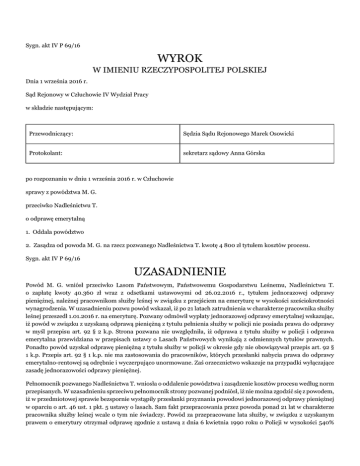 Sygn. akt IV P 69/16 WYROK W IMIENIU RZECZYPOSPOLITEJ POLSKIEJ Dnia 1 września 2016 r. Sąd Rejonowy w Człuchowie IV Wydział Pracy w składzie następującym: Przewodniczący: Sędzia Sądu Rejonowego Marek Osowicki Protokolant: sekretarz sądowy Anna Górska po rozpoznaniu w dniu 1 września 2016 r. w Człuchowie sprawy z powództwa M. G. przeciwko Nadleśnictwu T. o odprawę emerytalną 1. Oddala powództwo 2. Zasądza od powoda M. G. na rzecz pozwanego Nadleśnictwa T. kwotę 4 800 zł tytułem kosztów procesu. Sygn. akt IV P 69/16 UZASADNIENIE Powód M. G. wniósł przeciwko Lasom Państwowym, Państwowemu Gospodarstwu Leśnemu, Nadleśnictwu T. o zapłatę kwoty 40.360 zł wraz z odsetkami ustawowymi od 26.02.2016 r., tytułem jednorazowej odprawy pieniężnej, należnej pracownikom służby leśnej w związku z przejściem na emeryturę w wysokości sześciokrotności wynagrodzenia. W uzasadnieniu pozwu powód wskazał, iż po 21 latach zatrudnienia w charakterze pracownika służby leśnej przeszedł 1.01.2016 r. na emeryturę. Pozwany odmówił wypłaty jednorazowej odprawy emerytalnej wskazując, iż powód w związku z uzyskaną odprawą pieniężną z tytułu pełnienia służby w policji nie posiada prawa do odprawy w myśl przepisu art. 92 § 2 k.p. Strona pozwana nie uwzględniła, iż odprawa z tytułu służby w policji i odprawa emerytalna przewidziana w przepisach ustawy o Lasach Państwowych wynikają z odmiennych tytułów prawnych. Ponadto powód uzyskał odprawę pieniężną z tytułu służby w policji w okresie gdy nie obowiązywał przepis art. 92 § 1 k.p. Przepis art. 92 § 1 k.p. nie ma zastosowania do pracowników, których przesłanki nabycia prawa do odprawy emerytalno-rentowej są odrębnie i wyczerpująco unormowane. Zaś orzecznictwo wskazuje na przypadki wyłączające zasadę jednorazowości odprawy pieniężnej. Pełnomocnik pozwanego Nadleśnictwa T. wniosła o oddalenie powództwa i zasądzenie kosztów procesu według norm przepisanych. W uzasadnieniu sprzeciwu pełnomocnik strony pozwanej podniósł, iż nie można zgodzić się z powodem, iż w przedmiotowej sprawie bezspornie wystąpiły przesłanki przyznania powodowi jednorazowej odprawy pieniężnej w oparciu o art. 46 ust. 1 pkt. 5 ustawy o lasach. Sam fakt przepracowania przez powoda ponad 21 lat w charakterze pracownika służby leśnej wcale o tym nie świadczy. Powód za przepracowane lata służby, w związku z uzyskanym prawem o emerytury otrzymał odprawę zgodnie z ustawą z dnia 6 kwietnia 1990 roku o Policji w wysokości 540% miesięcznego uposażenia na ostatnio zajmowanym stanowisku służbowym. Z art. 92 § 2 k.p., wynika, że pracownik, który otrzymał odprawę emerytalną nie może ponownie nabyć do niej prawa. Ustawodawca określił tym samym prawo do odprawy emerytalnej jako uprawnienie jednorazowe. U pozwanego brak jest wewnętrznych regulacji, które dopuszczałyby możliwość wypłaty odprawy emerytalnej po raz wtóry. Wobec faktu, że powodowi została wypłacona, zgodnie z przepisami ustawy o policji, odprawa emerytalna, w wyniku ponownego jego przejścia na emeryturę kolejna odprawa emerytalna zgodnie z art. 921 § 2 k.p. jak również z obowiązującą linią orzecznictwa, przytoczoną w treści sprzeciwu, nie przysługuje. Sąd ustalił, następujący stan faktyczny: Powód M. G. był zatrudniony w Nadleśnictwie T. od 1.12.1994 r. do 31.12.2015 r. ostatnio na stanowisku starszego strażnika leśnego. (dowód: świadectwo pracy powoda k.13). M. G. 23.12.2015 r. złożył wniosek o rozwiązanie umowy o pracę z dniem 31.12.2015 r. na mocy porozumienia stron w związku z posiadaniem uprawnień do emerytury. (dowód: k.8). Pozwany pracodawca 31.12.2015r. wyraził zgodę na rozwiązanie umowy o pracę z 31.12.2015 r. na mocy porozumienia stron w związku z przejściem na emeryturę. (dowód: k.9). Powód pismem z 11.01.2016 r. zwrócił się do Nadleśnictwa T. o wypłacenie należności wynikających z przejścia z dniem 1.01.2016 r. na emeryturę. (dowód: k.10). Pracodawca pismem z 21.01.2016 r. odmówił wypłaty odprawy emerytalnej powodowi z uwagi na otrzymanie przez powoda odprawy w związku z otrzymaniem przez powoda odprawy zgodnie z ustawą z 6 kwietnia 1990 roku o Policji w wysokości 540% miesięcznego uposażenia na ostatnio zajmowanym stanowisku służbowym. (dowód: k. 11). Pozwane nadleśnictwo 30.09.2008 r. zwróciło się do Komendy Miejskiej Policji w S. o udzielenie informacji czy powód w związku z przejściem na emeryturę otrzymał odprawę emerytalną i w jakiej wysokości. (dowód: k.36). Komenda Wojewódzka Policji w (...).11.2008 r. poinformowała Nadleśnictwo T., iż powód za przepracowane lata w policji od 1974 r. do 1991 r. z zgodnie z ustawą o policji otrzymał wypłatę przysługującej odprawy w wysokości 540 % miesięcznego uposażenia na ostatnio zajmowanym stanowisku. (dowód: k.37). W trakcie pracy w pozwanym nadleśnictwie powód pobierał emeryturę z policji w pomniejszoną o 25 % (bezsporne). Sąd zważył, co następuje: Powództwo nie zasługuje na uwzględnienie. W niniejszej sprawie stan faktyczny nie był sporny dla stron postępowania. Istotne było rozstrzygnięcie, w niespornym stanie faktycznym, czy zgodnie z obowiązującymi przepisami prawa powód z dniem rozwiązania stosunku pracy 31.12.2015 r. nabył prawo do odprawy emerytalnej zgodnie z przepisami ustawy o lasach państwowych art. 46 ust. 5 . W orzecznictwie sądów pracy i doktrynie prawa pracy powszechnie przyjmuje się jako zasadę, iż odprawa emerytalna ma charakter jednorazowy. Sąd zgadza się z stanowiskiem Sądu Najwyższego Izby Pracy, (...) i Spraw Publicznych wyrażonym w uchwale z 18.03.2010 r. (II PZP 1/10), iż otrzymanie przez pracownika odprawy z tytułu przejścia na rentę z powodu niezdolności do pracy wyklucza nabycie przez tego pracownika prawa do kolejnej odprawy z tytułu przejścia na emeryturę lub prawa do odprawy uzupełni