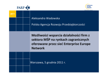 2011 2009 Aleksandra Wadowska Polska Agencja Rozwoju Przedsiębiorczości Możliwości wsparcia działalności firm z sektora MŚP na rynkach zagranicznych oferowane przez sieć Enterprise Europe Network Warszawa, 5 grudnia 2011 r. Działania PARP na rzecz rozwoju eksportu i nawiązywania zagranicznych kontaktów kooperacyjnych dofinansowanie rozwoju eksportu („Paszport do eksportu”), kojarzenie partnerów biznesowych, działalność szkoleniowa, działalność wydawnicza. Podwójna rola Departamentu Promocji Gospodarczej departament odpowiedzialny za działania informacyjne i kooperacyjne w ramach Polskiej Agencji Rozwoju Przedsiębiorczości, ośrodek sieci Komisji Europejskiej – Enterprise Europe Network. Enterprise Europe Network – kim jesteśmy? Około 600 organizacji, w tym izby handlowe, regionalne agencje rozwoju i uniwersyteckie ośrodki rozwoju, Działalność w 50 krajach: Europa, Afryka, Ameryka Pn. i Płd., Azja, Bliski Wschód, Doświadczenie dwóch poprzednio działających na rzecz MŚP sieci: Euro Info Centre i Innovation Relay Centre, Bezpłatne usługi. www.enterprise-europe-network.ec.europa.eu Usługi dostarczane przez Enterprise Europe Network 1/2 działania informacyjne i doradcze: prawo polskie i unijne, prowadzenie działalności gospodarczej za granicą, możliwe źródła finansowania dla sektora MSP, wskazywanie źródeł informacji europejskiej, szkolenia – cykl „Europejskie Przedsiębiorstwo”. Usługi dostarczane przez Enterprise Europe Network 2/2 kojarzenie partnerów gospodarczych: organizacja spotkań kooperacyjnych podczas targów branżowych oraz za pośrednictwem Internetu (internetowe giełdy kooperacyjne), organizacja misji gospodarczych, baza ofert kooperacyjnych, działalność wydawnicza: Biuletyn Euro Info, publikacje nt. rynków zagranicznych. Giełdy kooperacyjne i misje handlowe Giełda kooperacyjna: bilateralne spotkania firm z danego sektora • rejestracja i wybór partnerów do rozmów, • harmonogram spotkań, • formuła stolików, • najczęściej przy okazji targów i wystaw. Misja handlowa: zorganizowany wyjazd firm z danego sektora • wizyty w siedzibach partnerów, • możliwość poznania sposobów produkcji, organizacji pracy itp., • mogą towarzyszyć wyjazdom na targi, wystawy i giełdy kooperacyjne. Co zyskuje przedsiębiorca? ■ kontakty z wyselekcjonowanymi partnerami handlowymi, ■ pomoc logistyczną i asystę, ■ pomoc lokalnych organizacji okołobiznesowych (partnerów ośrodka EEN), ■ niskie koszty związane z udziałem w imprezach kooperacyjnych. Wysyłaliśmy polskie firmy do… Europy (Belgia, Białoruś, Bułgaria, Czechy, Dania, Finlandia, Francja, Hiszpania, Litwa, Łotwa, Portugalia, RFN, Rosja, Rumunia, Szwecja, Ukraina, Wlk. Brytania, Węgry, Włochy), Azji (Chiny, Izrael, Tajlandia, Uzbekistan). www.mapsorama.com Przykłady projektów kooperacyjnych zrealizowanych w 2011 r. Misja gospodarcza dla firm z branży spożywczej na targi Alimentaria&Horexpo, 27-30 marca 2011 r., Lizbona, Portugalia. Giełda kooperacyjna dla firm z branży ochrony środowiska i OZE, 1113 maja 2011 r., Madryt, Hiszpania. Spotkania biznesowe z firmami belgijskimi z branży ICT i budownictwa, 7 czerwca 2011 r., Warszawa Giełda kooperacyjna na targach ELMIA Subcontractor 2011, 8-9 listopada 2011 r., Jönköping, Szwecja. Międzynarodowe Targi Technologii Ochrony Środowiska Pollutec Horizons, 29 listopada-2 grudnia 2011 r., Paryż, Francja. Planowane imprezy kooperacyjne – rynek hiszpański Giełda kooperacyjna dla firm z branży spożywczej na targi ALIMENTARIA, 26-29 marca 2012 r., Barcelona. Giełda kooperacyjna dla firm z branży ochrony środowiska i OZE, 23-25 maja 2012 r., Madryt. Wymiana ofert kooperacyjnych rejestracja we wspólnej bazie ośrodków Enterprise Europe Network (Business Cooperation Database – BCD), pomoc w opracowaniu ofert, promocja za pośrednictwem ośrodków Sieci w innych krajach, publikacja zagranicznych ofert kooperacyjnych w Biuletynie Euro Info i na stronie www.een.org.pl. Publikacje i strony internetowe www.parp.gov.pl • przewodniki po zagranicznych rynkach www.een.org.pl • informacja o targach i misjach • informacja o seminariach i szkoleniach • wyszukiwarka ofert kooperacyjnych Wydział Promocji Handlu i Inwestycji w Madrycie http://madrid.trade.gov.pl Dziękuję za uwagę! Aleksandra Wadowska Polska Agencja Rozwoju Przedsiębiorczości Pańska 81/83 00-834 Warszawa Tel. +48 22 432 83 75 Fax. +48 22 432 70 46 [email protected] www.parp.gov.pl www.een.org.pl