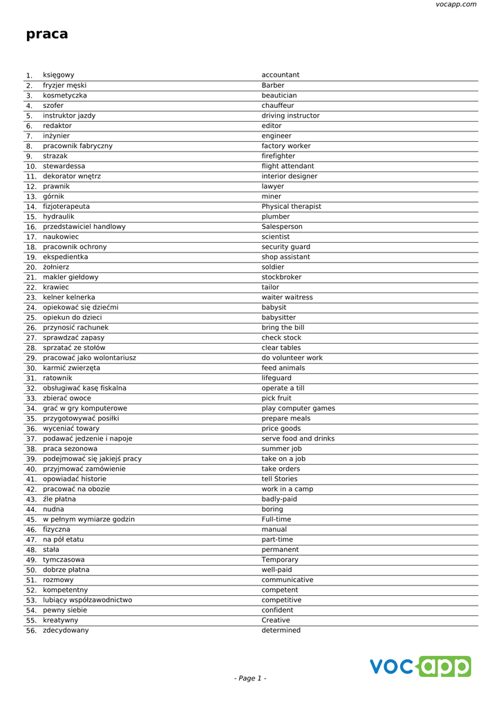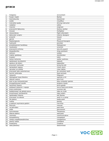 vocapp.com praca 1. 2. 3. 4. 5. 6. 7. 8. 9. 10. 11. 12. 13. 14. 15. 16. 17. 18. 19. 20. 21. 22. 23. 24. 25. 26. 27. 28. 29. 30. 31. 32. 33. 34. 35. 36. 37. 38. 39. 40. 41. 42. 43. 44. 45. 46. 47. 48. 49. 50. 51. 52. 53. 54. 55. 56. księgowy accountant fryzjer męski kosmetyczka szofer instruktor jazdy redaktor inżynier pracownik fabryczny strazak stewardessa dekorator wnętrz prawnik górnik fizjoterapeuta hydraulik przedstawiciel handlowy naukowiec pracownik ochrony ekspedientka żołnierz makler giełdowy krawiec kelner kelnerka opiekować się dziećmi opiekun do dzieci przynosić rachunek sprawdzać zapasy sprzatać ze stołów pracować jako wolontariusz karmić zwierzęta ratownik obsługiwać kasę fiskalna zbierać owoce grać w gry komputerowe przygotowywać posiłki wyceniać towary podawać jedzenie i napoje praca sezonowa podejmować się jakiejś pracy przyjmować zamówienie opowiadać historie pracować na obozie źle płatna nudna w pełnym wymiarze godzin fizyczna na pół etatu stała tymczasowa dobrze płatna rozmowy kompetentny lubiący współzawodnictwo pewny siebie kreatywny zdecydowany Barber beautician chauffeur driving instructor editor engineer factory worker firefighter flight attendant interior designer lawyer miner Physical therapist plumber Salesperson scientist security guard shop assistant soldier stockbroker tailor waiter waitress babysit babysitter bring the bill check stock clear tables do volunteer work feed animals lifeguard operate a till pick fruit play computer games prepare meals price goods serve food and drinks summer job take on a job take orders tell Stories work in a camp badly-paid boring Full-time manual part-time permanent Temporary well-paid communicative competent competitive confident Creative determined - Page 1 - vocapp.com 57. hojny 58. otwarty 59. cierpliwy 60. profesjonalny 61. odpowiedzialny 62. towarzyski 63. utalentowany 64. starać się o pracę stanowisko 65. dostać propozycje pracy 66. kandydat 67. uzupełnić podanie o pracę 68. list motywacyjny 69. życiorys 70. zapisać się na kurs 71. zdobywać doświadczenie 72. doświadczenie zawodowe 73. mieć dyplom wykształcenie 74. mieć odpowiednie szkolenie 75. mieć wyższe wykształcenie 76. rozmowa kwalifikacyjna 77. przyjść na rozmowę kwalifikacyjną 78. osoba przeprowadzająca rozmowę 79. ogłoszenie o pracę 80. podanie o pracę 81. biuro pośrednictwa 82. oferta pracy 83. przyjąć ofertę pracy 84. odrzucić ofertę pracy 85. szukać pracy 86. kwalifikacje 87. referencje 88. podpisywać umowę 89. umiejętności komunikacyjne 90. znajomość obsługi komputera 91. prowadzić własną firmę 92. szef 93. kolega 94. korporacja 95. obowiązek 96. zarabiać 97. pracownik 98. pracodawca 99. rynek pracy 100. zadowolenie z pracy 101. zawód 102. płaca 103. stanowisko 104. zawod 105. rzucać 106. rezygnować 107. prowadzić firmę 108. pensja 109. szkolenie 110. zapłata tygodniowa 111. praca fiz lub um 112. godziny pracy 113. miejsce pracy generous outgoing patient professional responsible Sociable talented apply for a job position be offered a job candidate complete an application form Covering Letter curriculum vitae enrol on a course get experience work experience have a diploma degree in sth have special training have a university education interview come for an interview interviewer job advert job application job centre Job offer accept a job offer turn down a job offer look for a job qualifications references sign a contract communication skills computing skills be self-employed boss colleague corporation duty earn employee employer job market job satisfaction occupation pay position profession quit resign Run a Business salary training wages work working hours workplace - Page 2 - Powered by TCPDF (www.tcpdf.org)