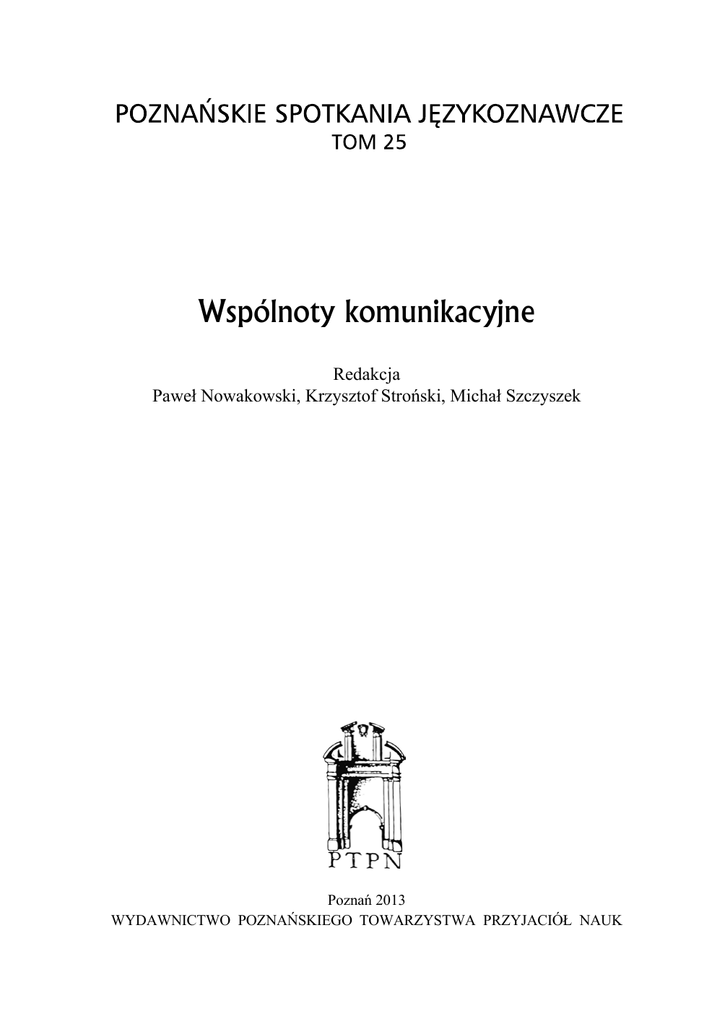 Wspólnoty komunikacyjne Redakcja Paweł Nowakowski, Krzysztof Stroński, Michał Szczyszek Poznań 2013 WYDAWNICTWO PoznańskieGO TowarzystwA Przyjaciół Nauk Spis treści Słowo od redaktorów........................................................................................ 7 Ludwika Zabrockiego teorie języka Bogdan Walczak Haaga – Żirmunskiego – Zabrockiego teoria zmian fonetycznych.............................. 11 Józef Marcinkiewicz Teoria wspólnot komunikatywnych w świetle koncepcji kognitywnych w psychologii i językoznawstwie.............................................................................................. 19 Wspólnoty komunikacyjne Mirosława Sagan-Bielawa Wspólnota komunikacyjna na ziemiach polskich po odzyskaniu niepodległości w 1918 roku................................................................................................... 39 Michał Szczyszek Słowotwórcze przejawy wspólnoty komunikacyjnej (na przykładzie języka polskiego)... 47 Bożena Niećko-Bukowska Modyfikacje zakresów odpowiedzialności w ramach wybranych wspólnot komunikacyjnych............................................................................................................... 55 Wspólnoty komunikacyjne a tożsamość kulturowa Natalia Długosz Uwagi o języku gorańskim (tożsamość języka w aspekcie typologicznym).................... 69 Paulina Wandas Język jako wyznacznik tożsamości jednostki........................................................... 85 Katarzyna Tomalak Portugalskie pieśni fado jako nośnik tożsamości kulturowej....................................... 97 Językowa komunikacja interkulturowa Antoni Markunas Język rosyjski w zmieniającym się interkulturowym obszarze europejskim.................... 109 Anna Kośmider-Leal Wpływ czynników kulturowych na kształtowanie się tożsamości nowego pokolenia obywateli Europy (na przykładzie Polski i Portugalii)............................................... 121 Iwona Osmańska-Lipka In the idiomatic world of animals – idiom comprehension in a foreign language.......... 131 Agnieszka Nowicka Intersubiektywność w komunikacji w języku angielskim jako lingua franca.................... 143